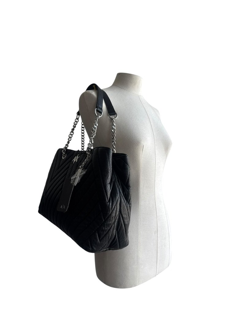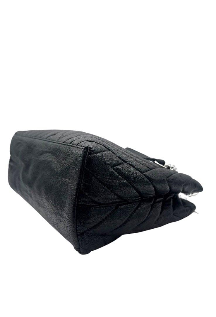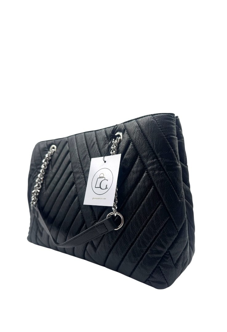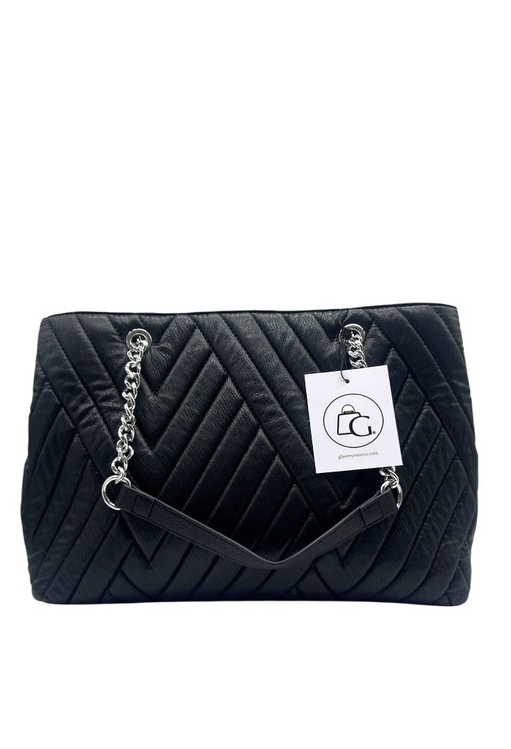 Mochila elaborada en lona estilo acolchonado, con herrajes en plata, detalle de cadena en el asa, compartimento interno con zipper.
