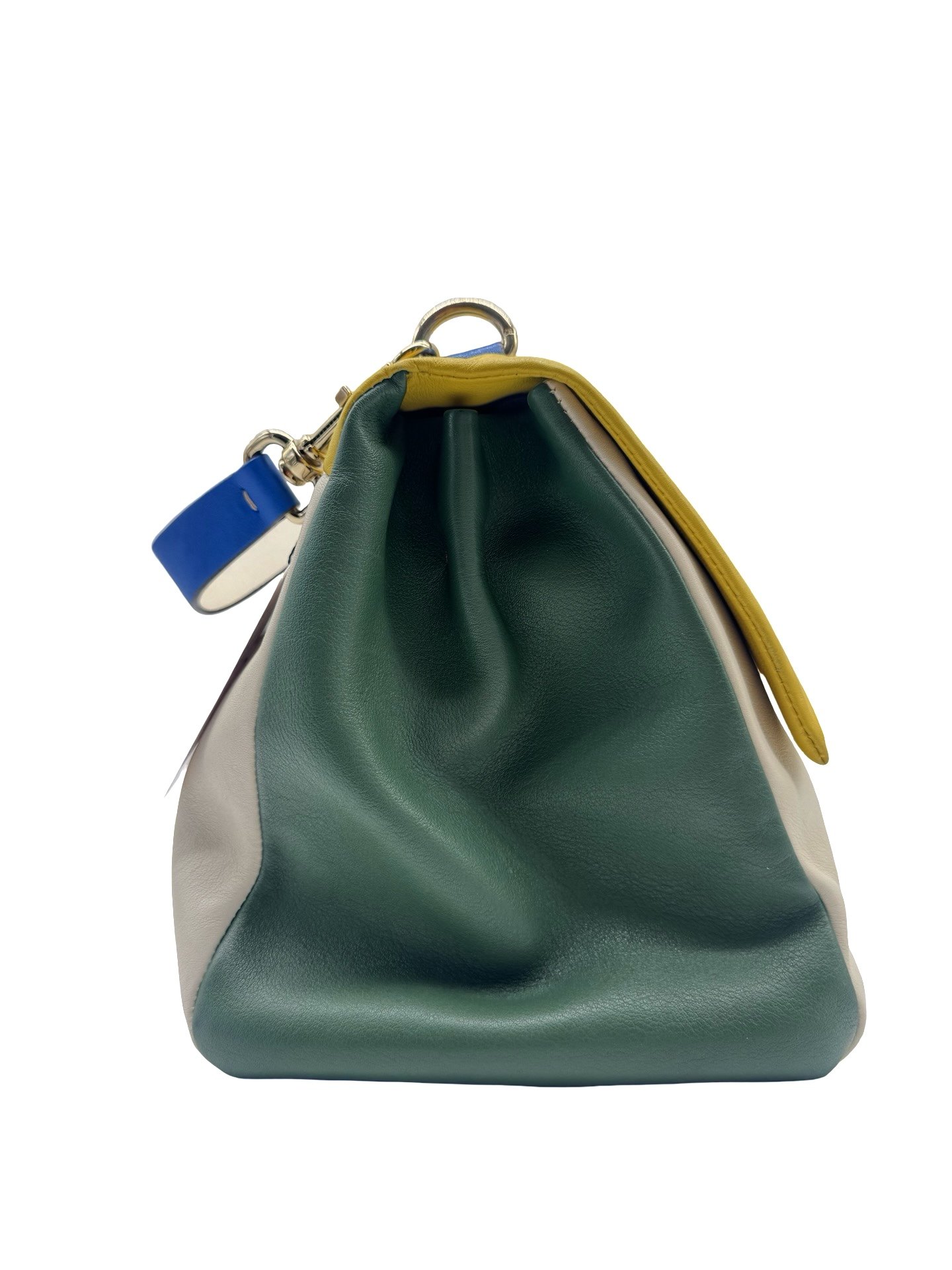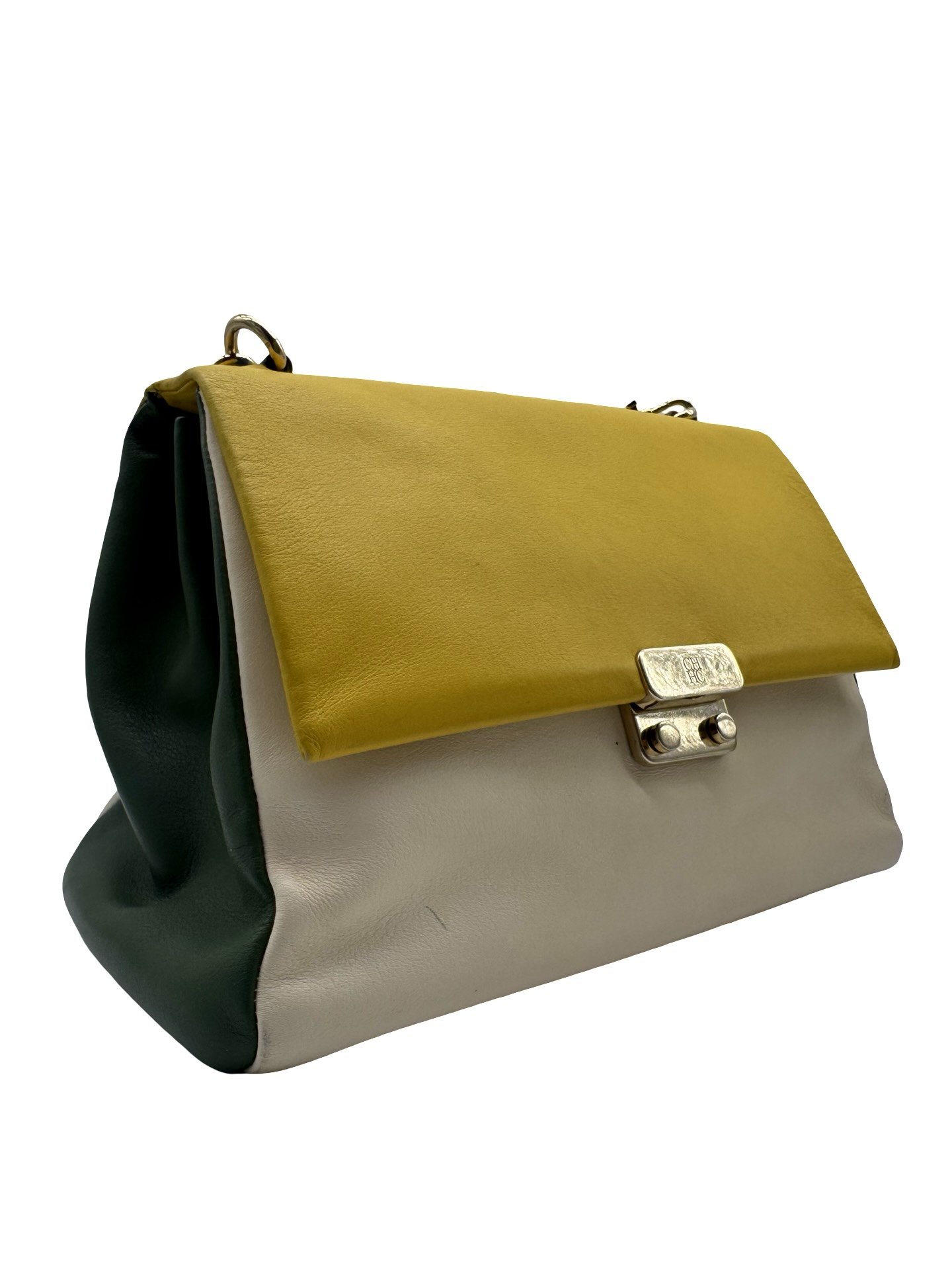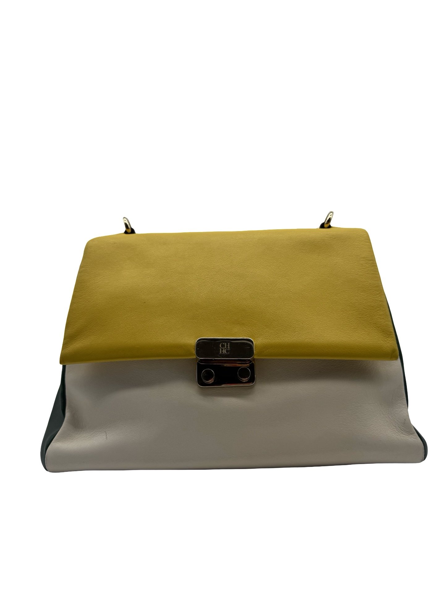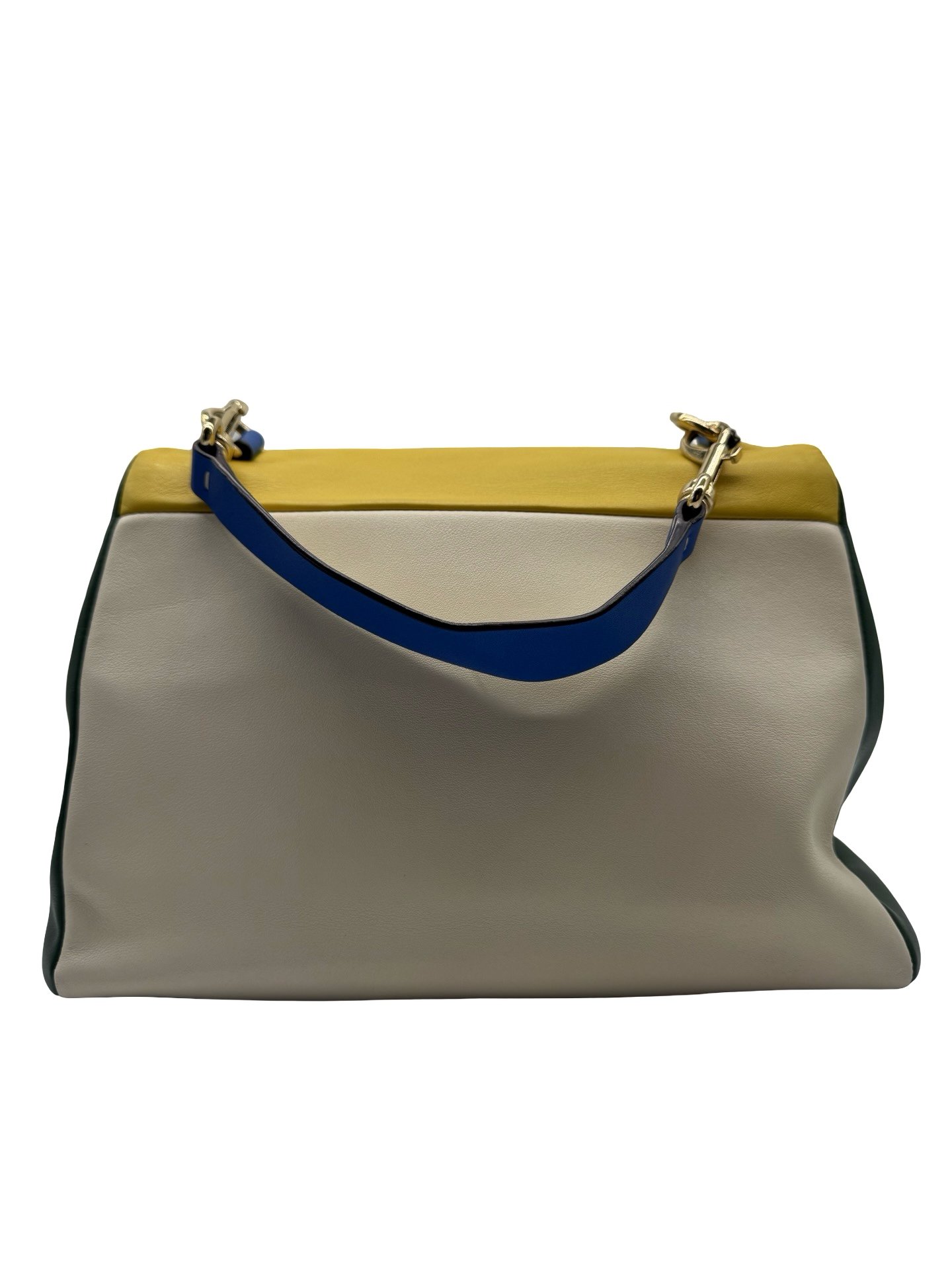 Bolsa tote elaborada en piel, herrajes en dorado, cierre en solapa con broche a presión.
