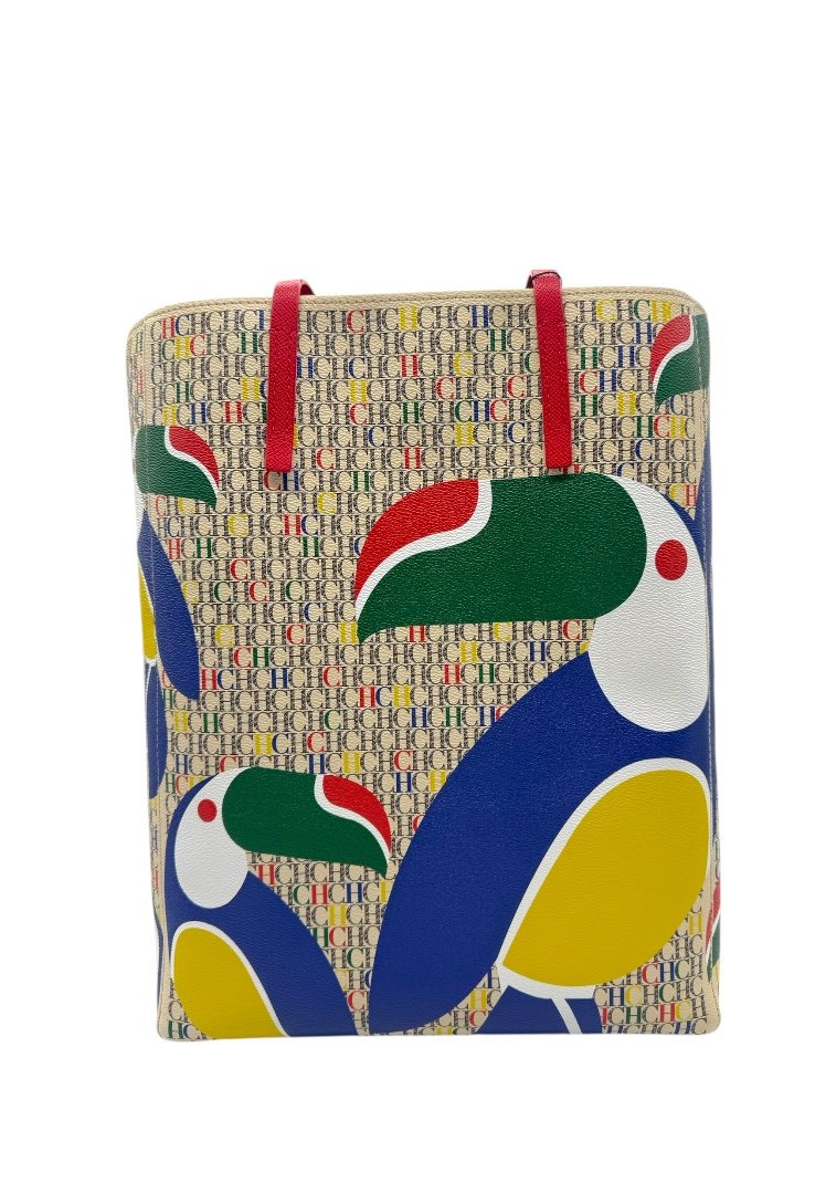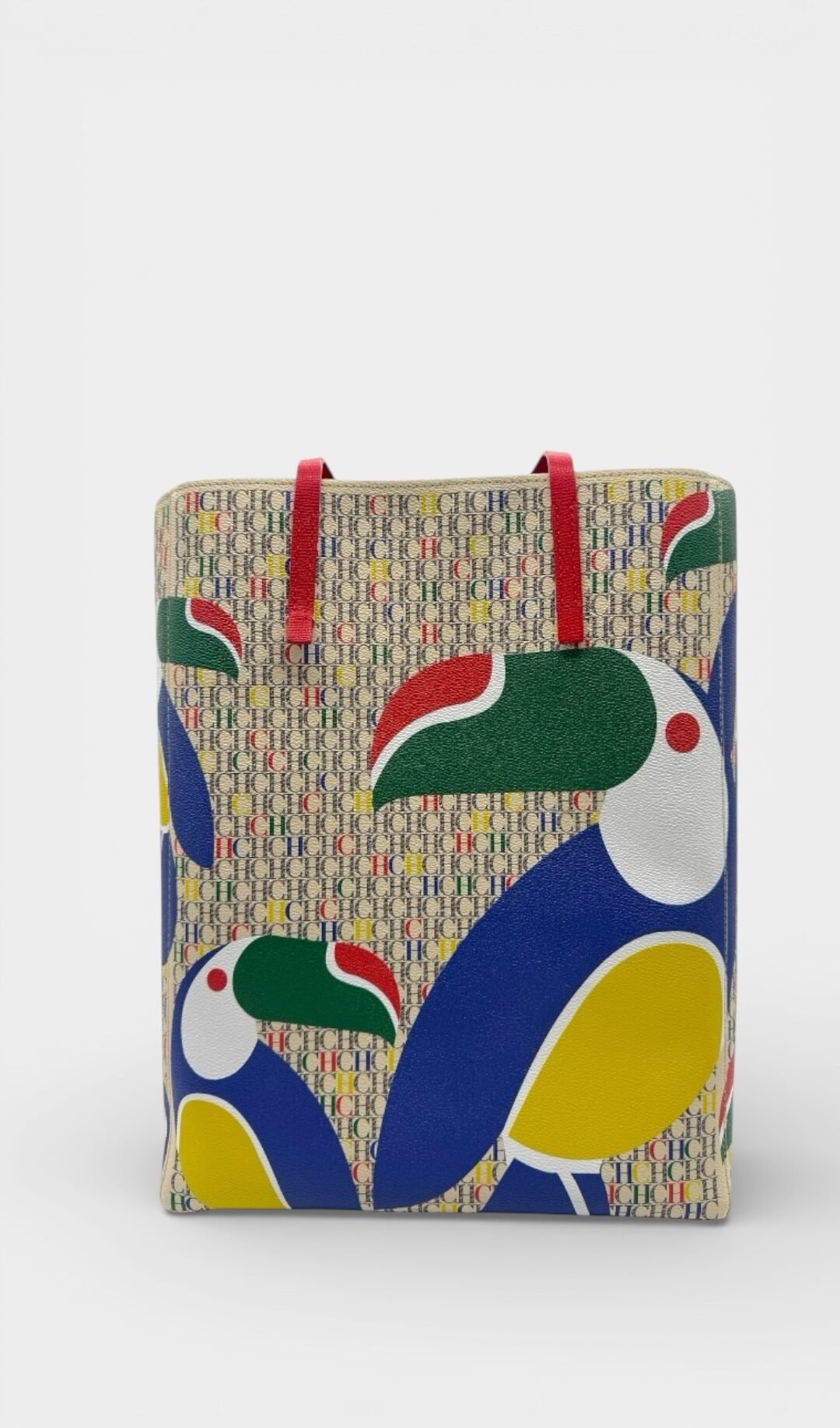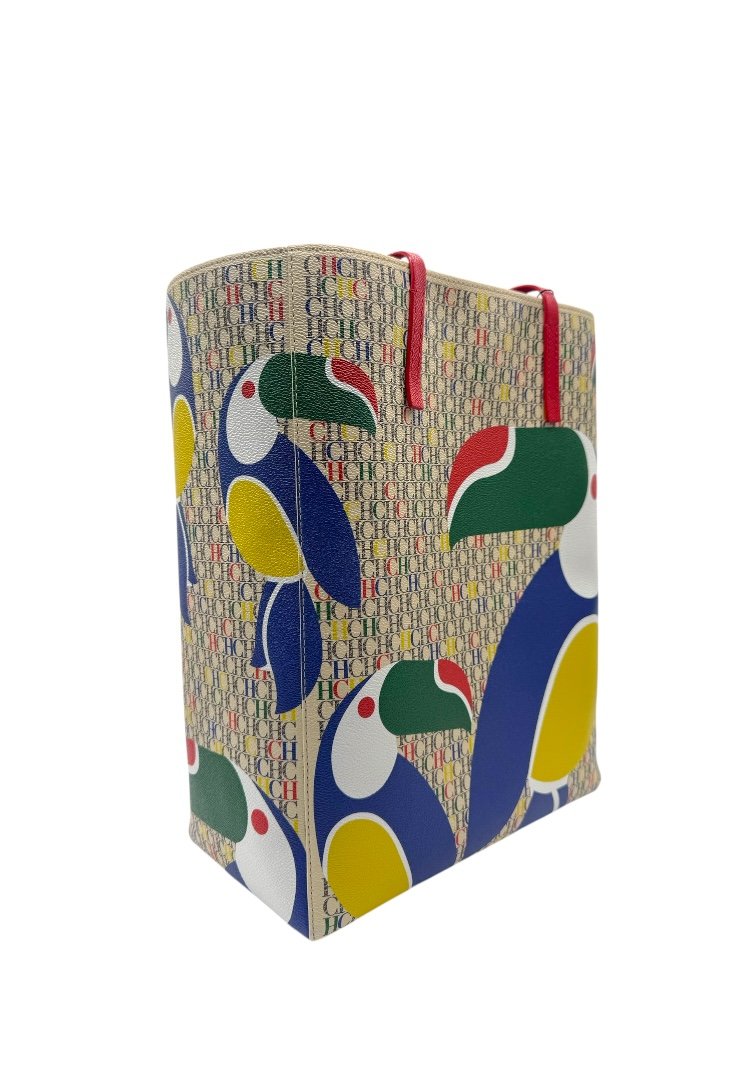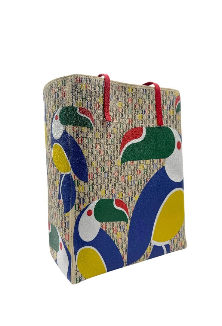 Bolso tote elaborado en lona, con diseño monogram, con estampado de tucanes.