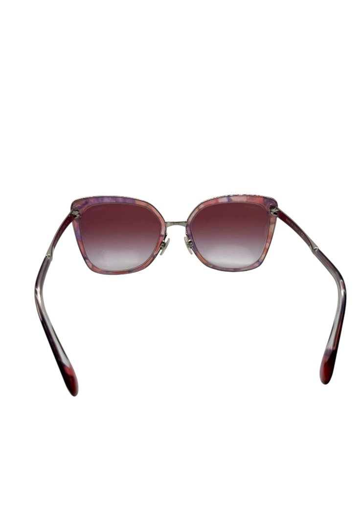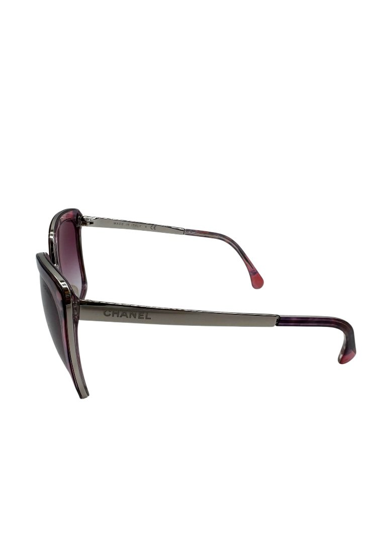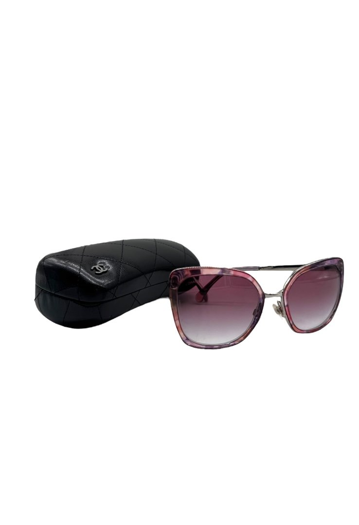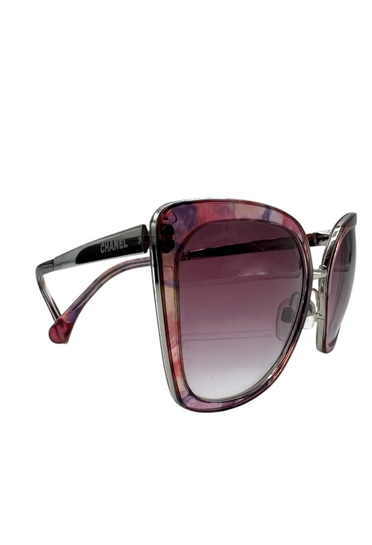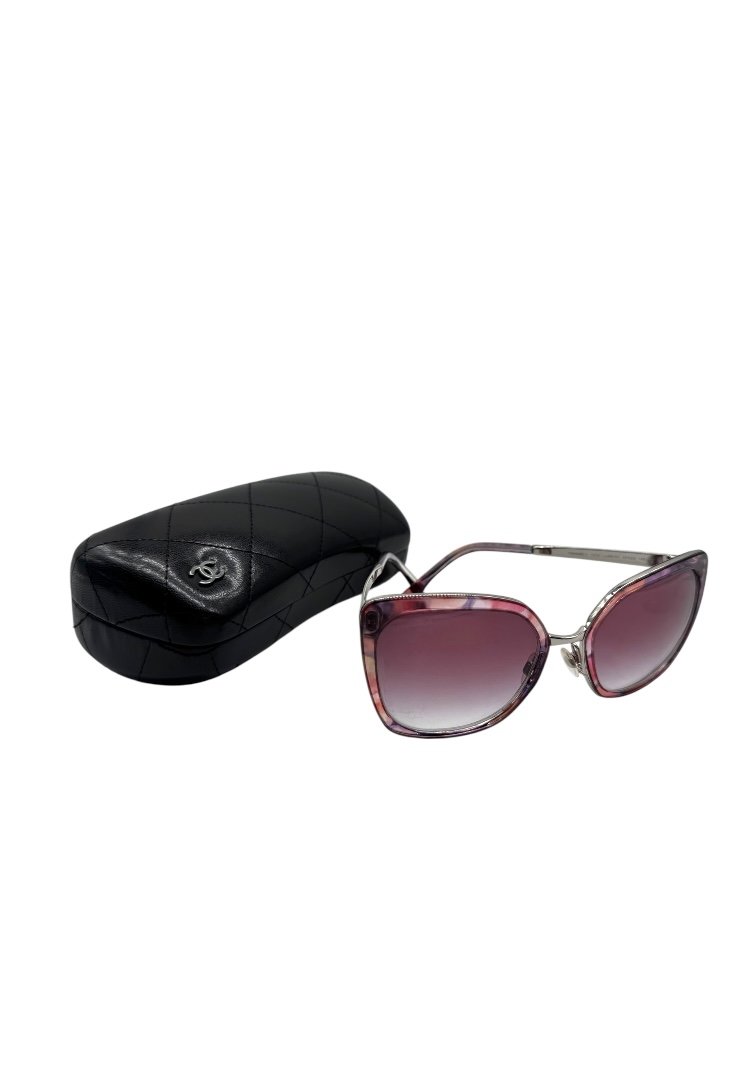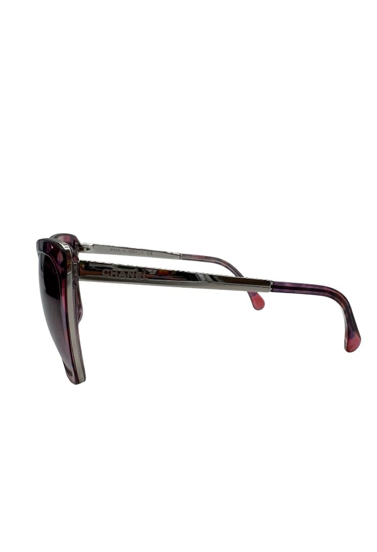 Lentes de sol con armazón de acetato, con patas metalicas, micas en morado.