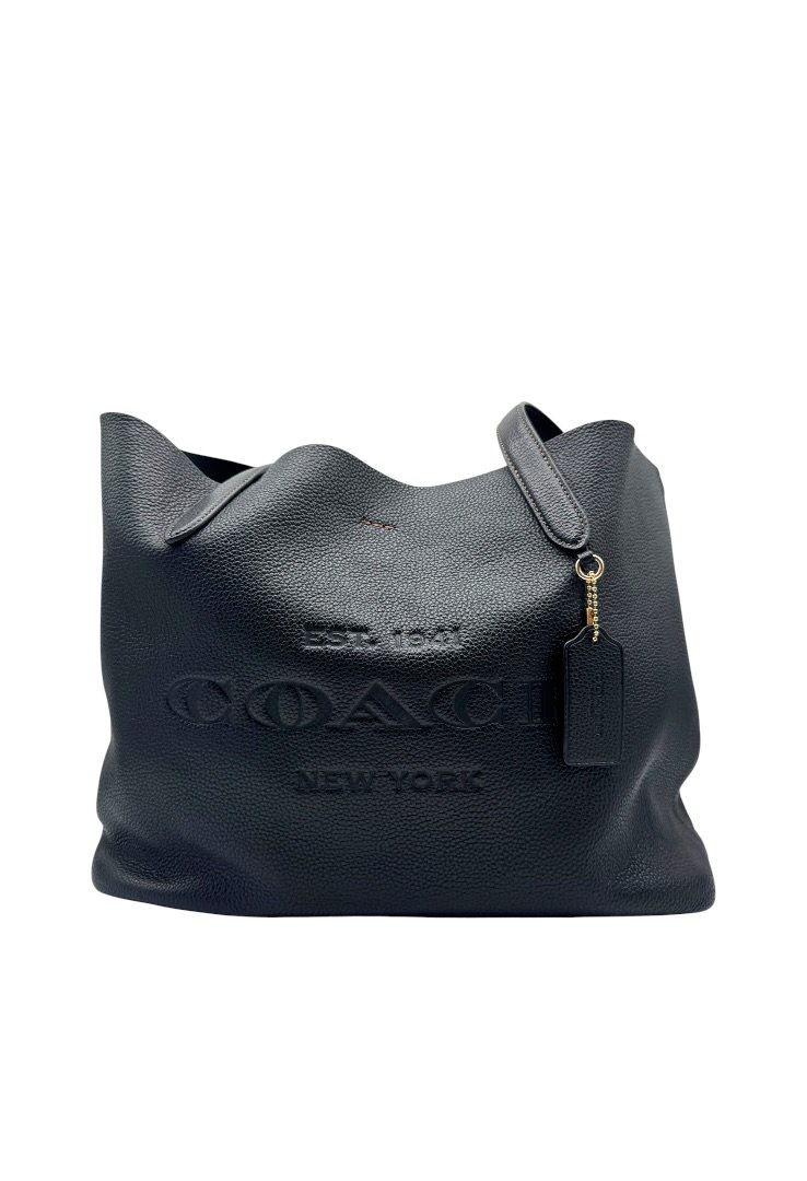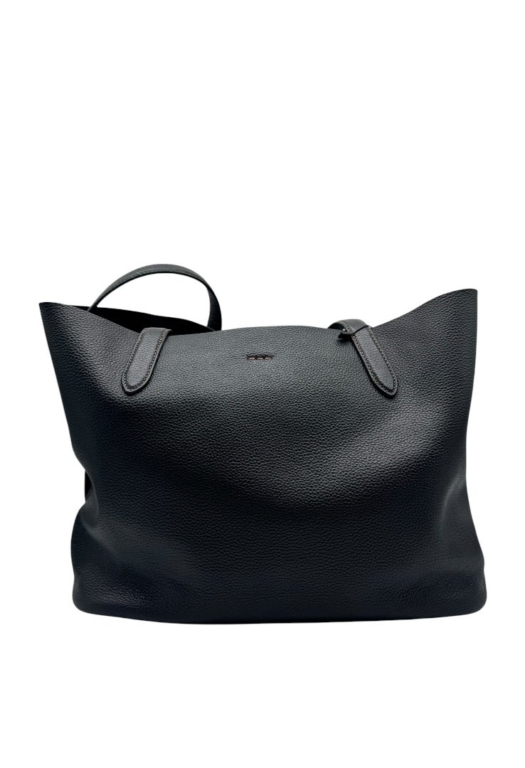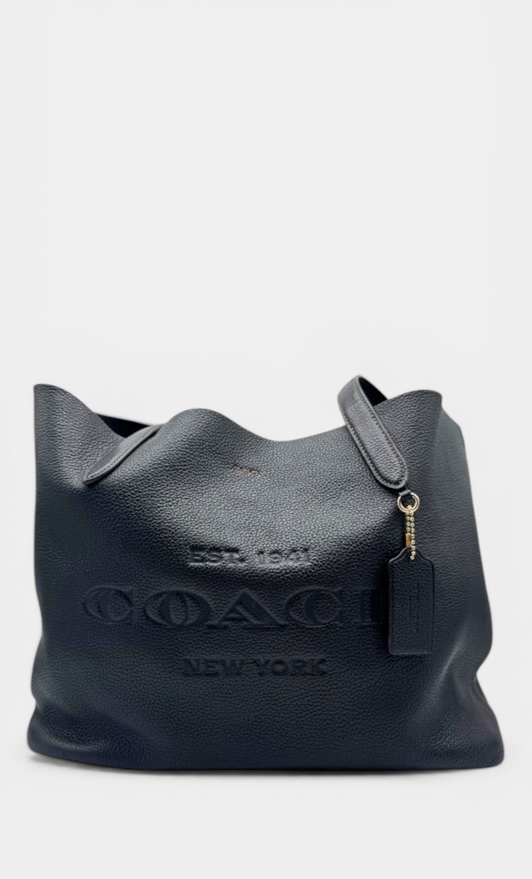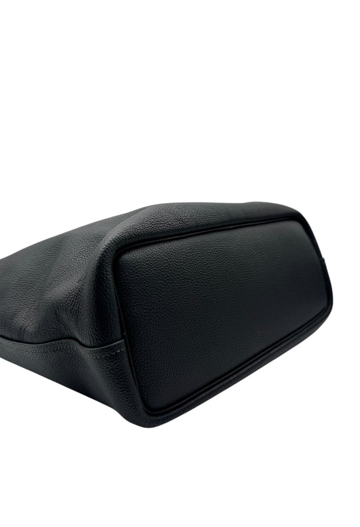 Bolsa elaborada en piel granulada, marca y detalles en relieve, herrajes en dorados.