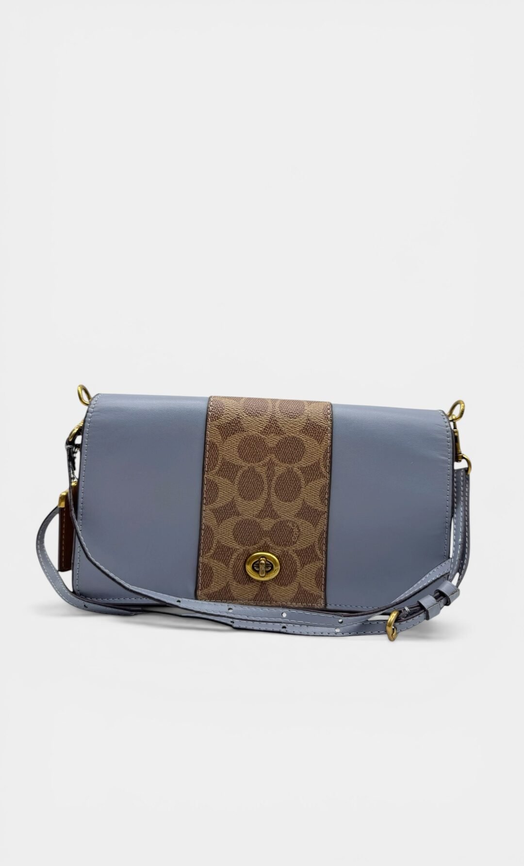 Bolsa elaborada en cuero y lona con diseño monogram, herrajes en dorado, cierre en solapa con broche.