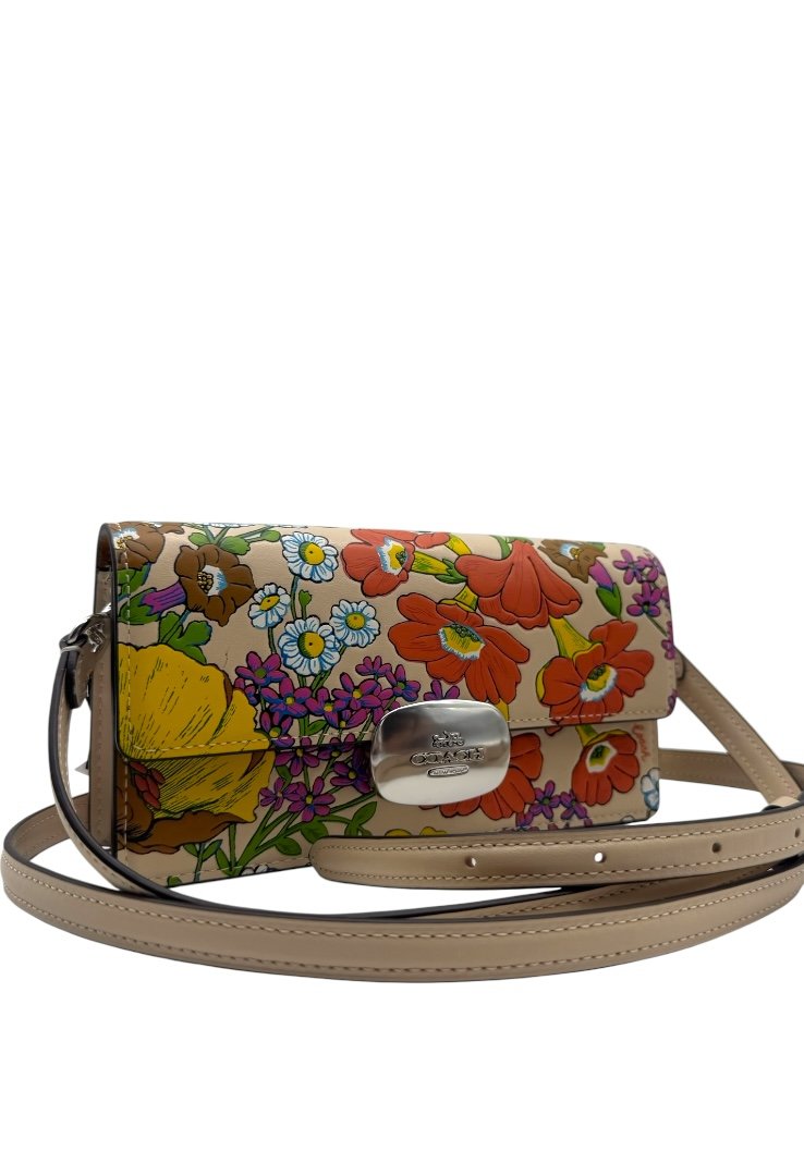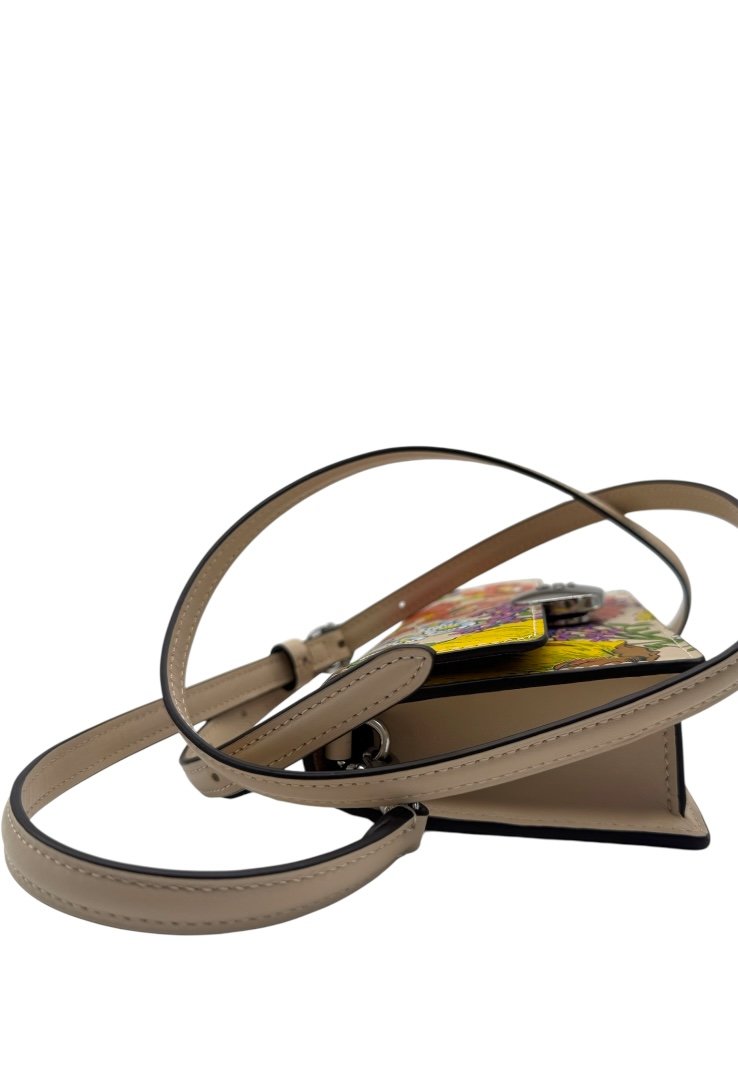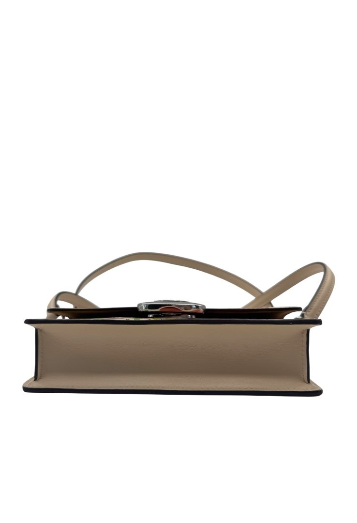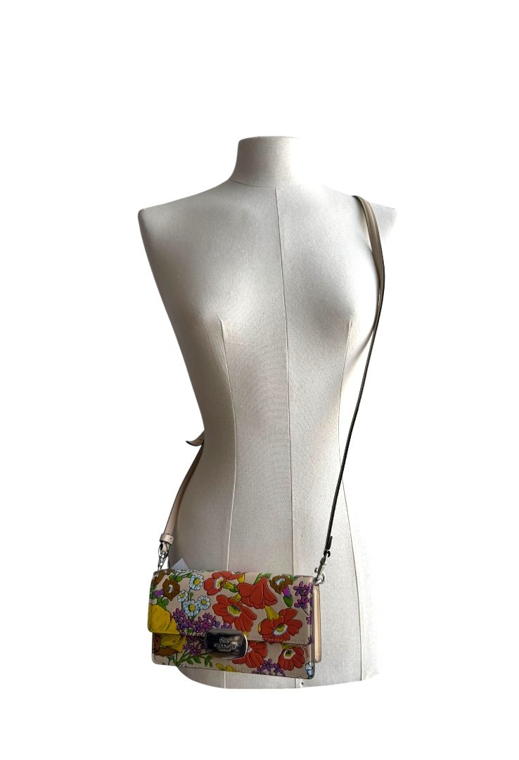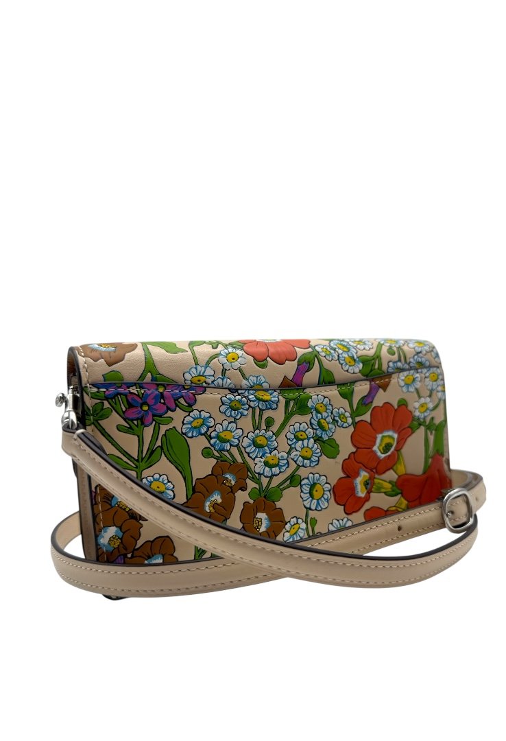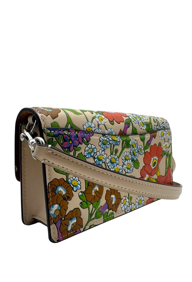 Elaborada en piel, bandolera pequeña con cierre de solapa con estampado floral, bolsillo en la parte tracera, cierre magnetico y placo en plateado con el logo de la marca