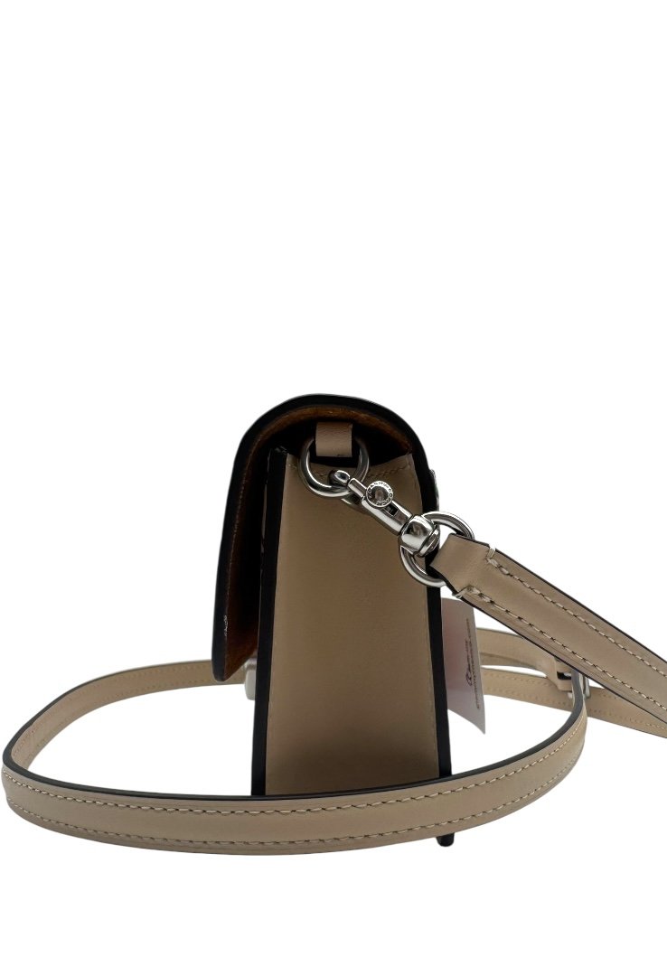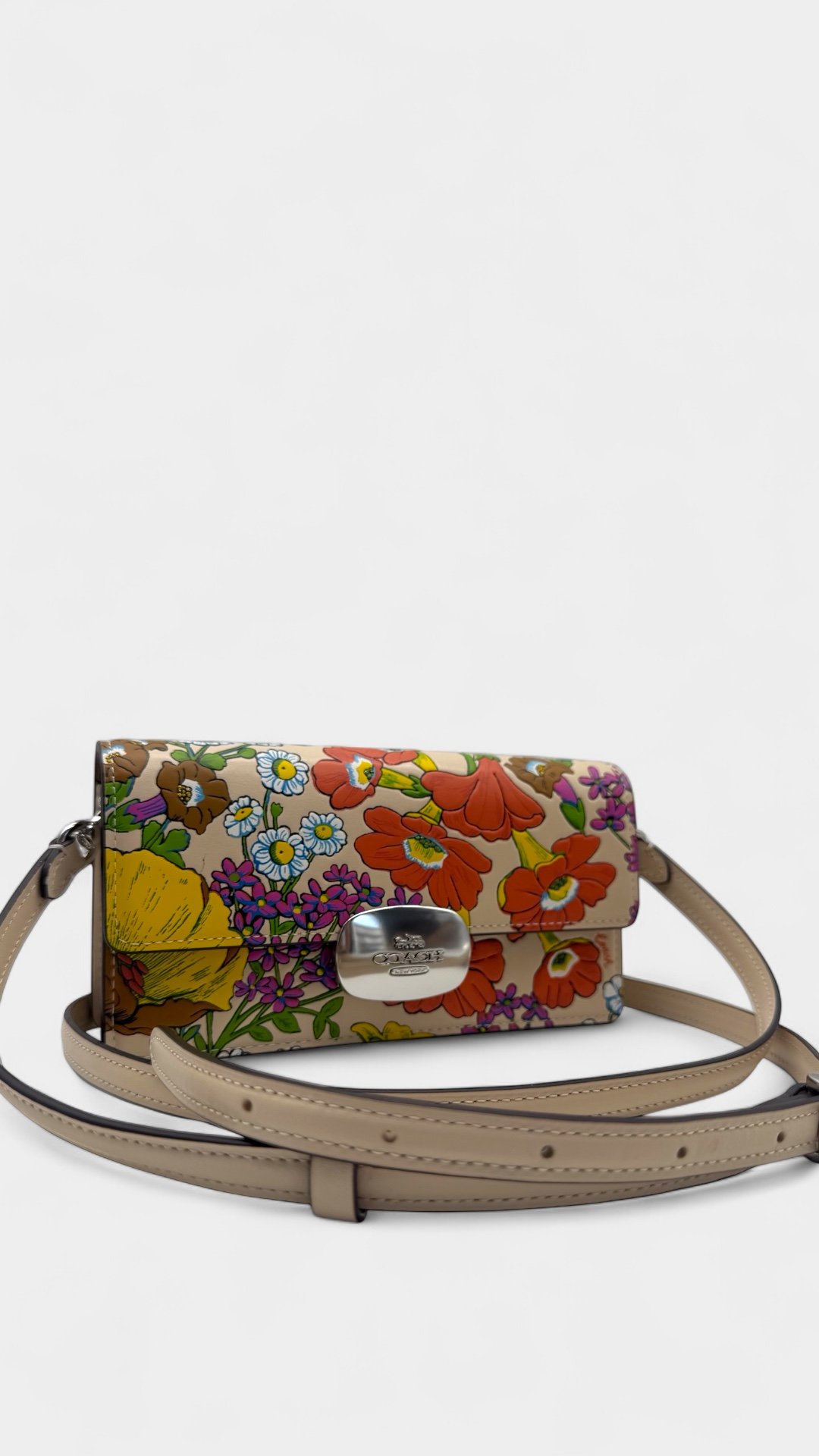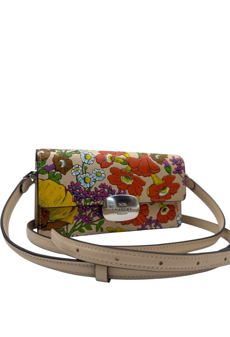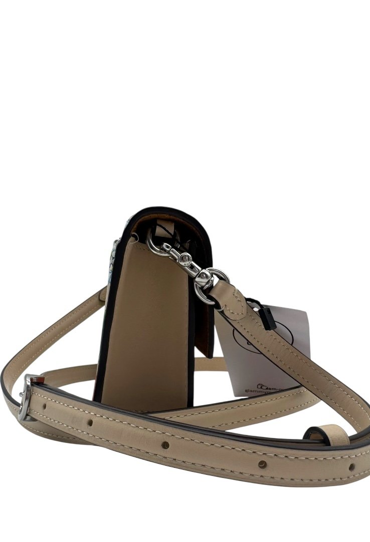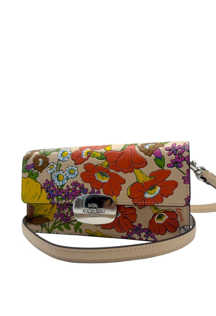Elaborada en piel, bandolera pequeña con cierre de solapa con estampado floral, bolsillo en la parte tracera, cierre magnetico y placo en plateado con el logo de la marca