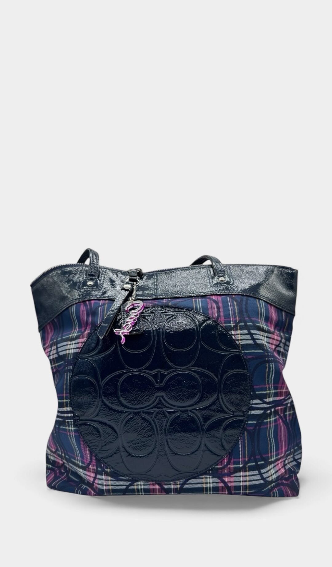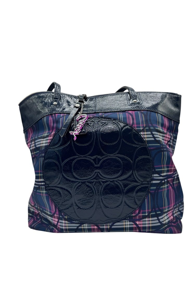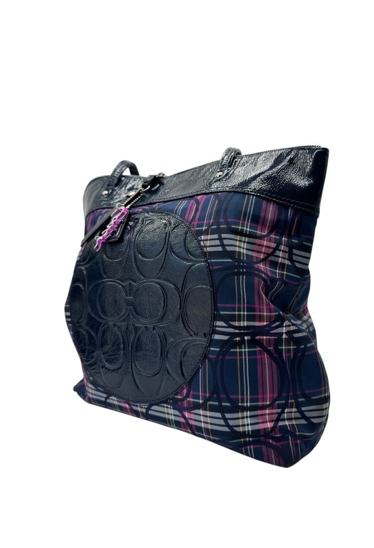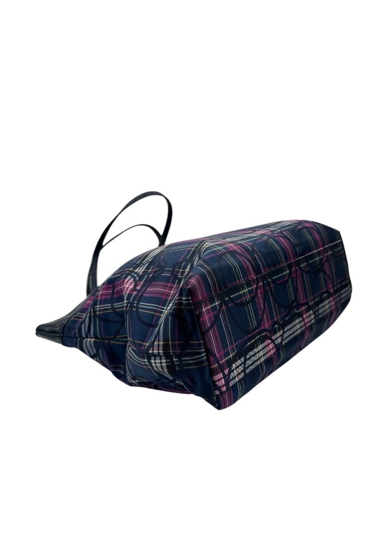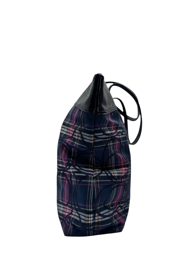 Bolsa elaborado en lona con diseño de cuadros, detalle en cuero con diseño monogram, apliques en plata, cierre en cremallera.