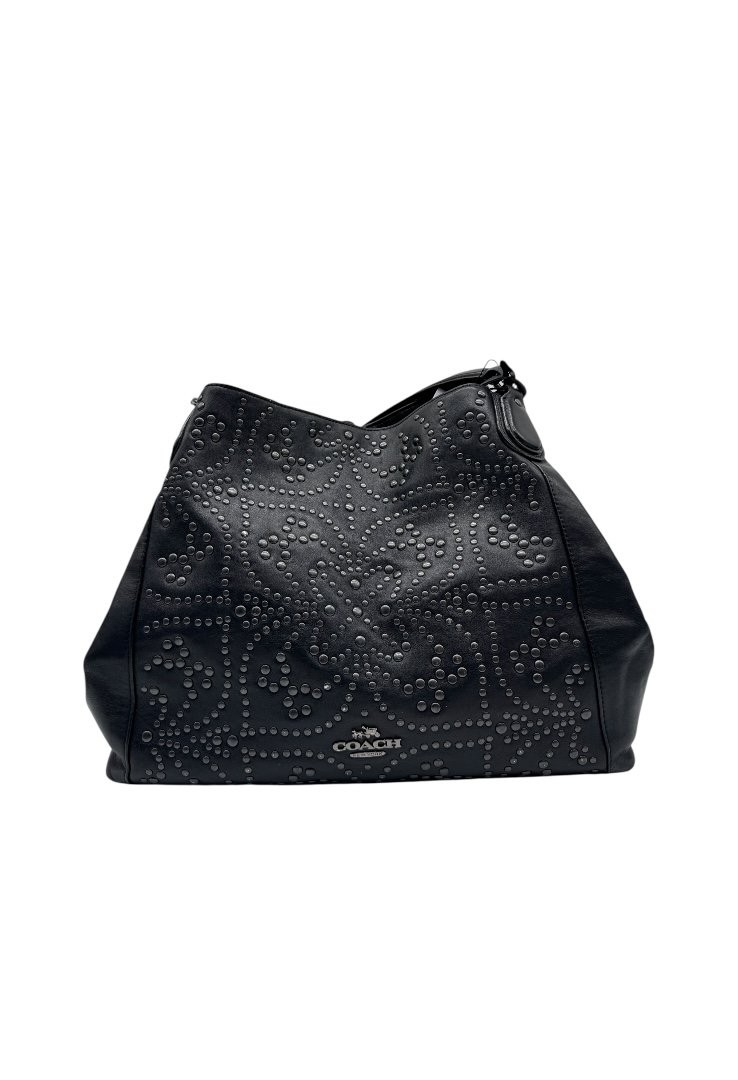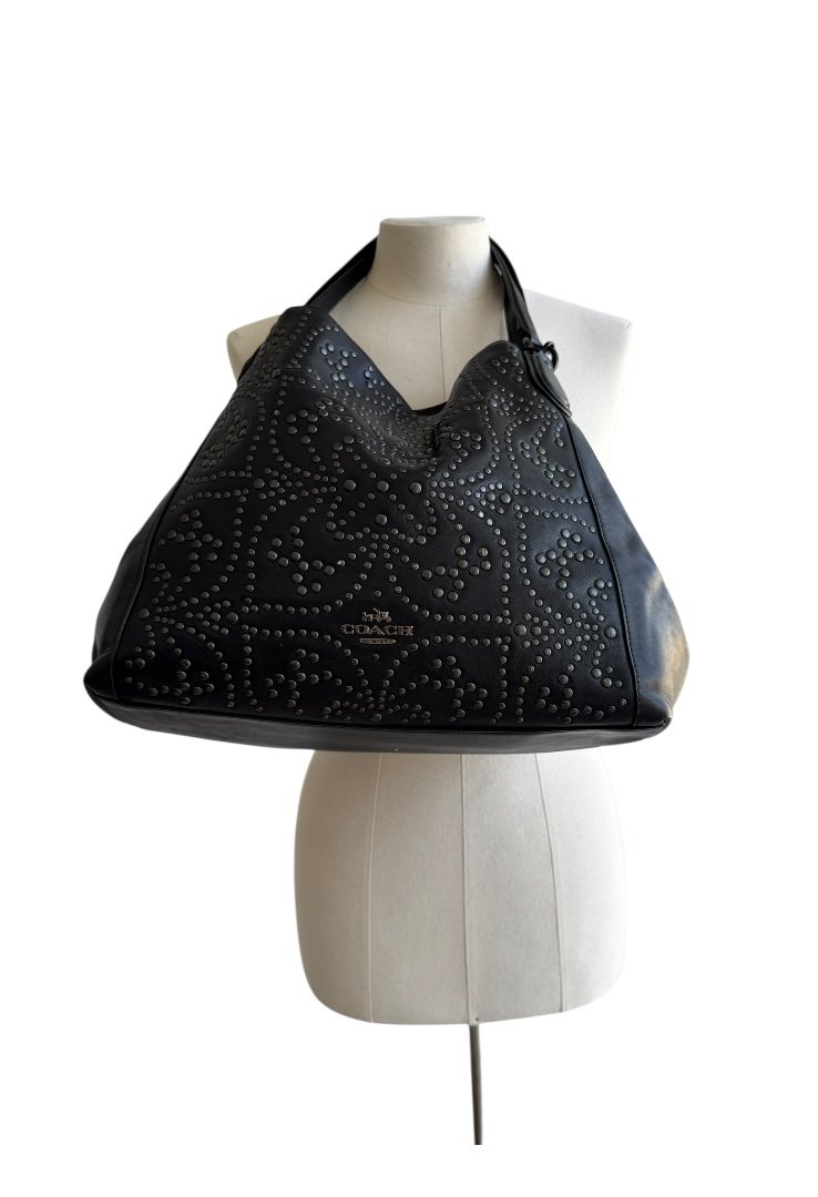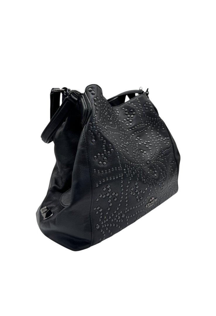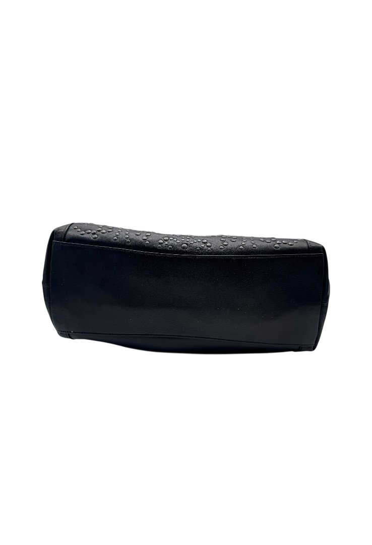 Bolso confeccionado en piel, diseño simétrico de estoperoles, apliques en plata, cierre con botón magnético.