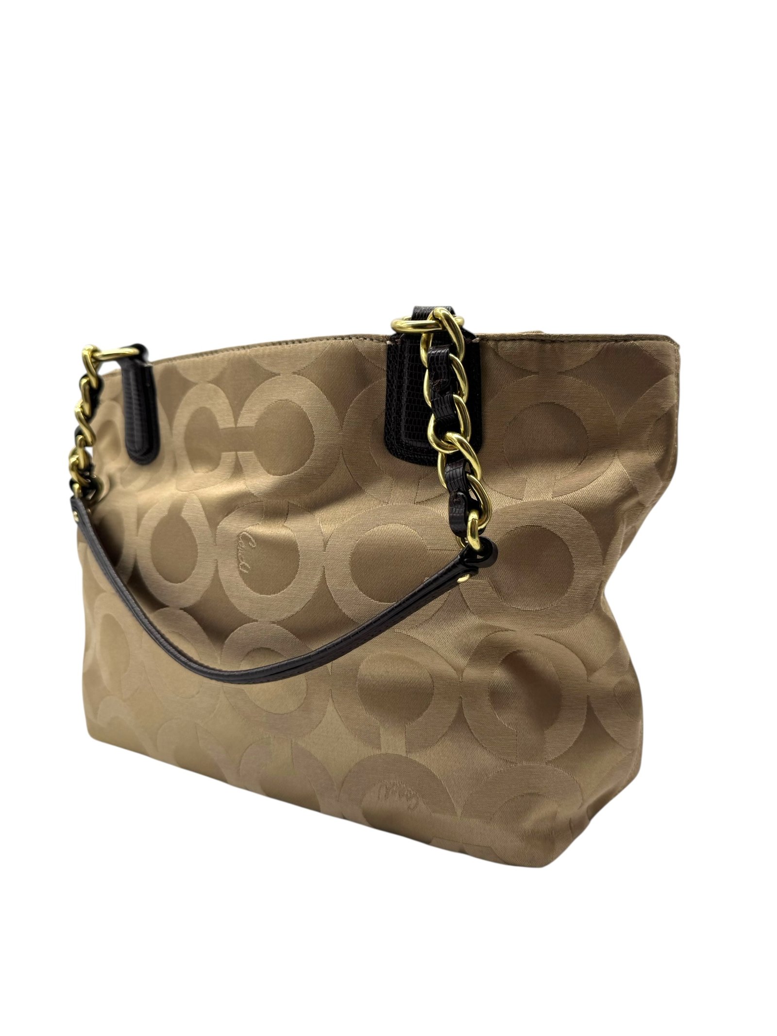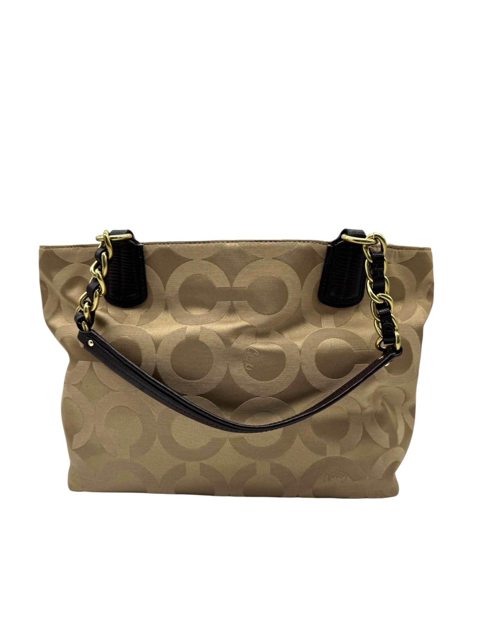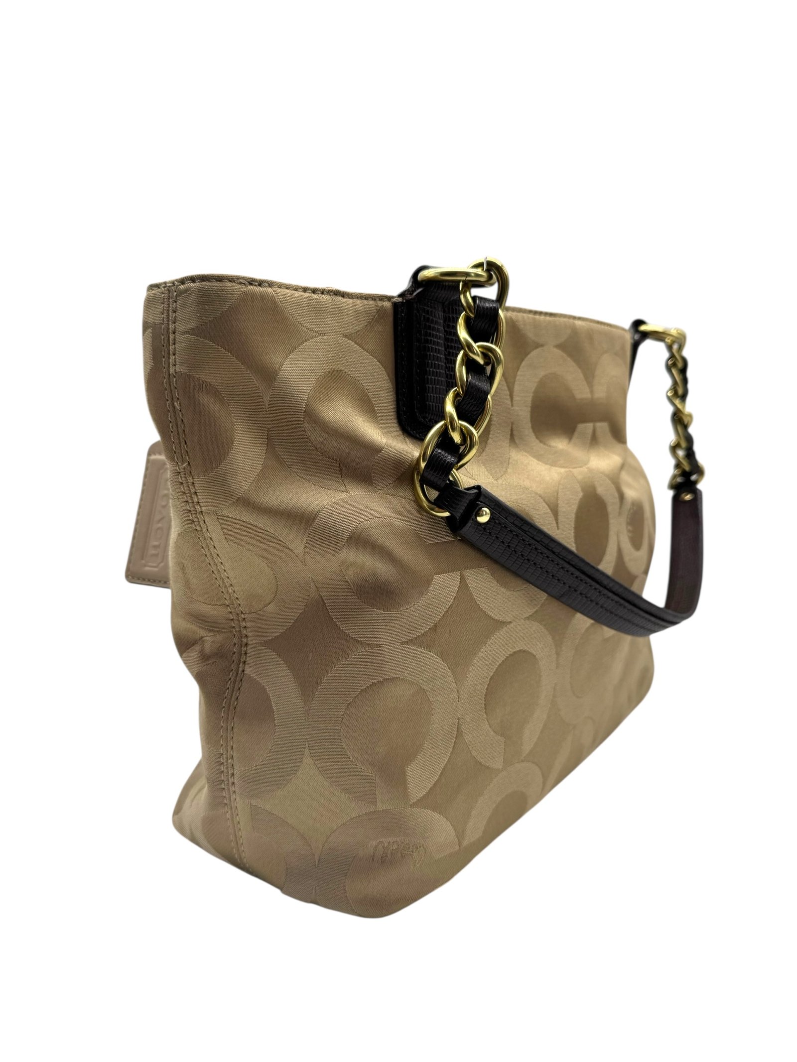 Bolsa elaborada en textil con diseño monogram, apliques en dorado, asas con cuero, compartimento principal con zipper.