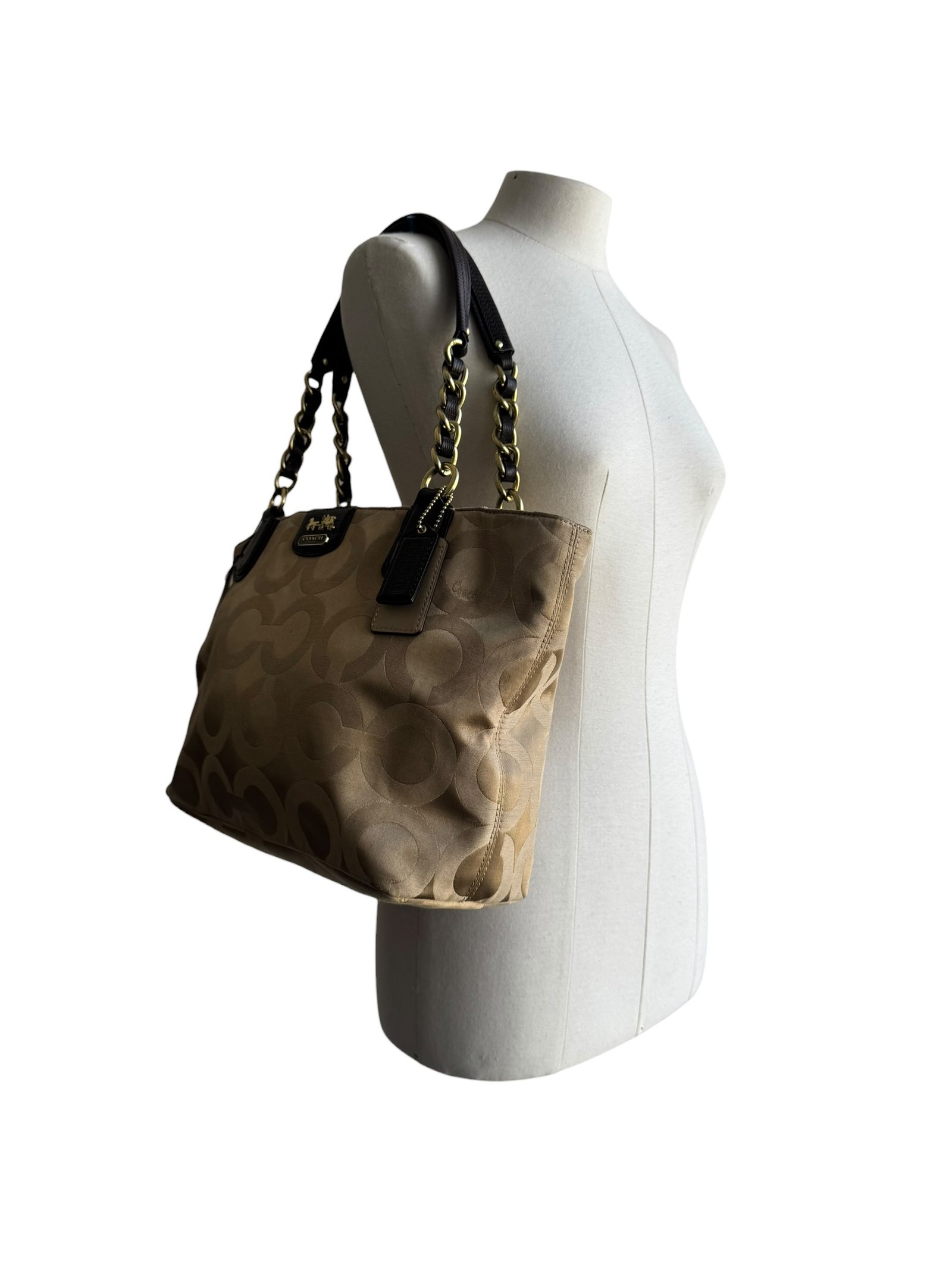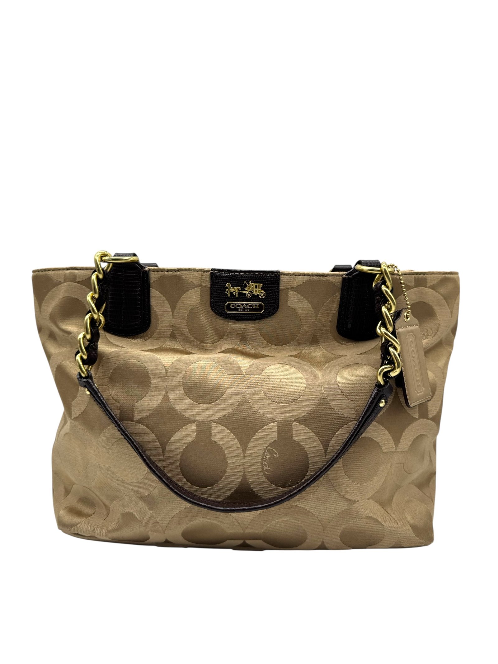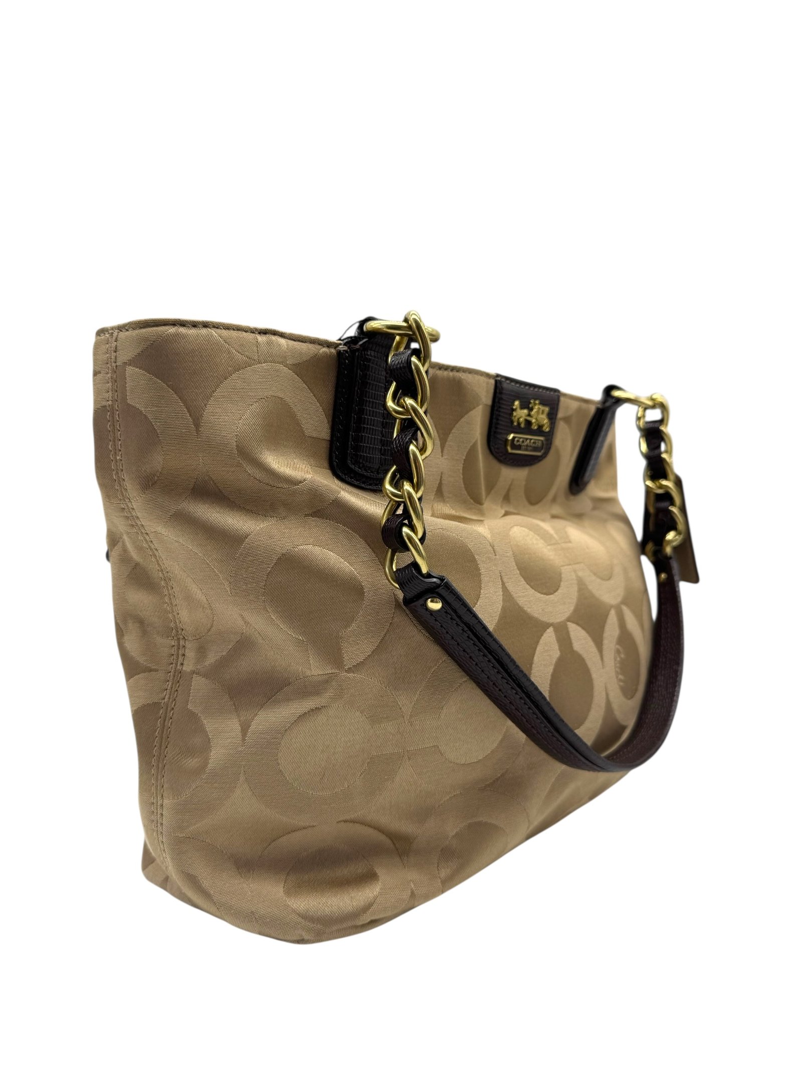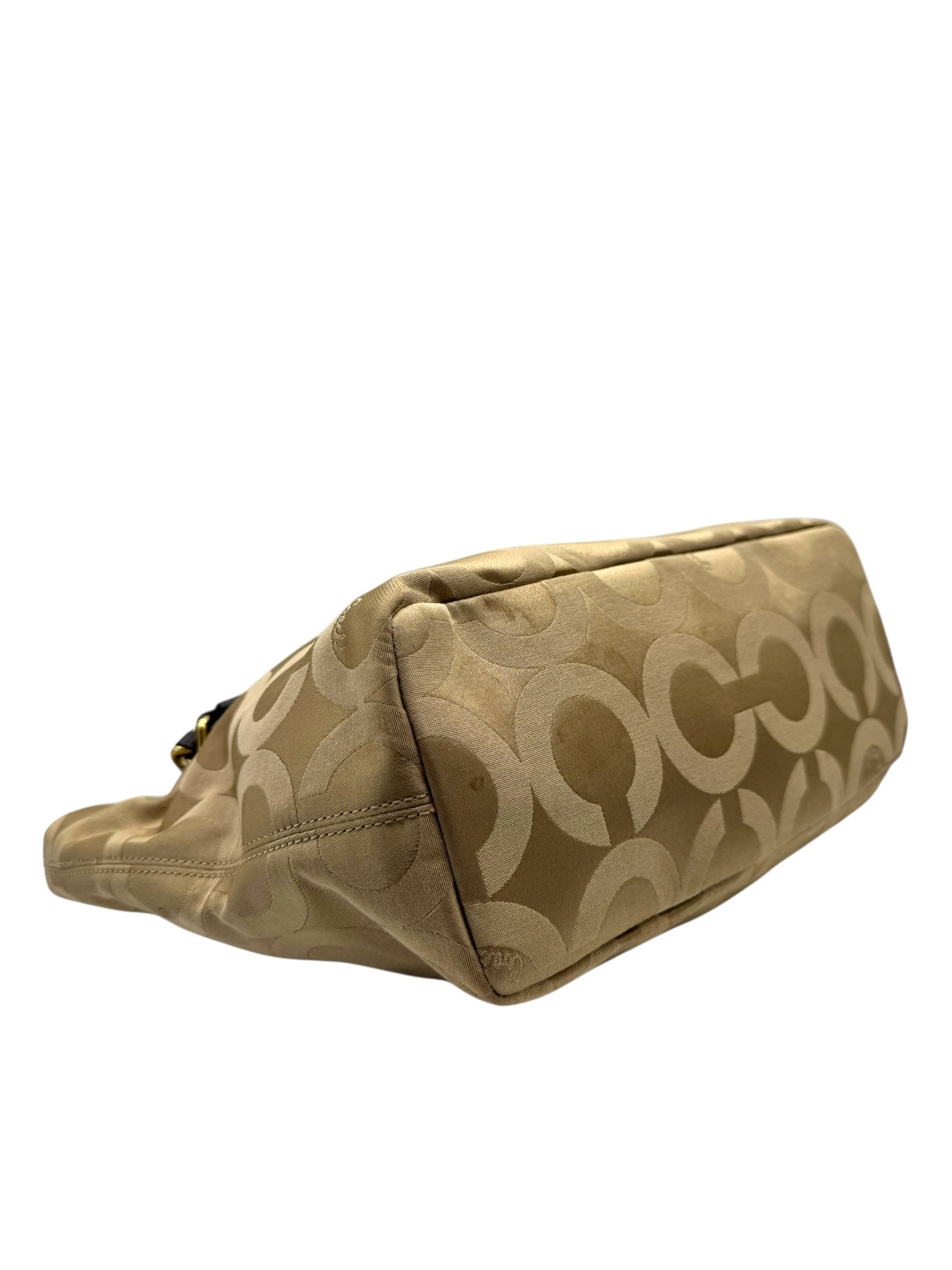Bolsa elaborada en textil con diseño monogram, apliques en dorado, asas con cuero, compartimento principal con zipper.
