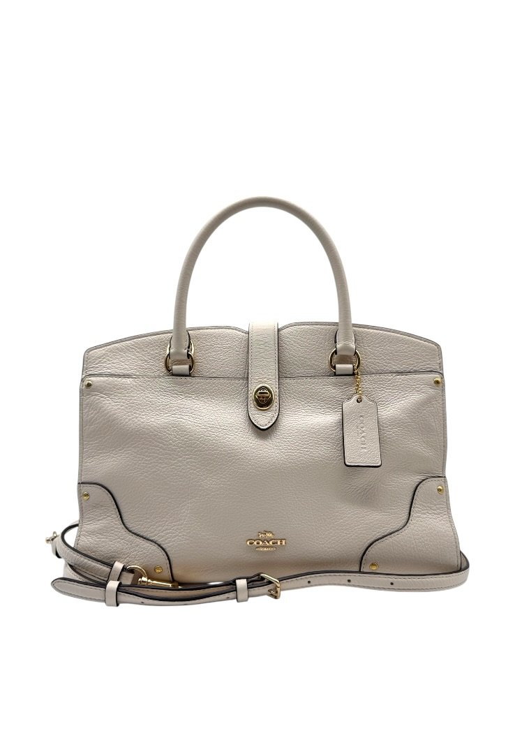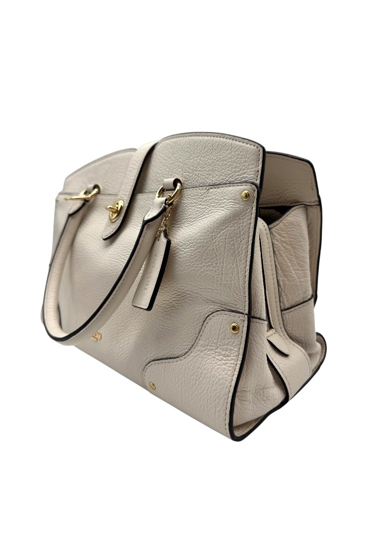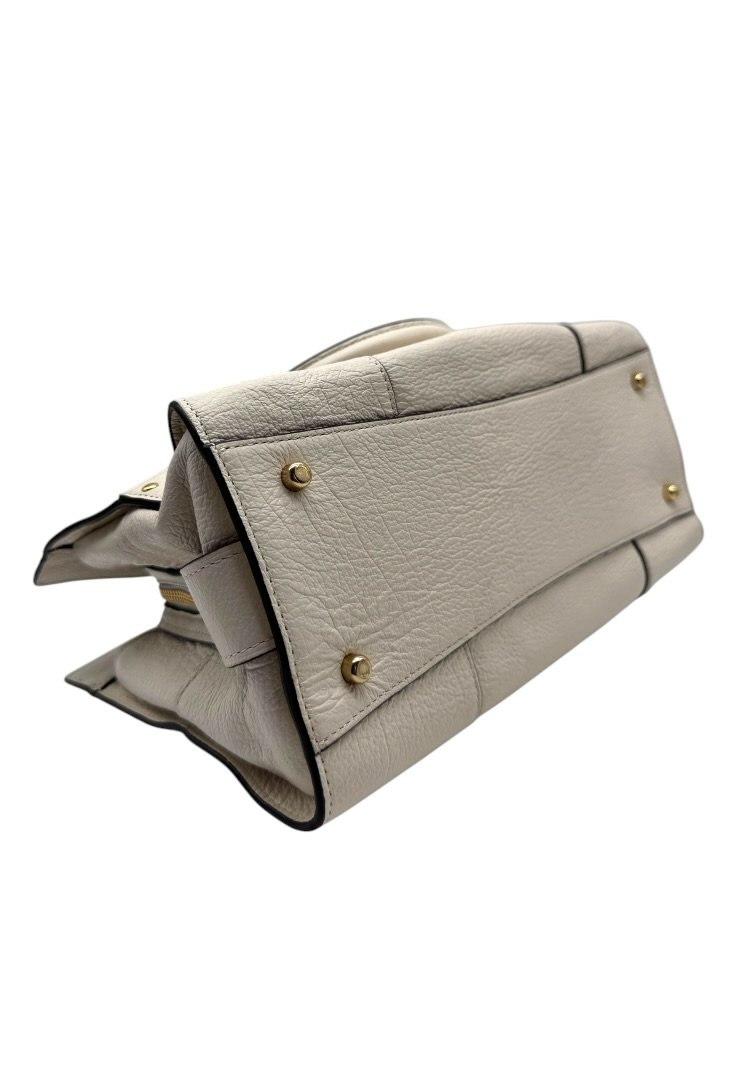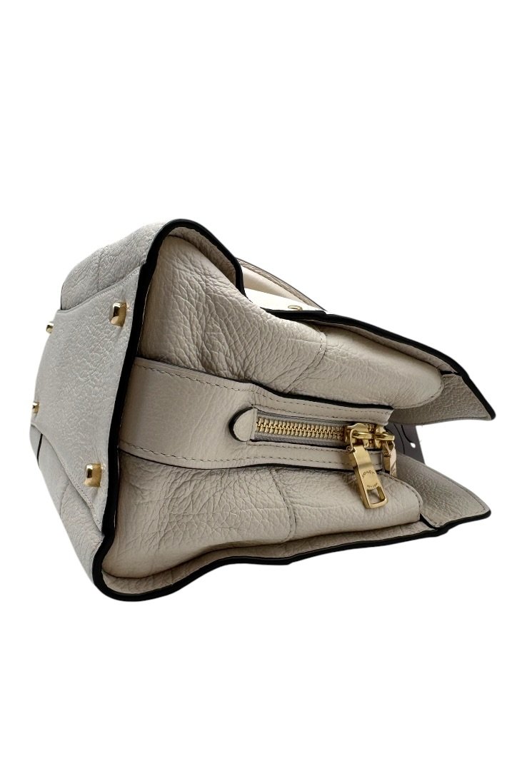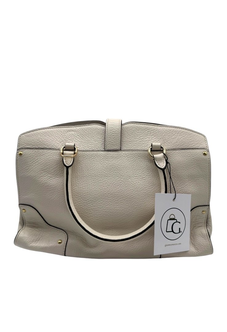 Bolsa elaborada en cuero suave, con herrajes en dorado, cierre con giro, compartimento interno con zipper, strap ajustable.