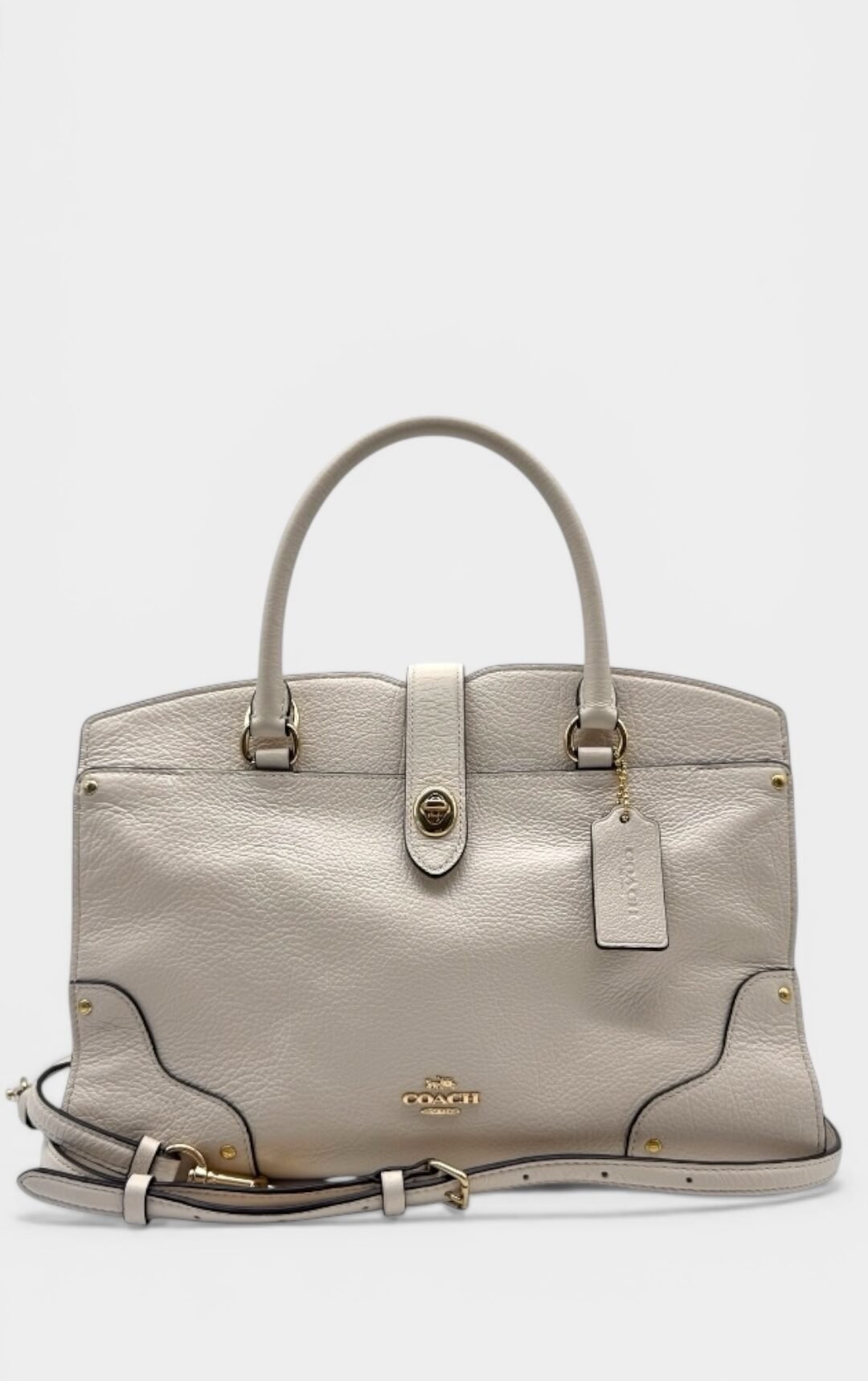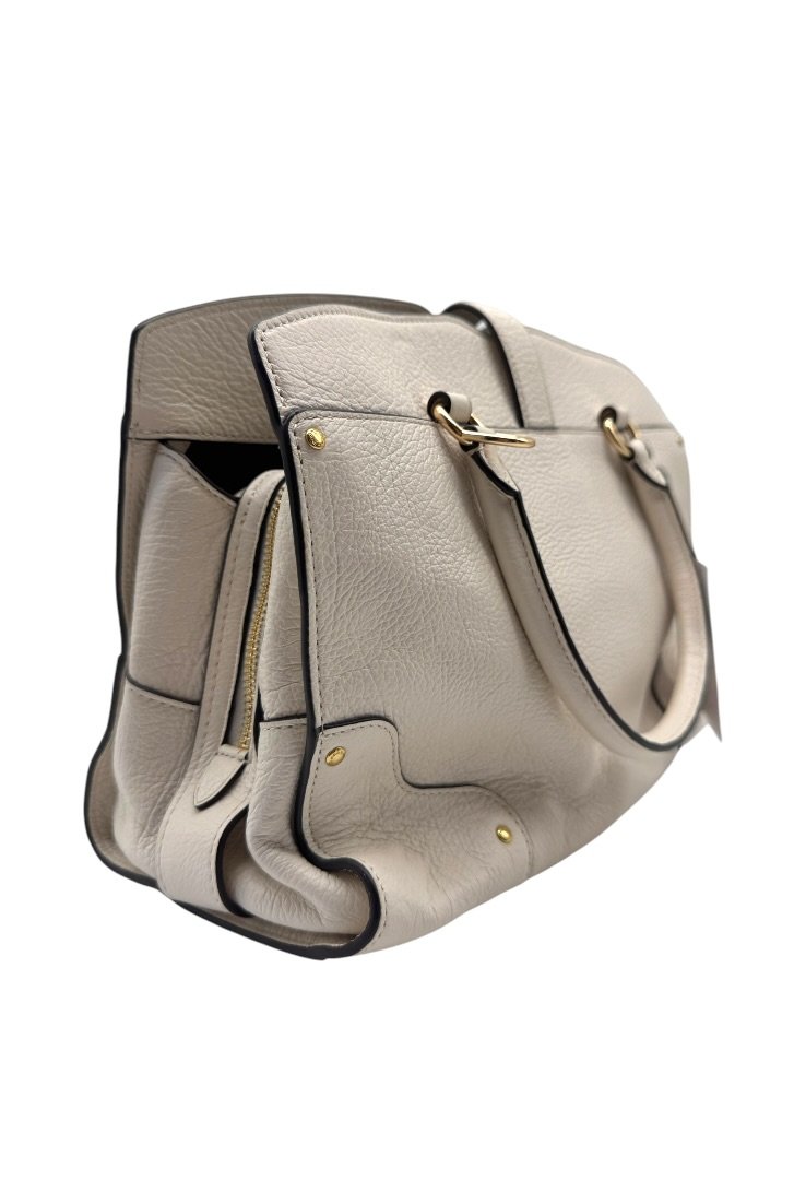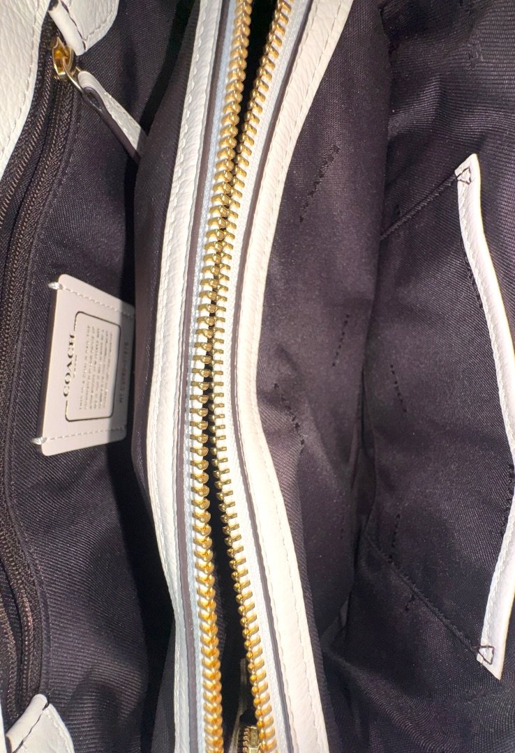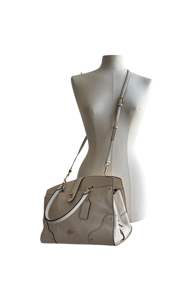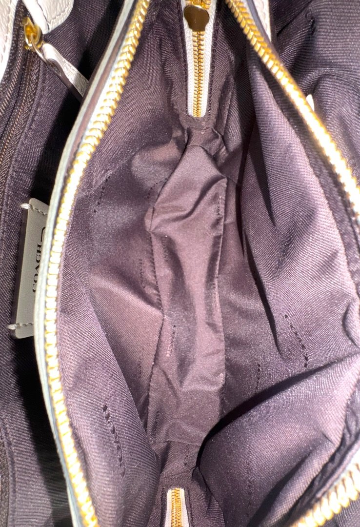 Bolsa elaborada en cuero suave, con herrajes en dorado, cierre con giro, compartimento interno con zipper, strap ajustable.