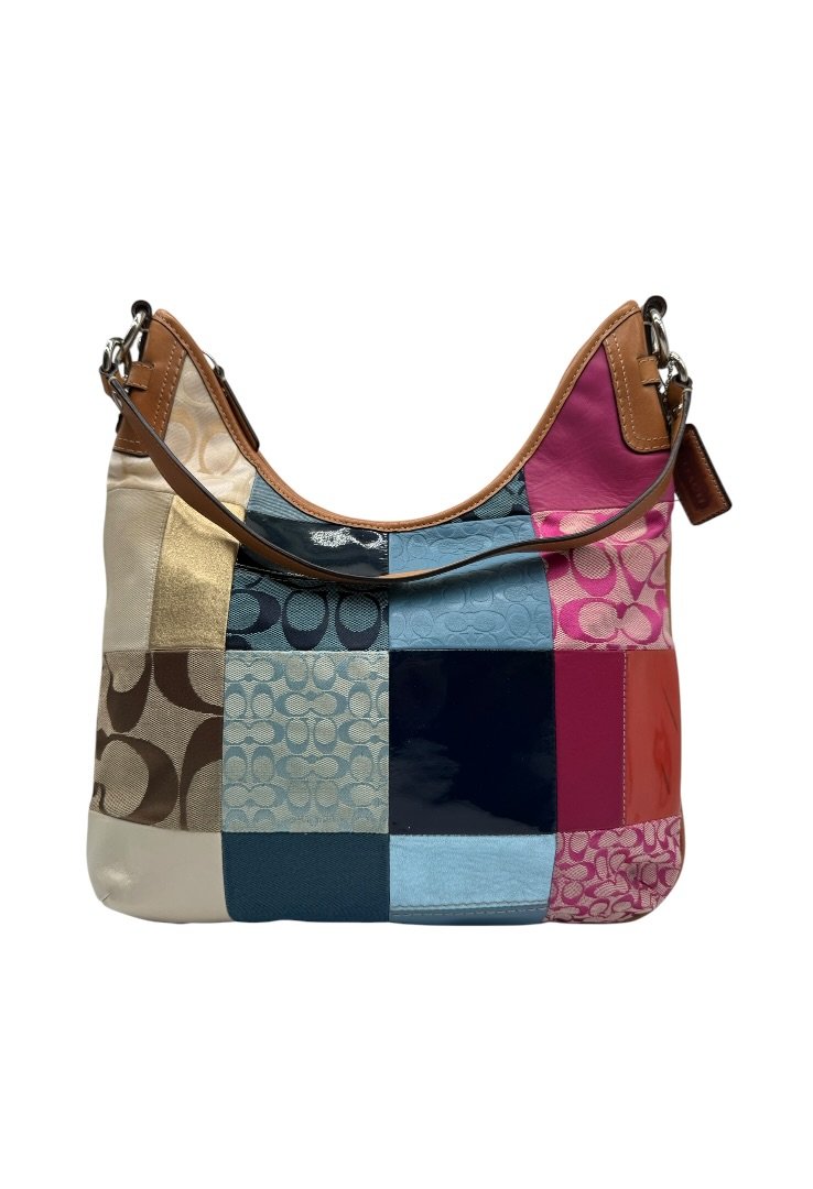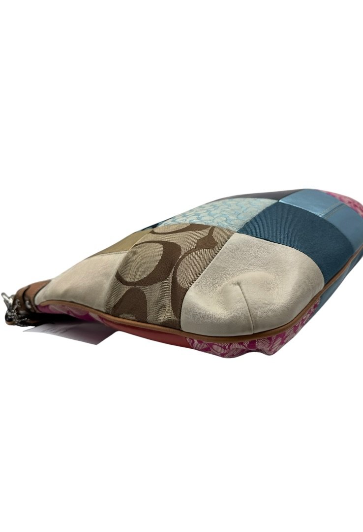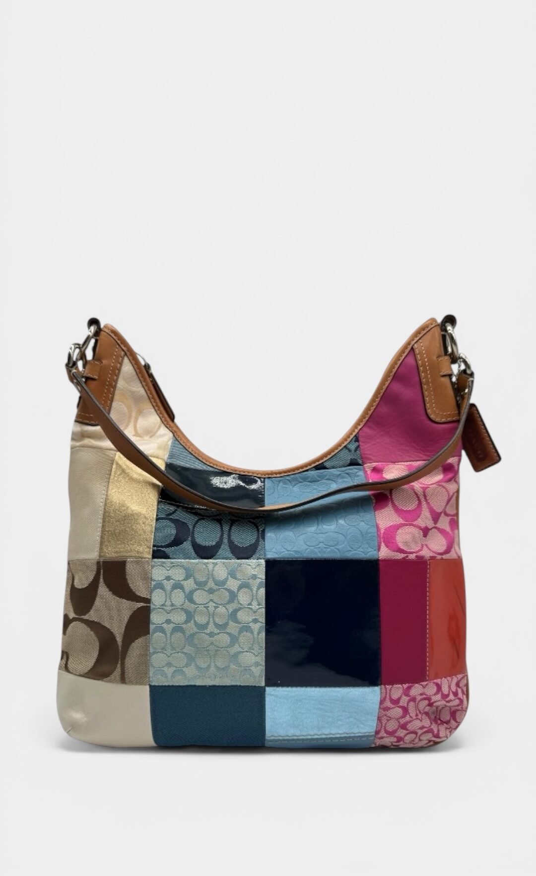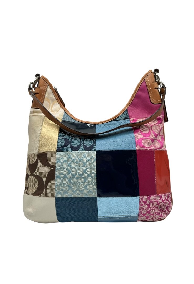 Bolsa elaborada en diferentes materiales creando una cuadricula con diseño monogram, compartimento principal con cremallera
