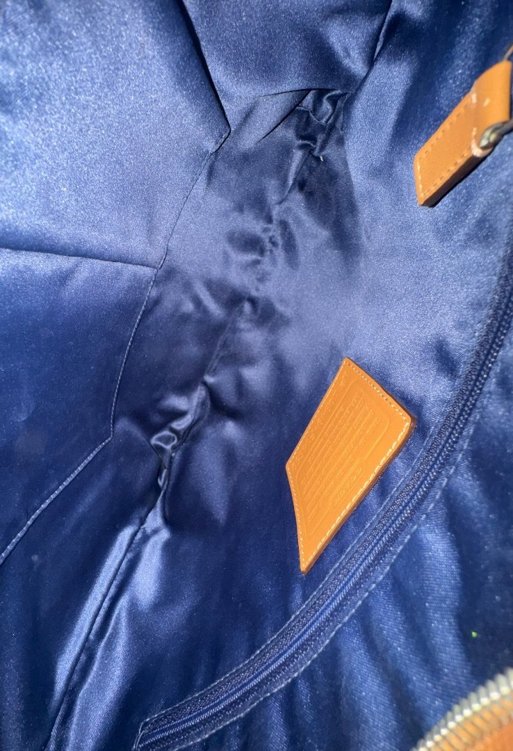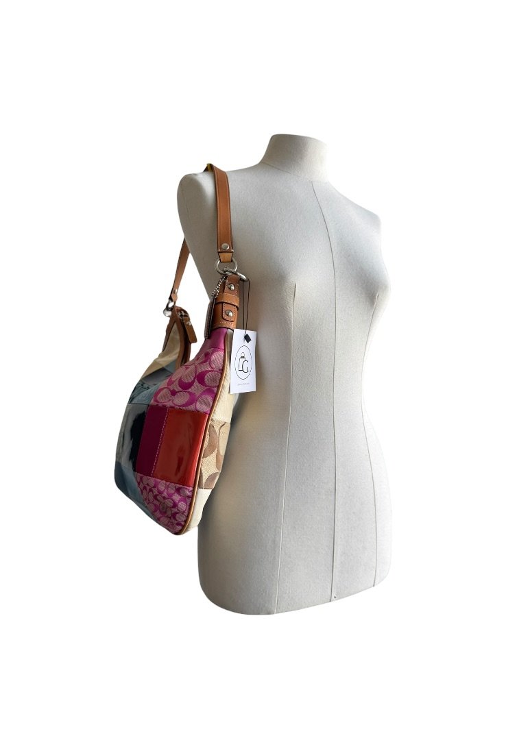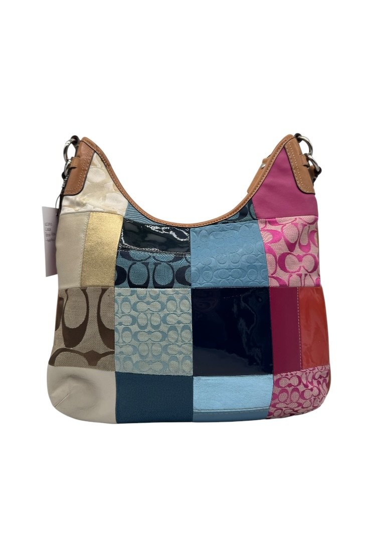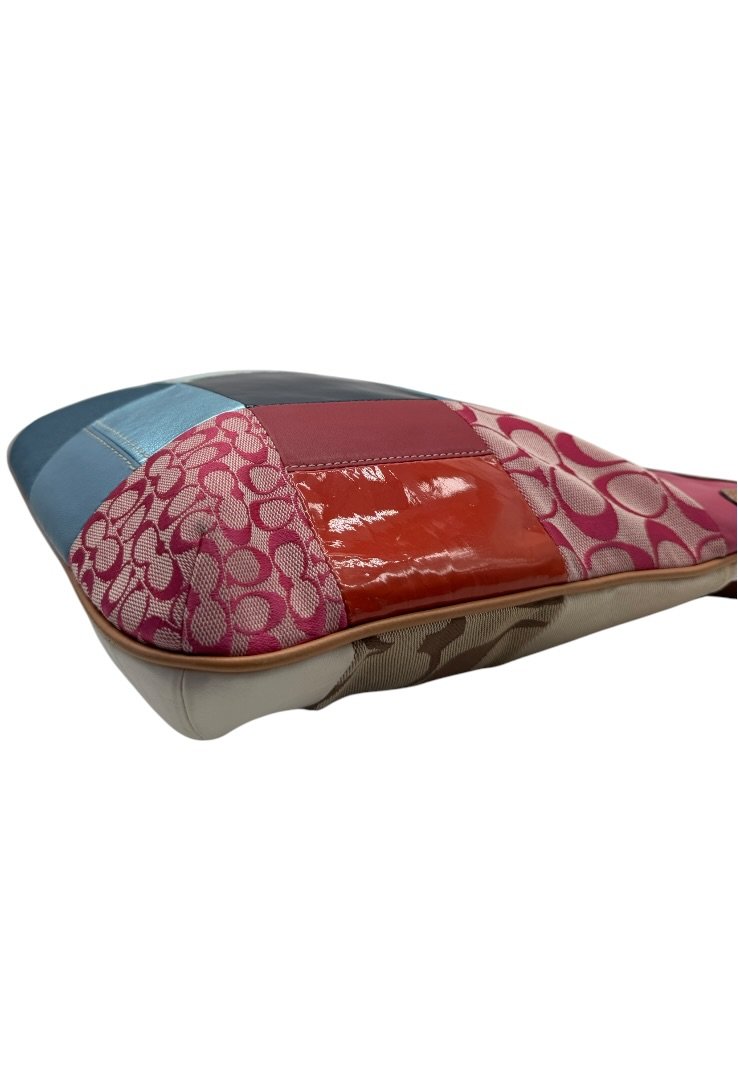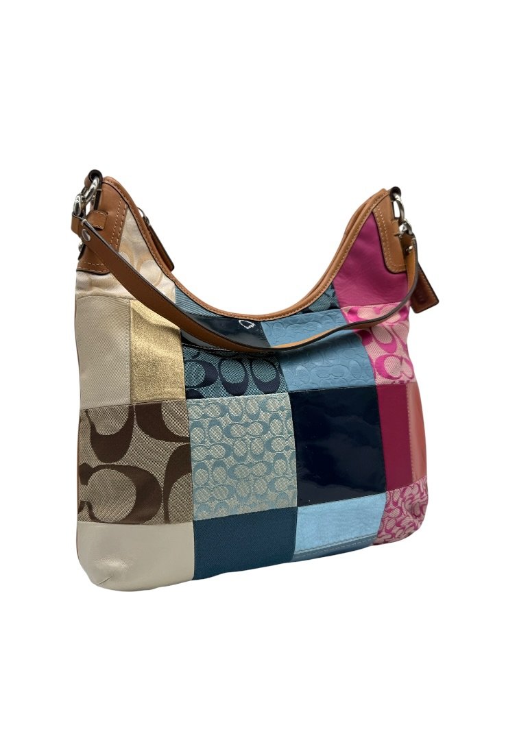 Bolsa elaborada en diferentes materiales creando una cuadricula con diseño monogram, compartimento principal con cremallera