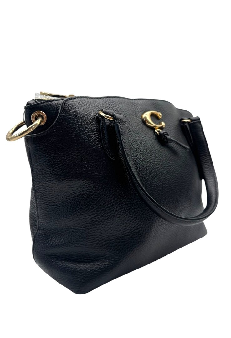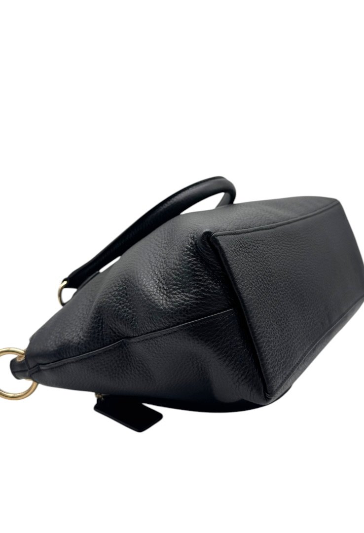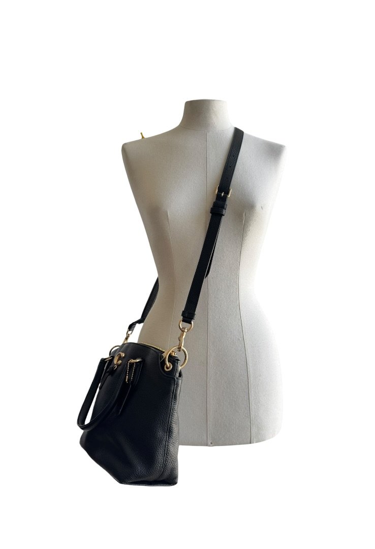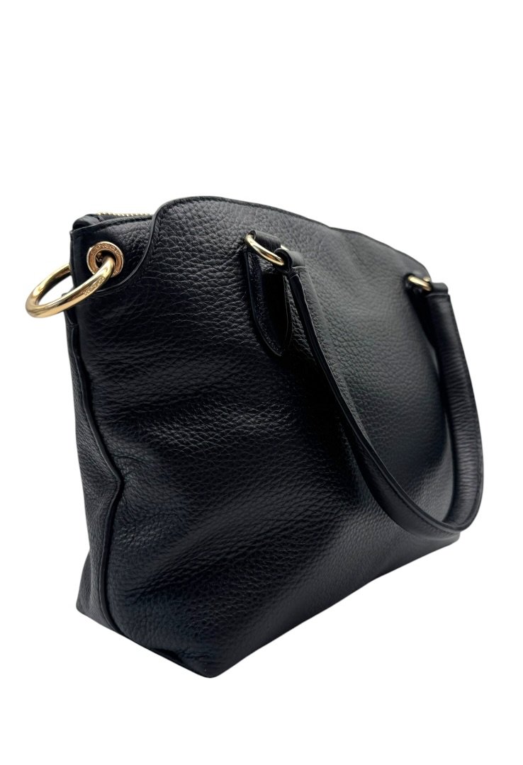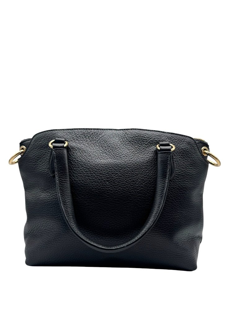 Bolsa elaborada en piel granulada, con herrajes en dorado, strap ajustable y asas fijas, compartimento principal con zipper.