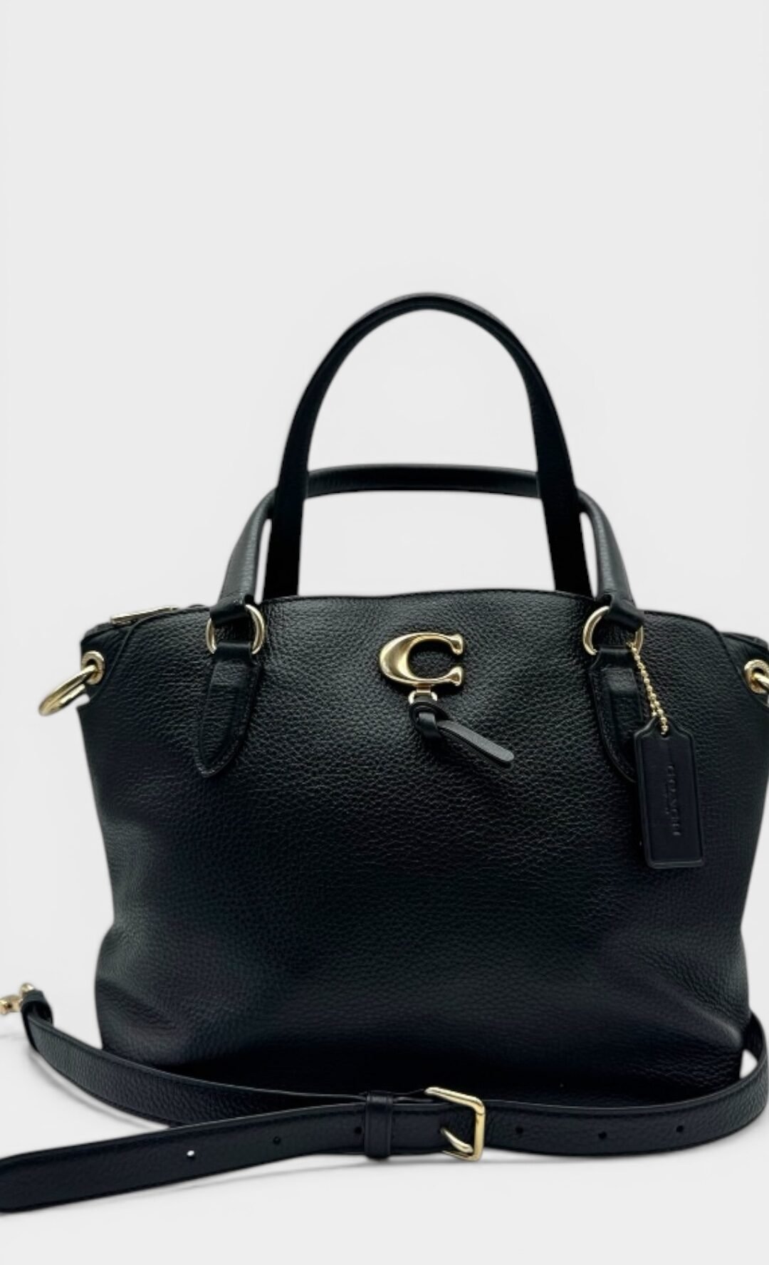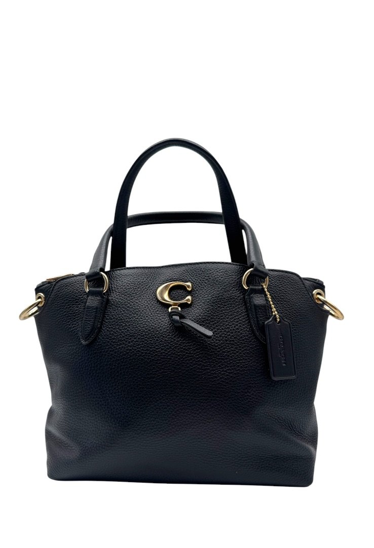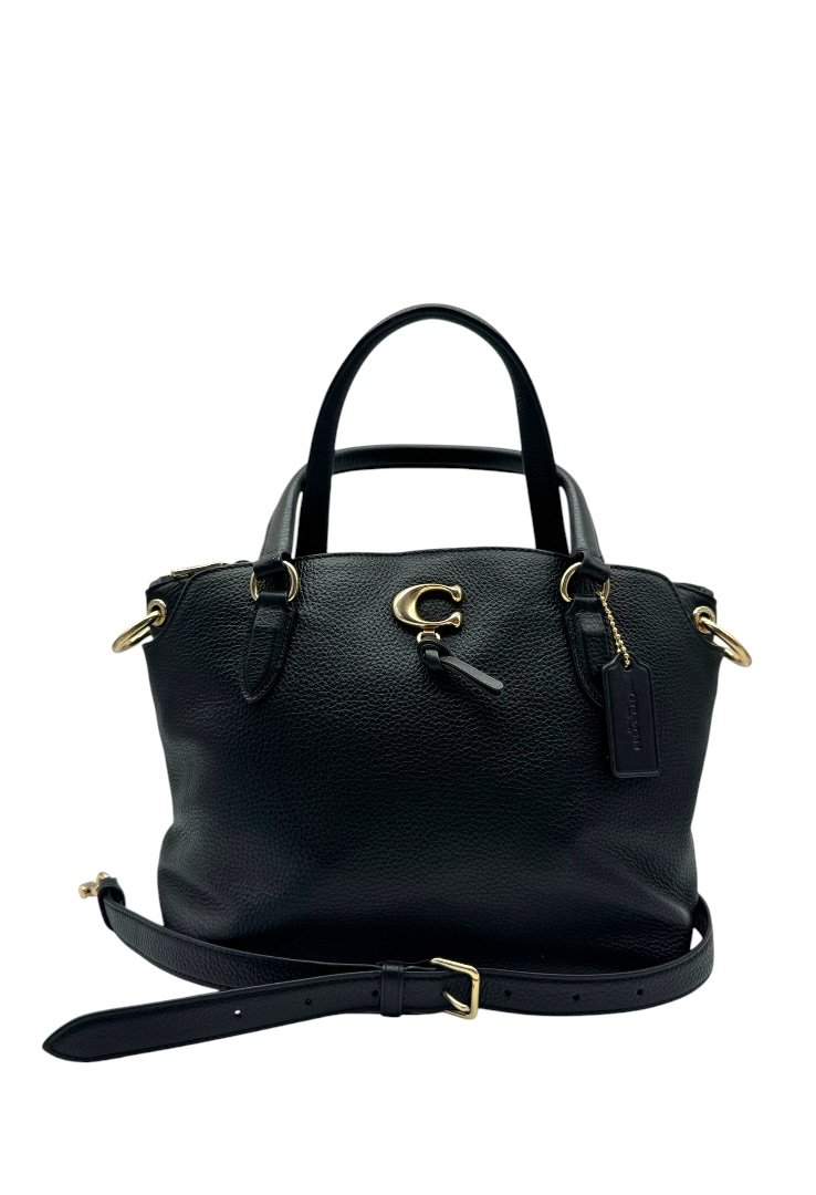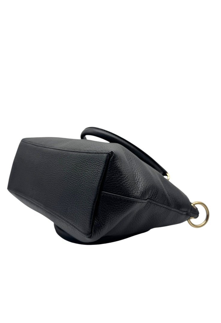 Bolsa elaborada en piel granulada, con herrajes en dorado, strap ajustable y asas fijas, compartimento principal con zipper.