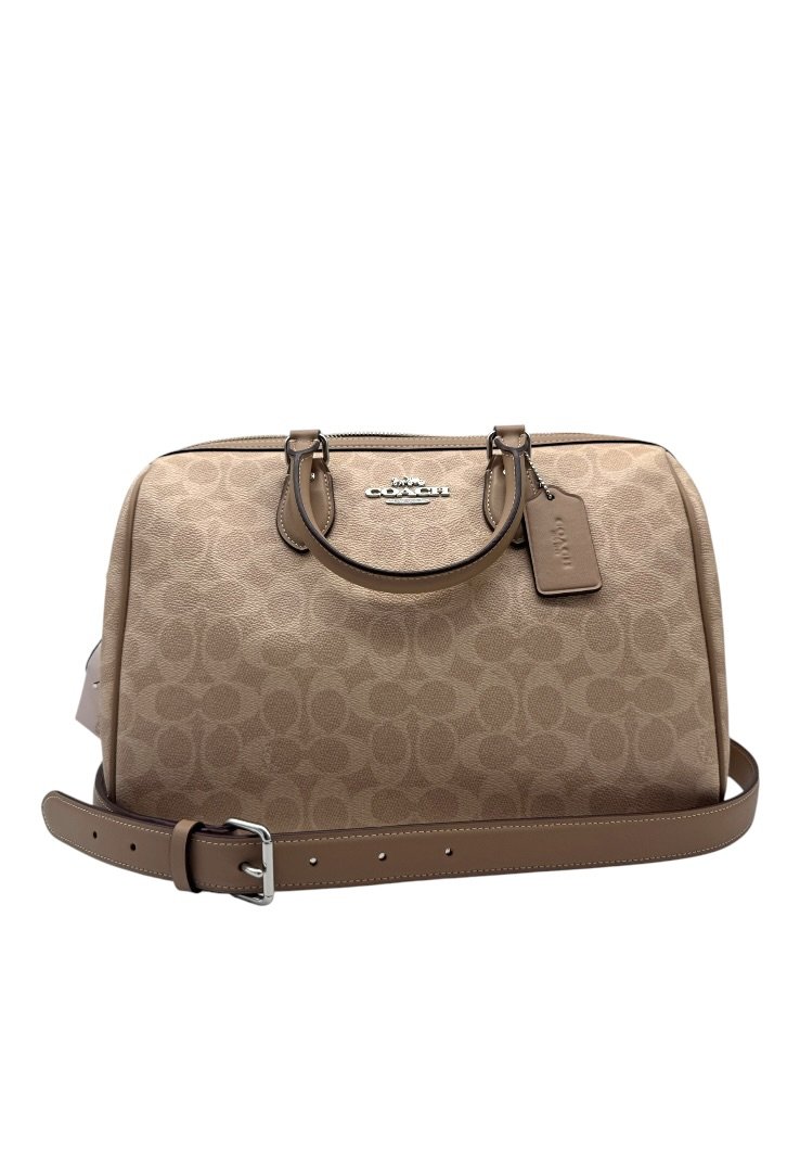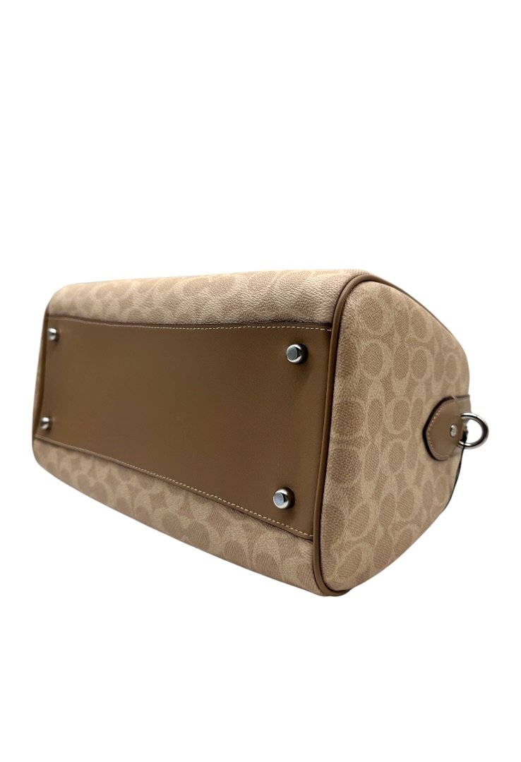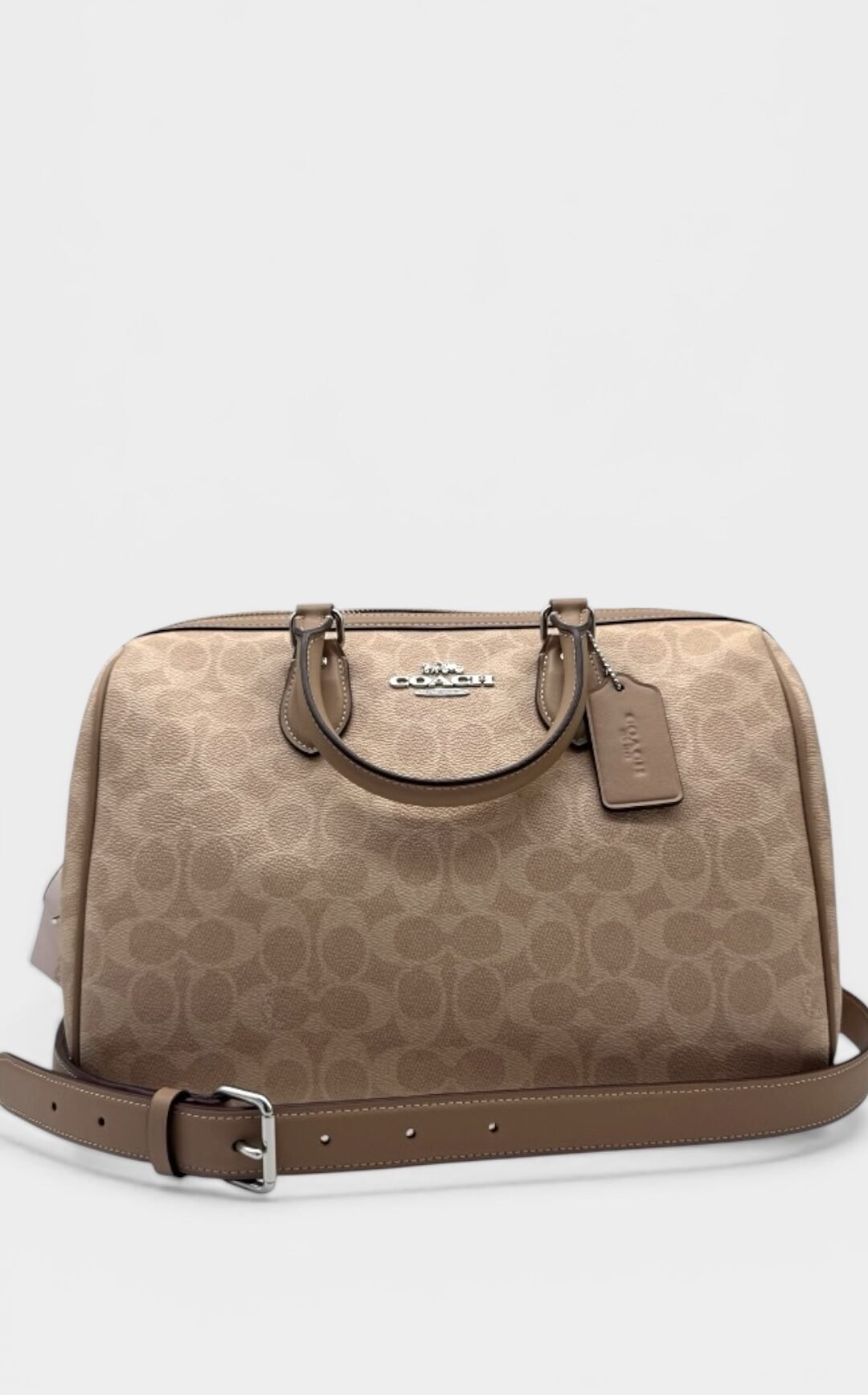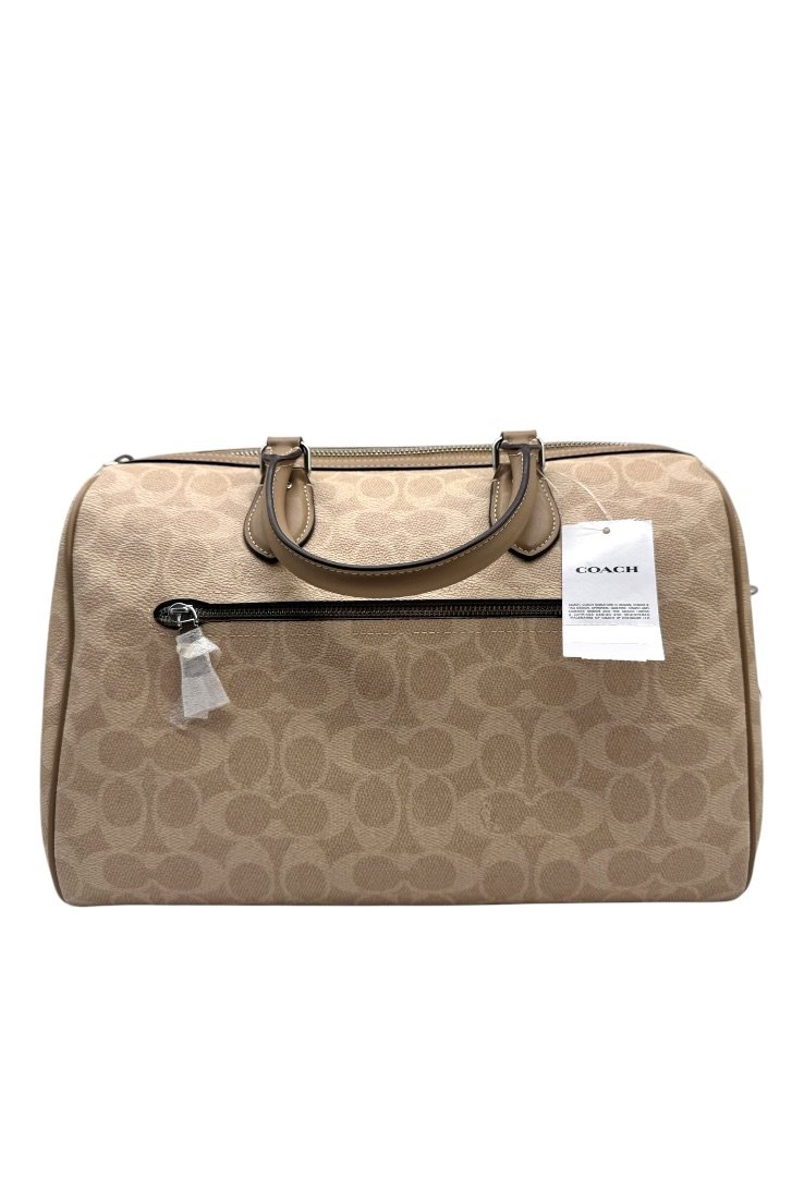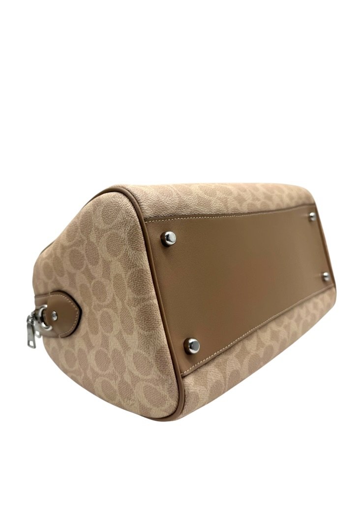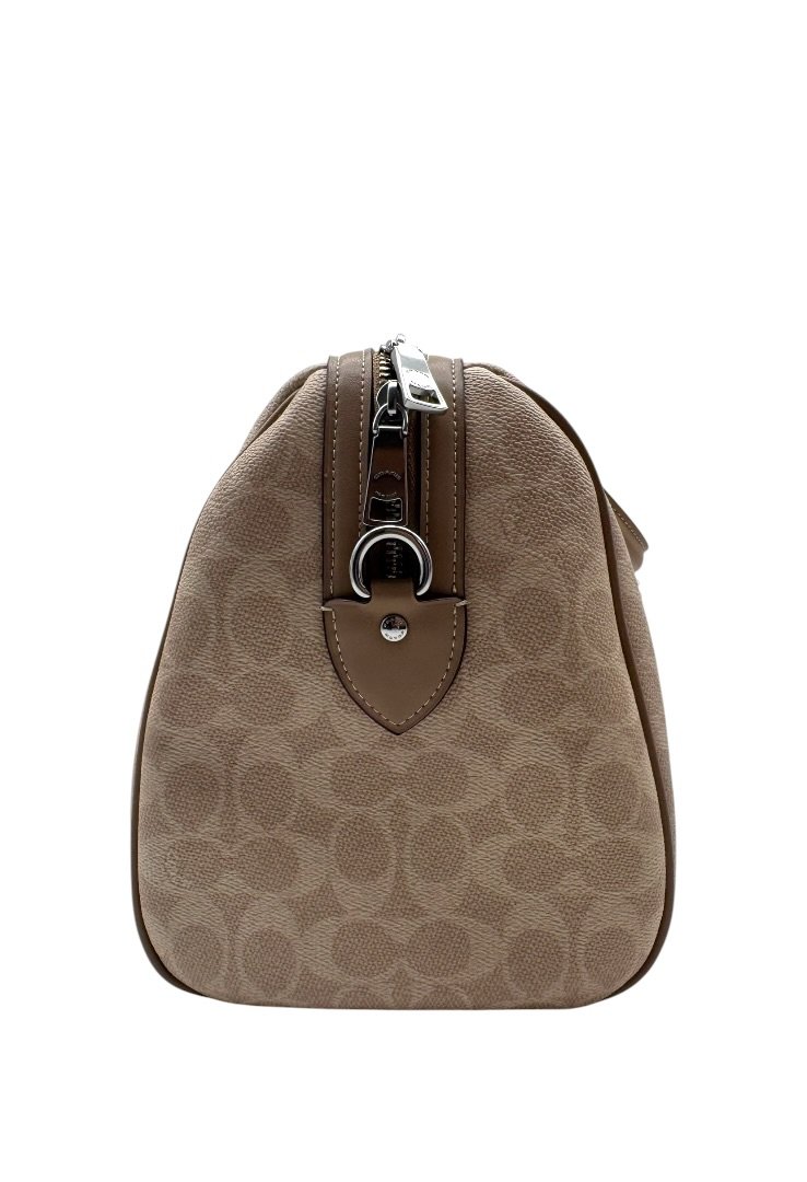 Bolsa elaborado en canvas signature con diseño monogram, herrajes en plata, ribetes en cuero, cierre principal con zipper.