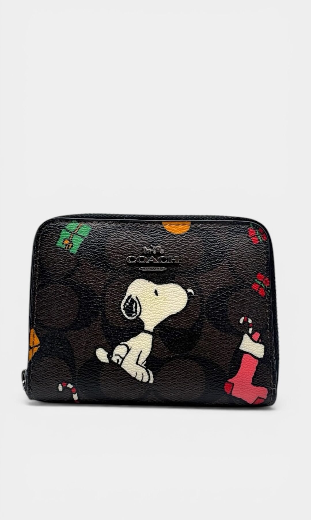 Cartera elaborada en lona monogram, con estampado de snoopy, herrajes en negro.