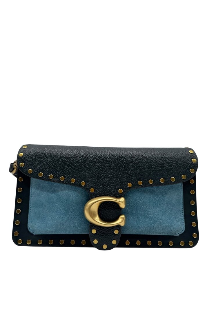 Confeccionada en cuero granulado y gamuza, cierre a presión, herrajes exteriores en tono dorado y 1 bolsillo deslizante, 1 bolsillo interior con cremallera y 2 bolsillos deslizantes