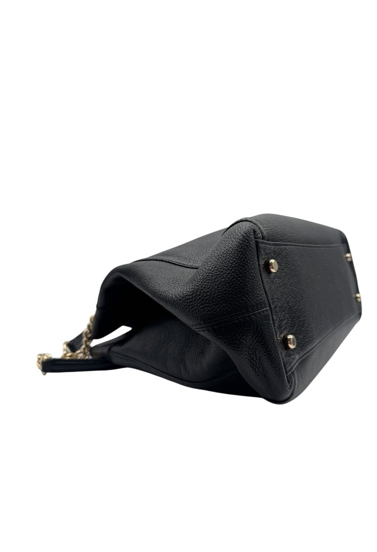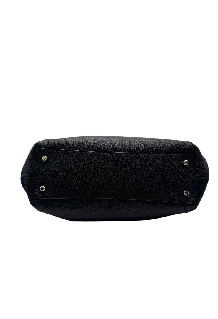Bolso elaborado en piel granulada, triple compartimento, doble abierto cierre con broche y compartimento con cremallera, apliques en dorado.