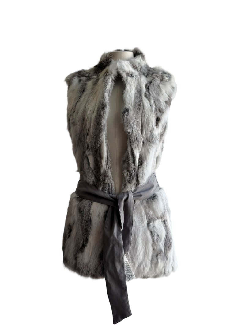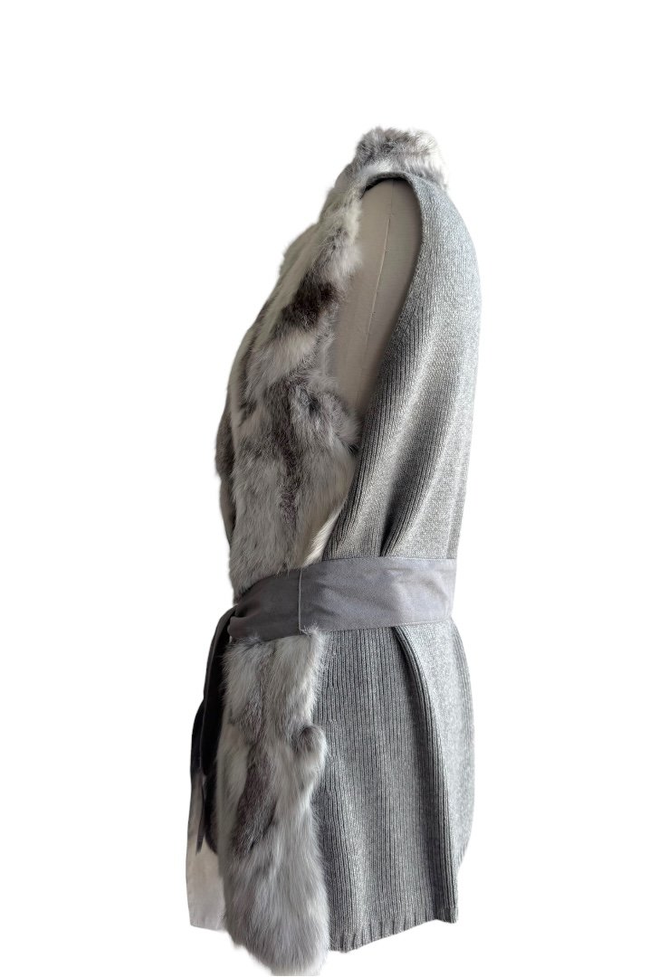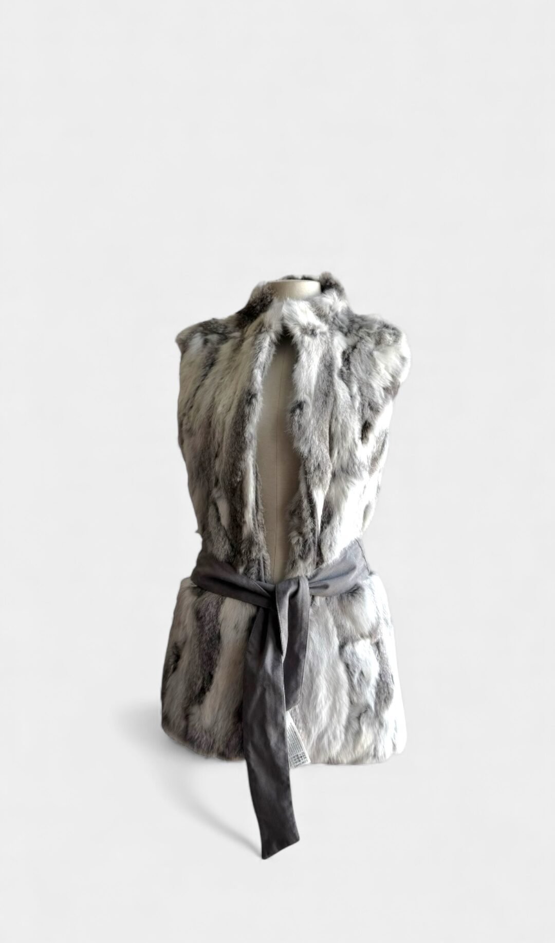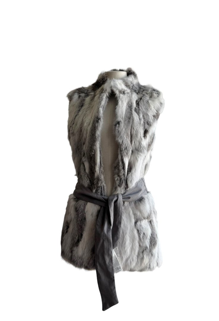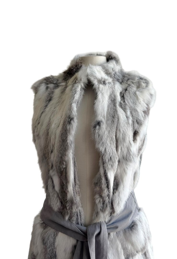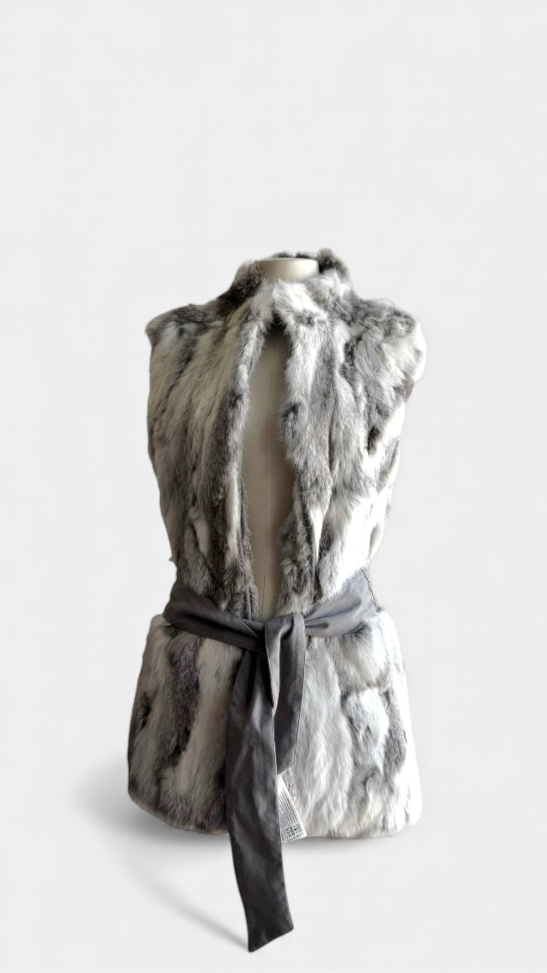 Chaleco con peluche, listón a la cintura y tela stretch en la parte posterior.