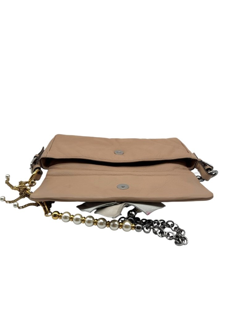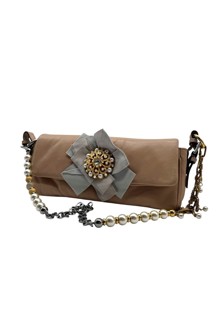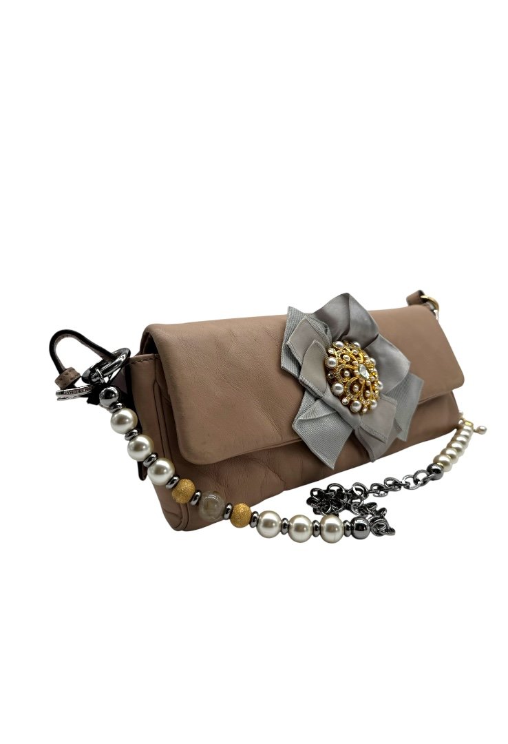 Bolso elaborado en piel, cierre en solapa con broche de magnético, adorno en la parte frontal, asa con detalles de joyería.