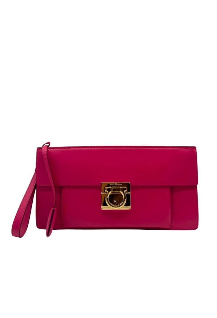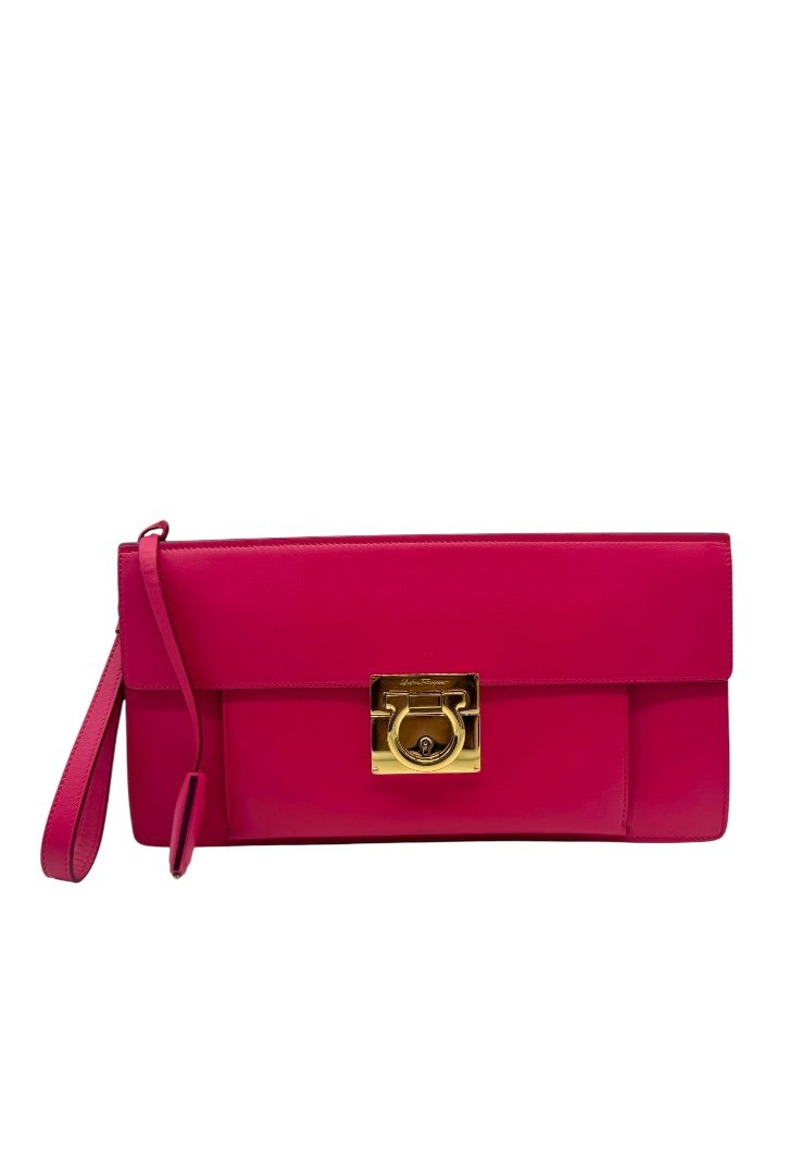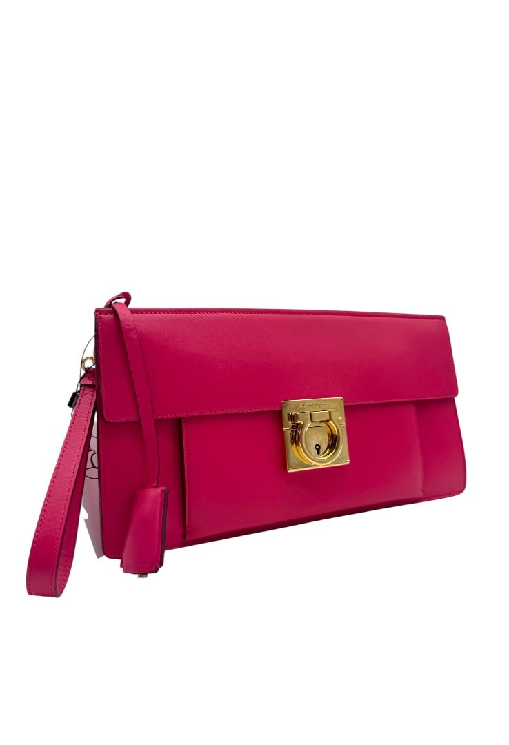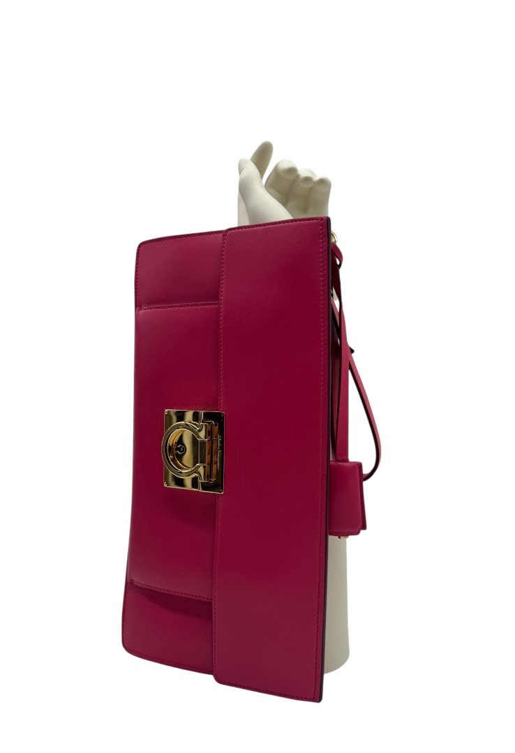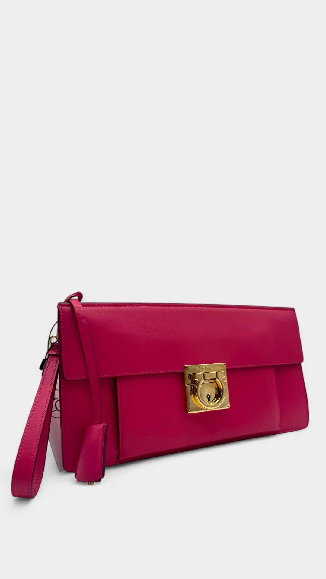 Clutch elaborado de cuero, asa para muñeca, apliques en dorado, cierre en solapa con broche.