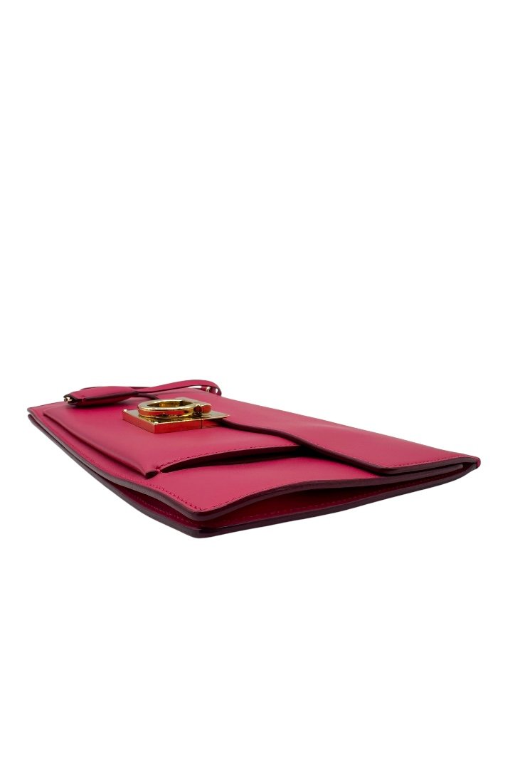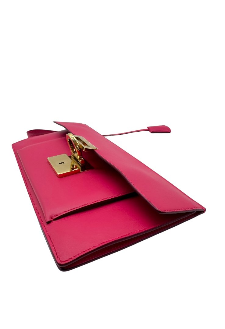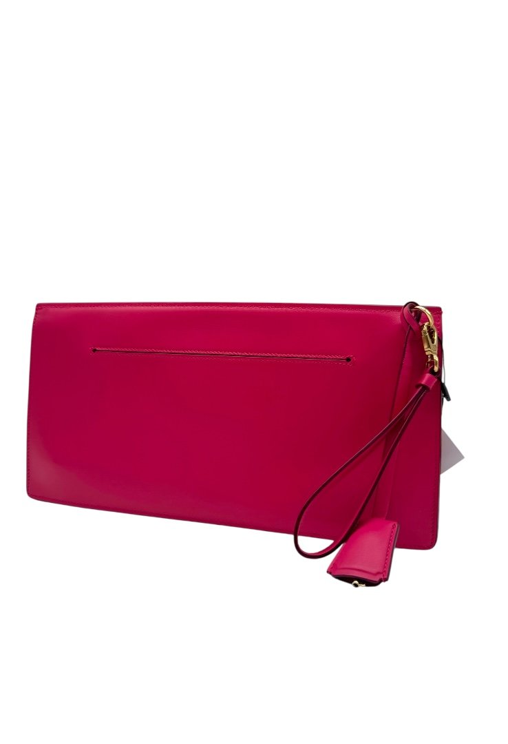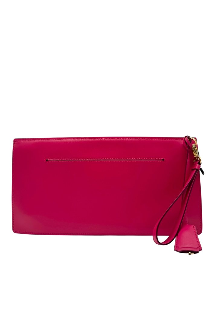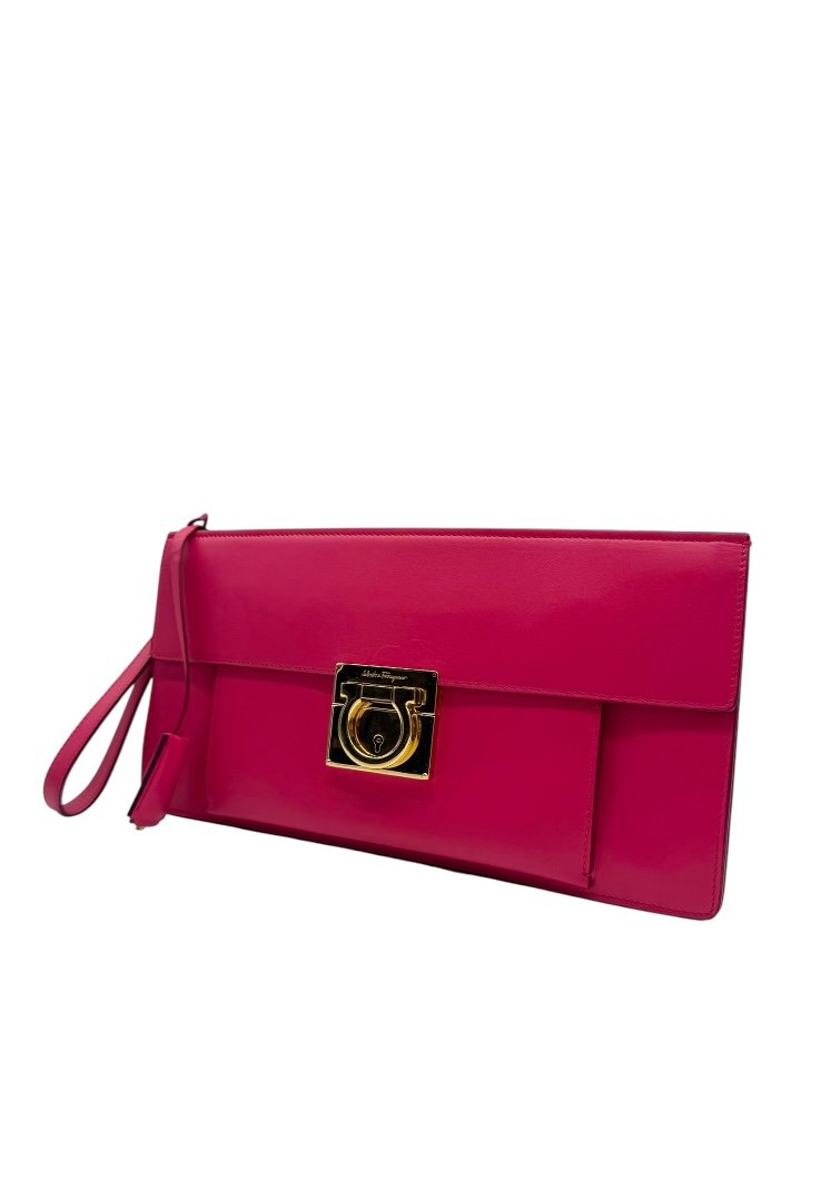Clutch elaborado de cuero, asa para muñeca, apliques en dorado, cierre en solapa con broche.