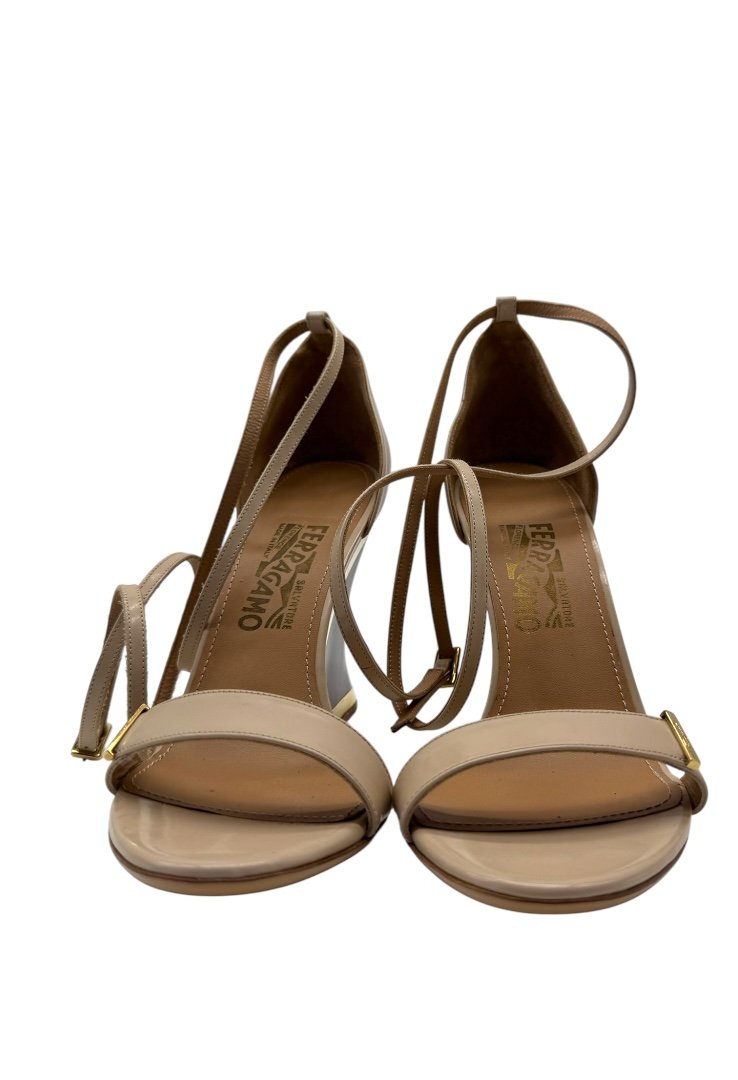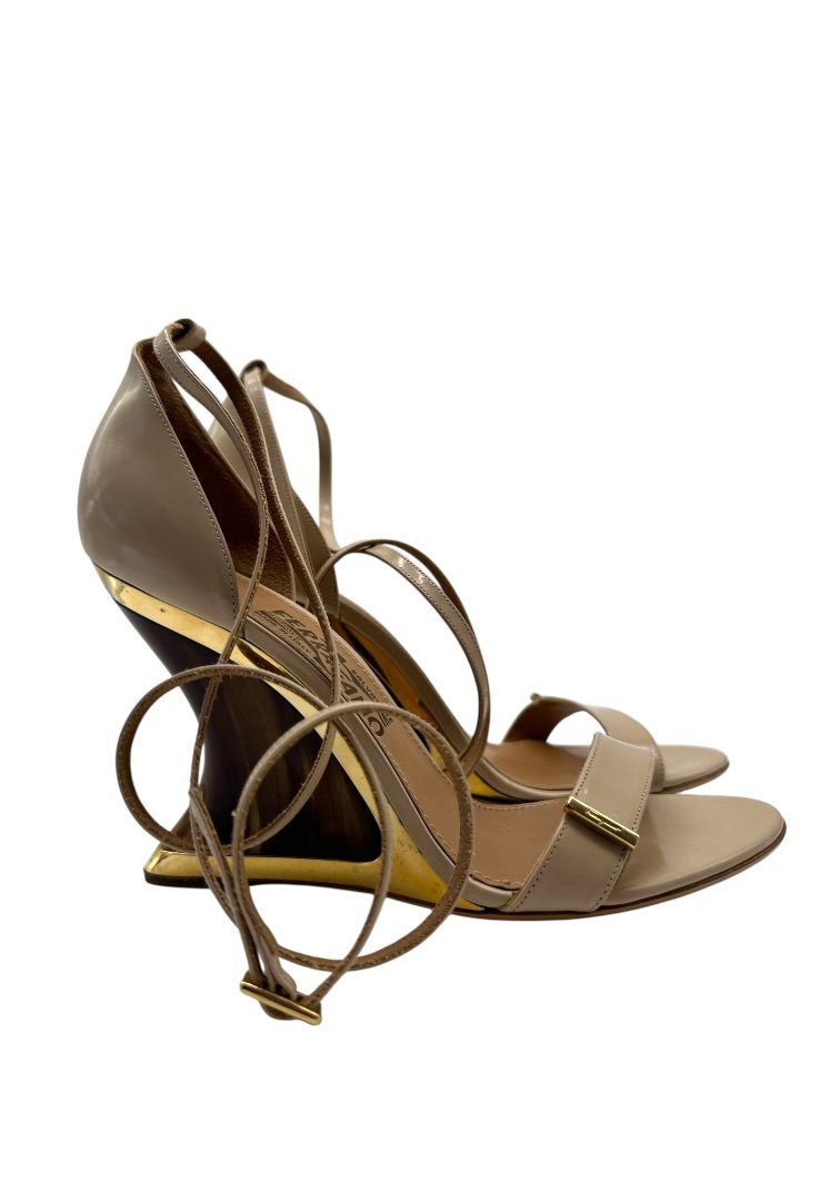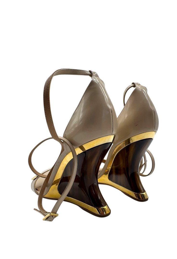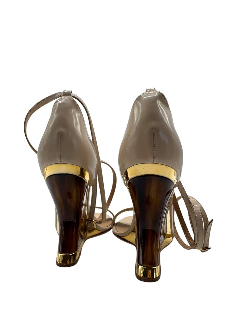 Tacones elaborados en piel con acabado de charol, tacón con aspecto de madera, detalles en dorado.