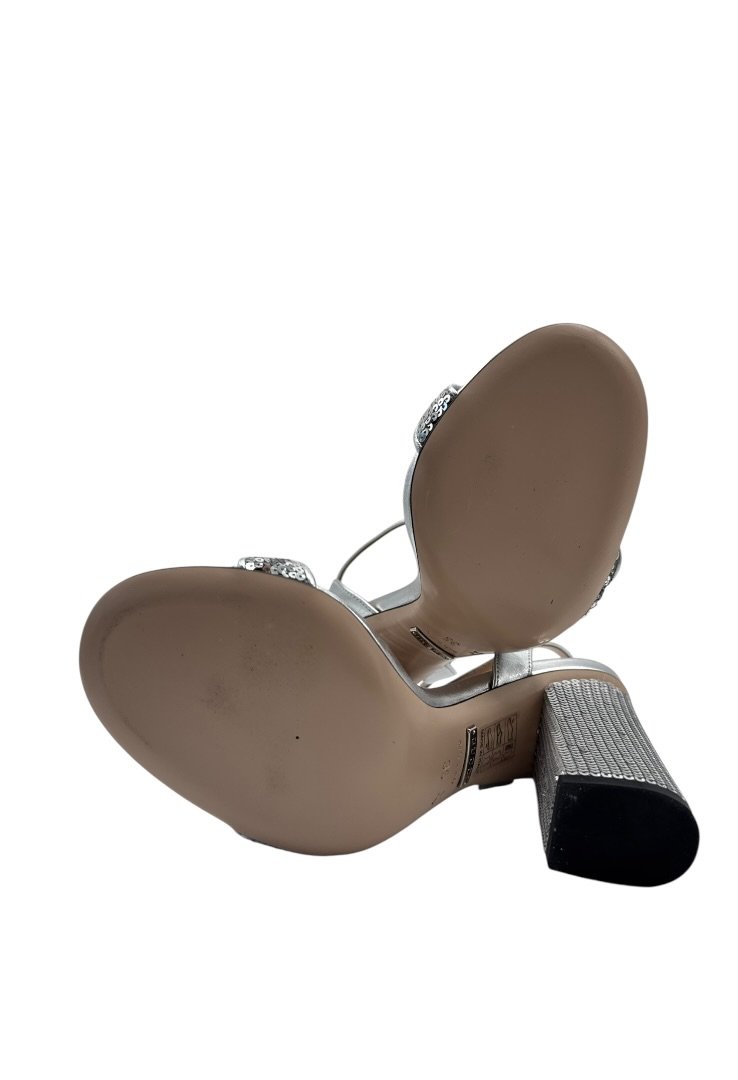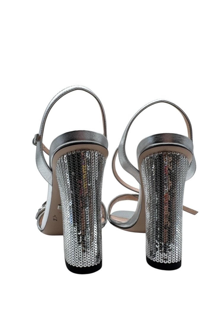 Tacones abiertos elaborados en cuero con lentejuelas, placa del logo en plata.