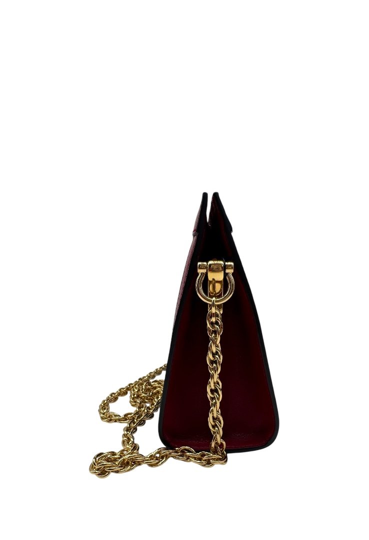 Bolsa fabricada en piel de becerro y gamuza, compartimento principal en cierre magnético, asa de cadena, herrajes y logo en dorado.