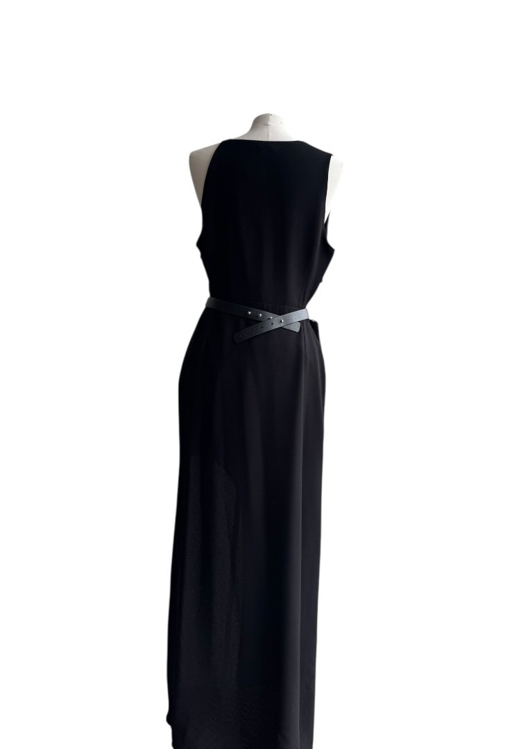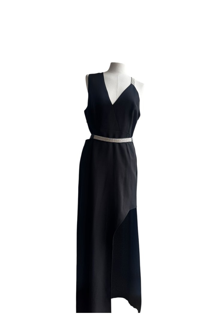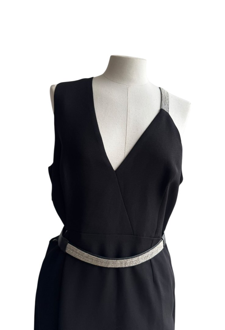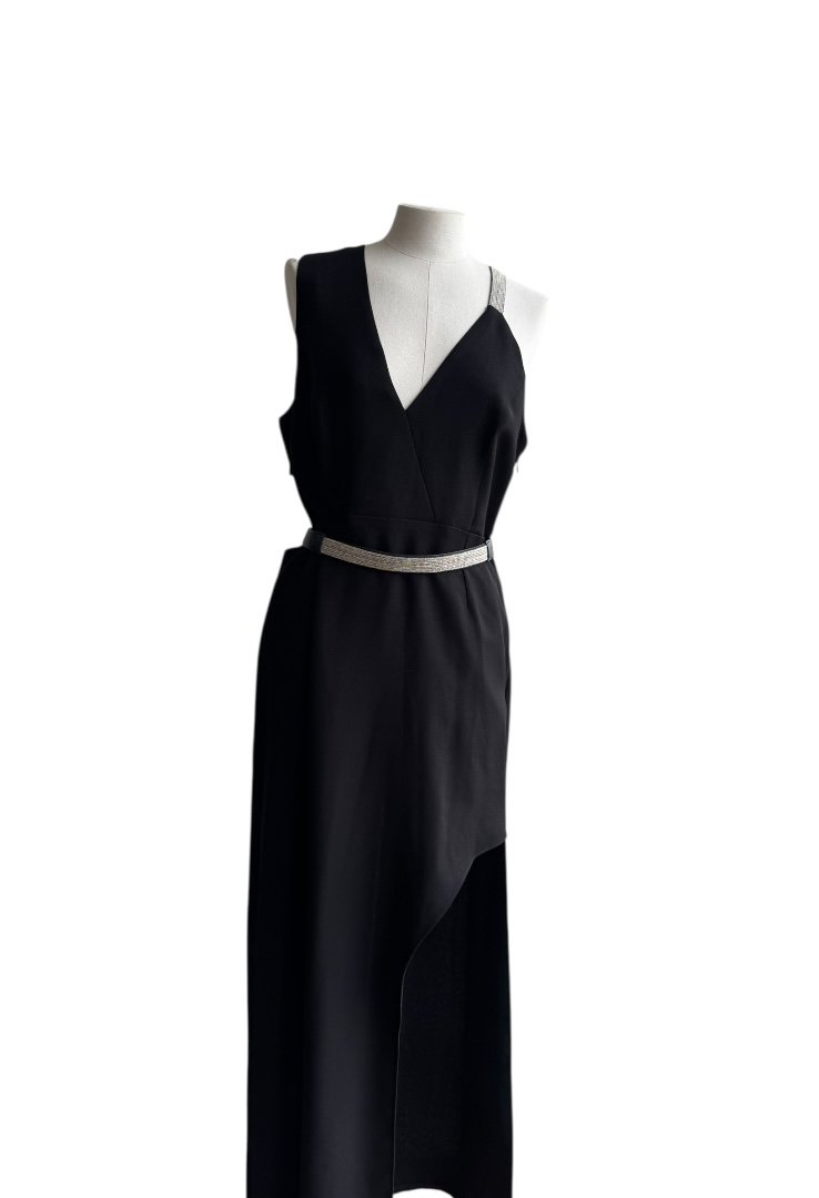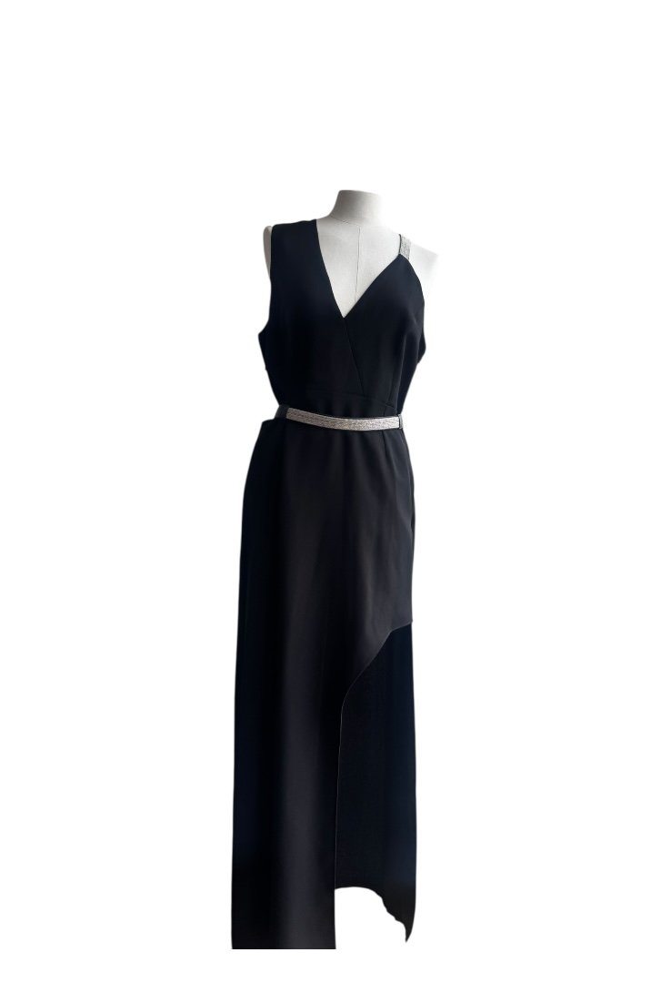 Confeccionado en poliester, sin mangas, escate en V, tietante de cadena multiple y cinturon.