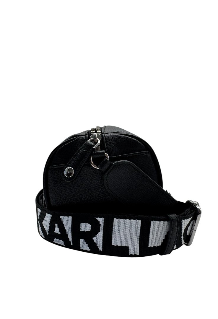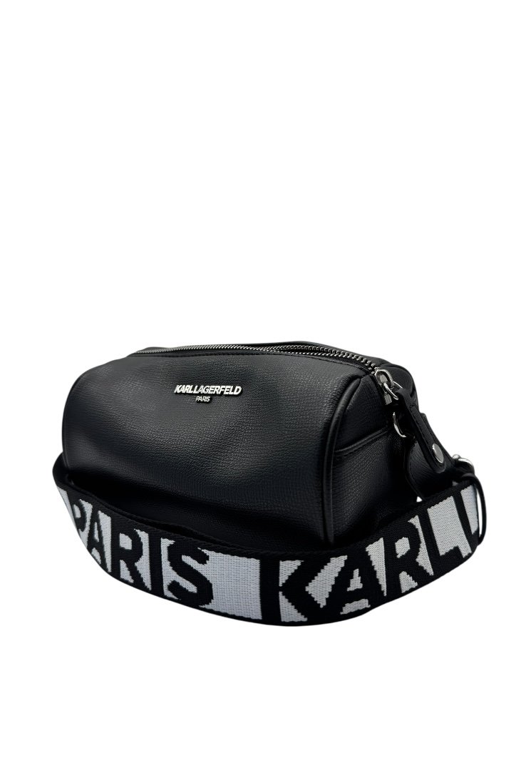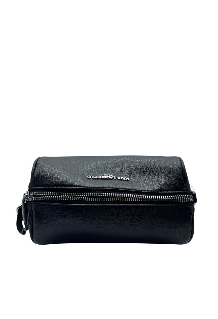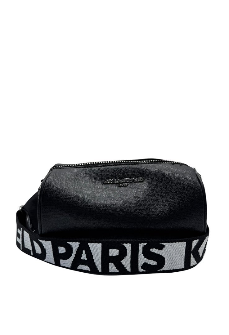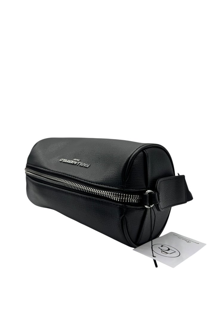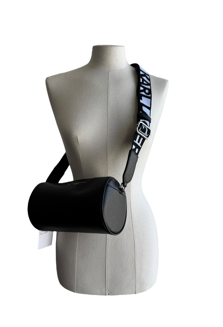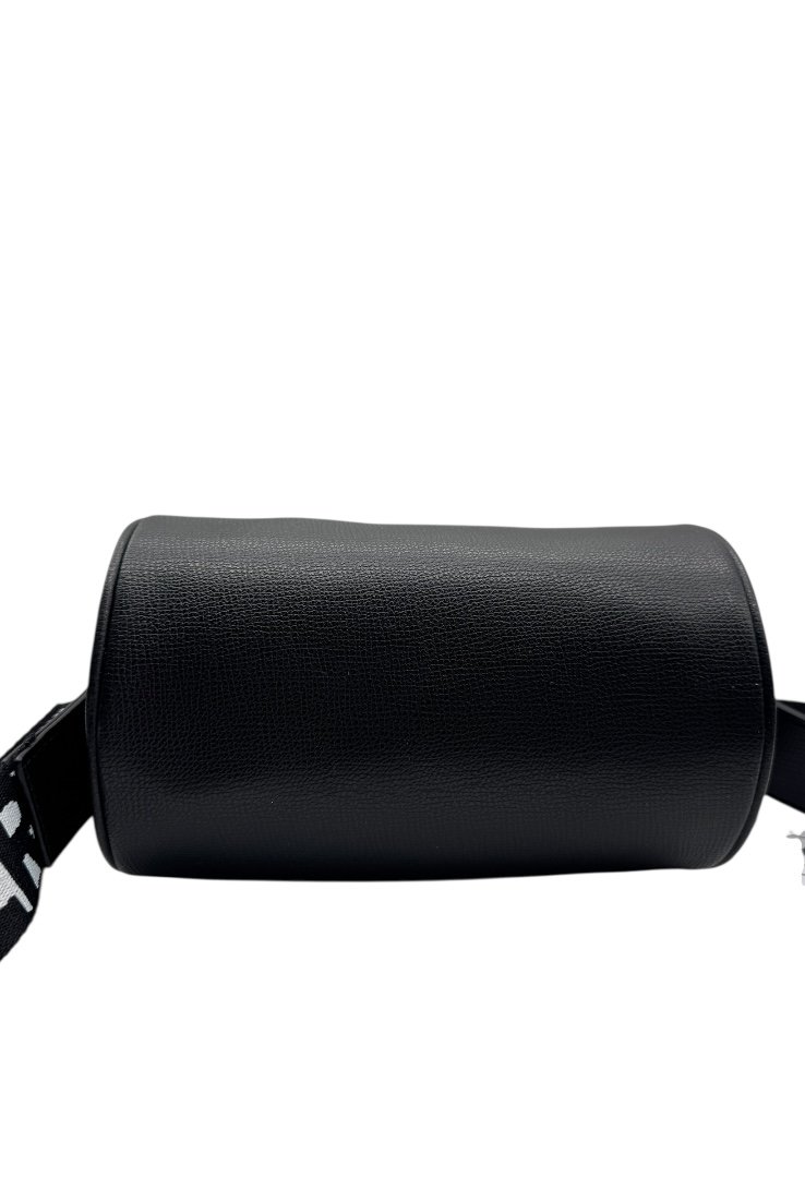 Fabricado en piel, esta bandolera en forma cilíndrica o de barril, destaca por su sofisticado color negro liso.