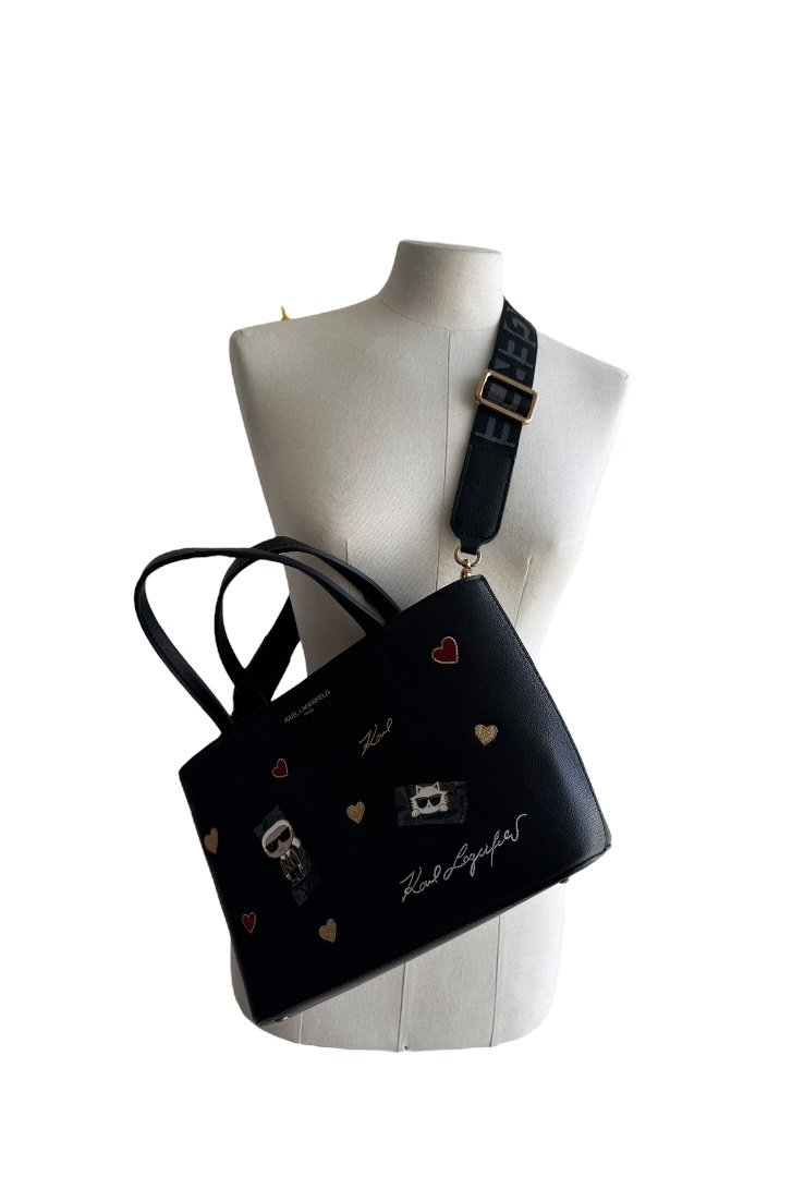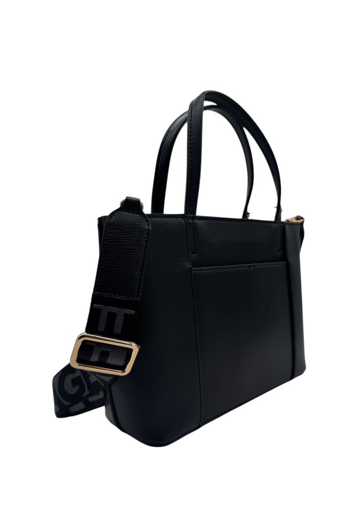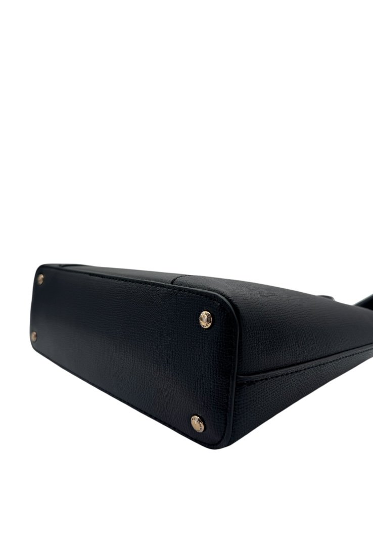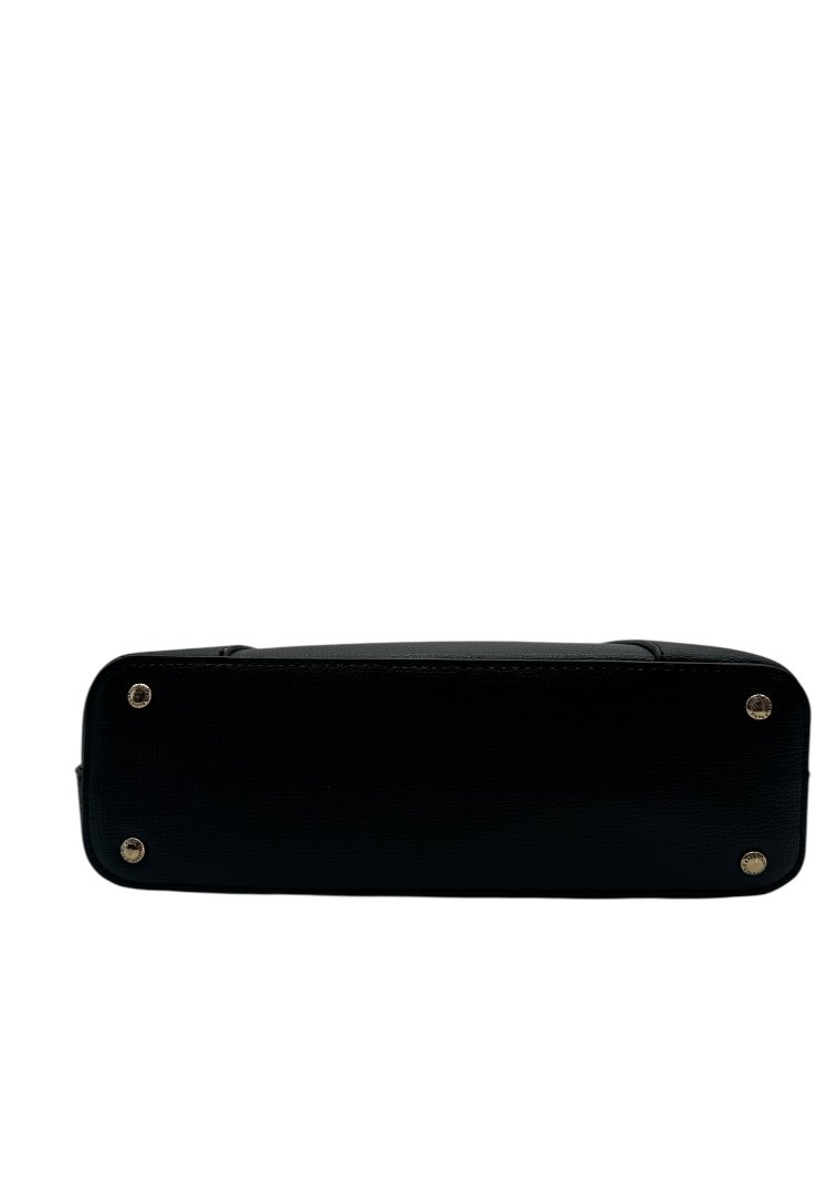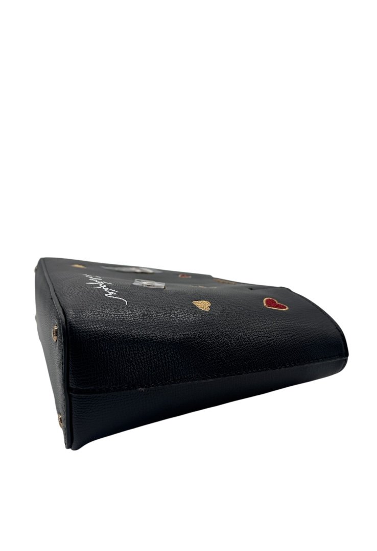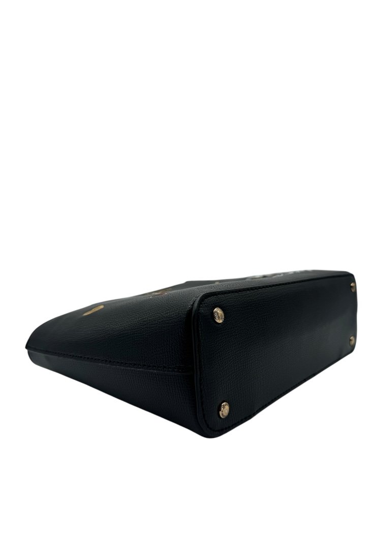 Bolso elaborado en cuero granulado, con charms metálicos de la marca. apliques en dorado, strap de tela con mini bolsito.