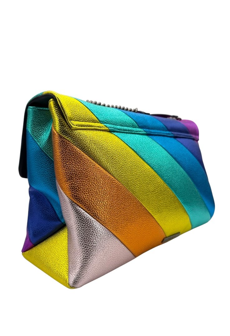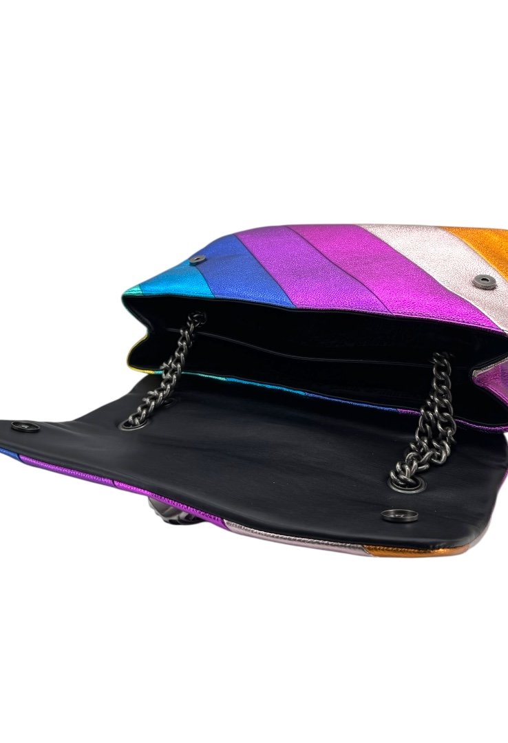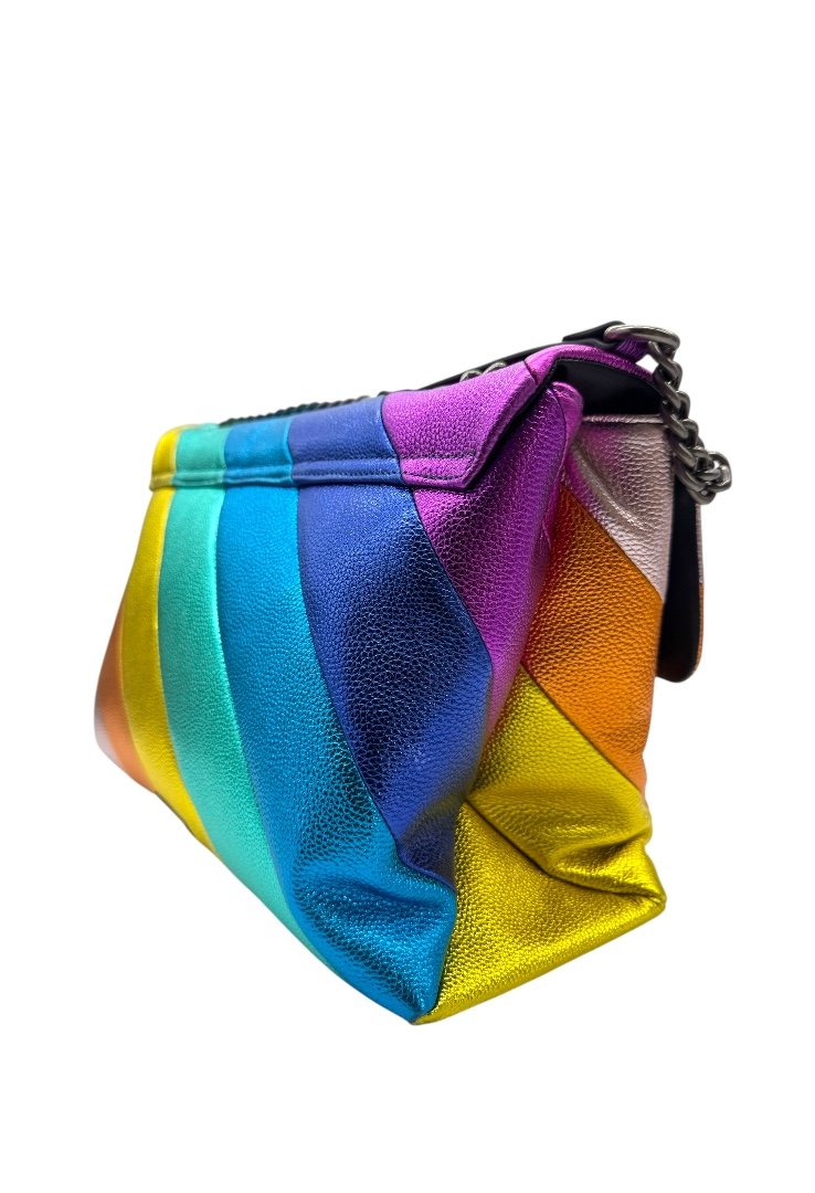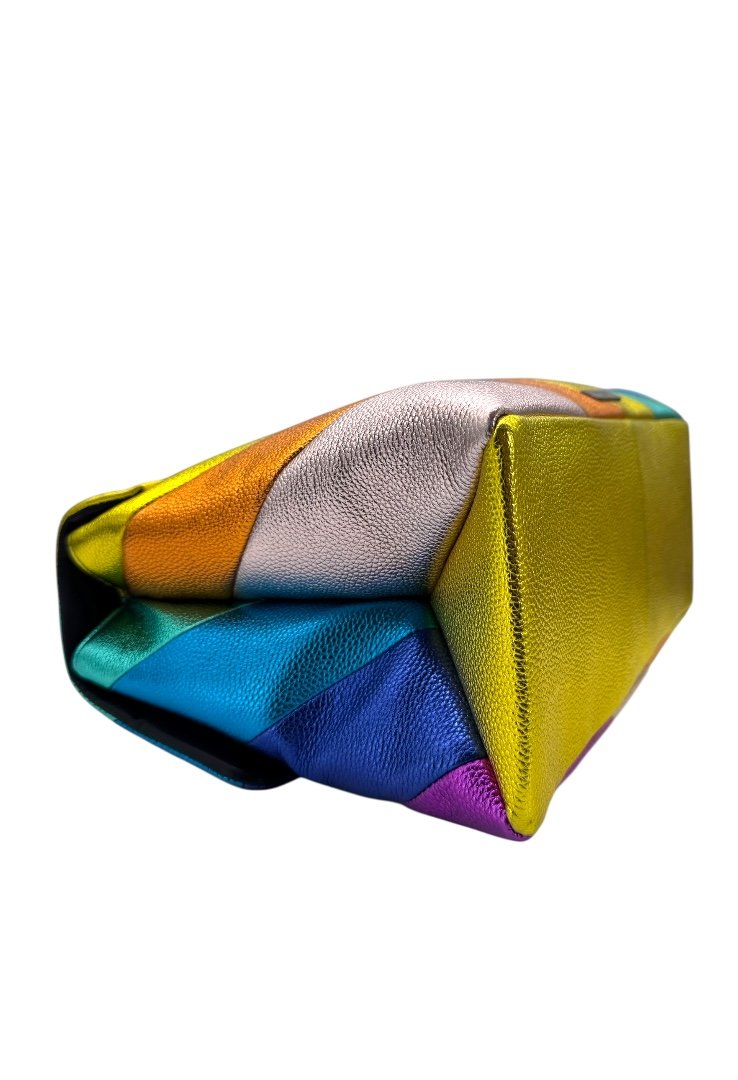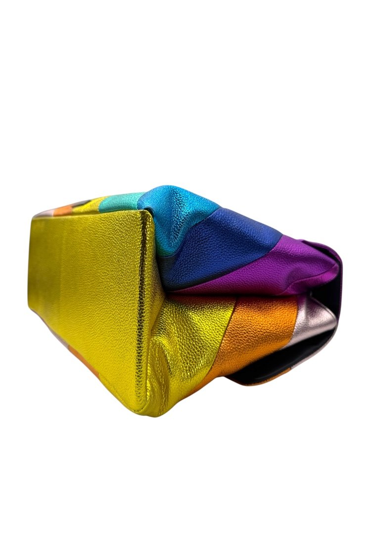 Bolsa elaborado en piel de vacuno granulada, metalizada con el patrón de rayas diagonales cosidas con arcoíris, apliques en plata.