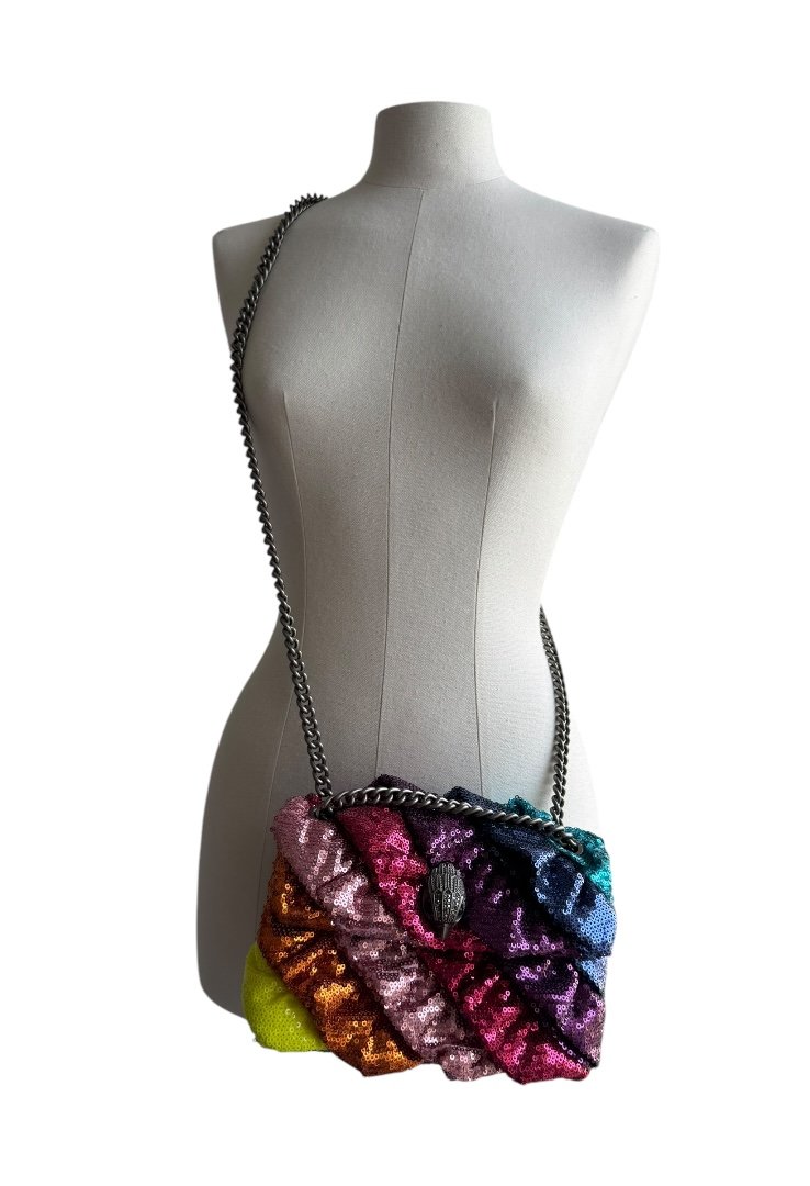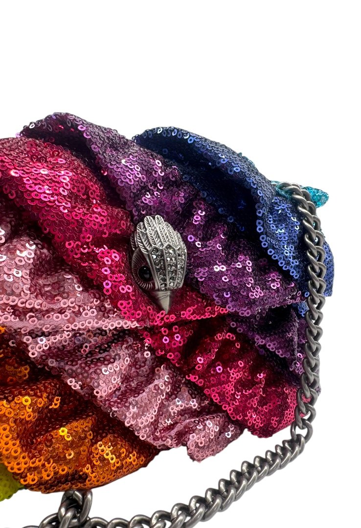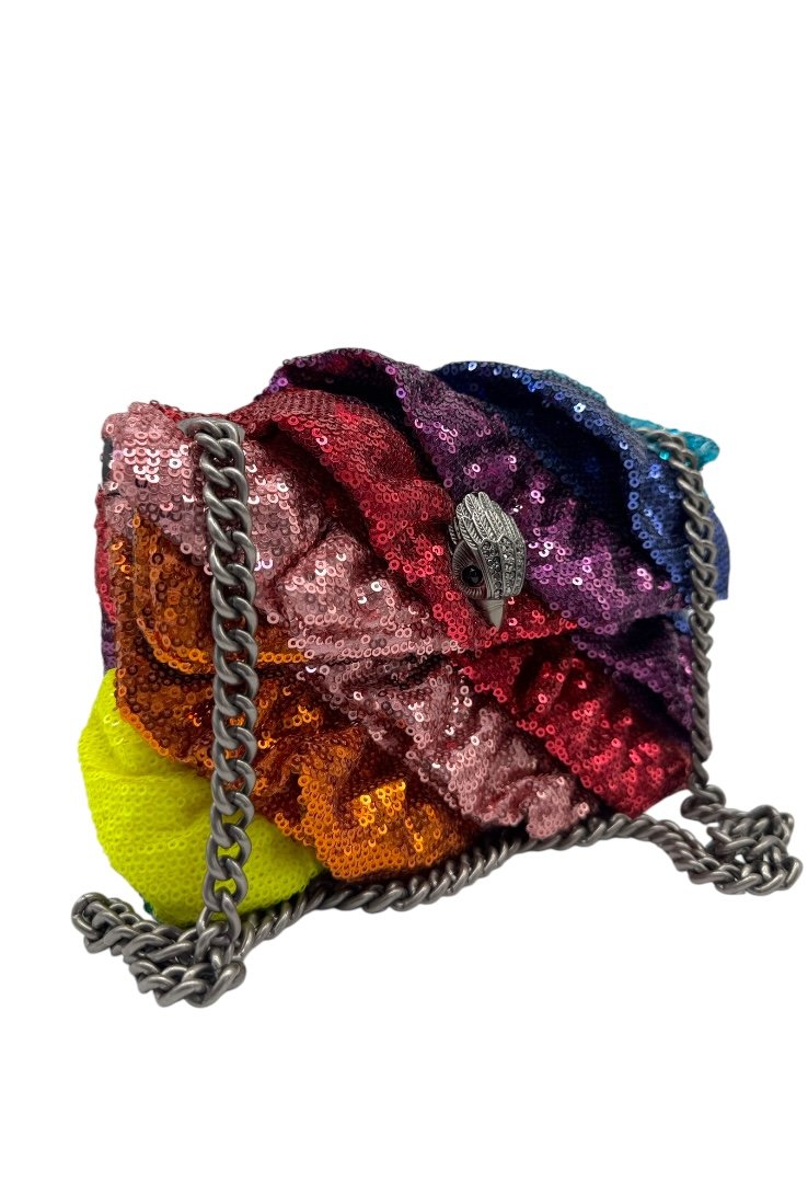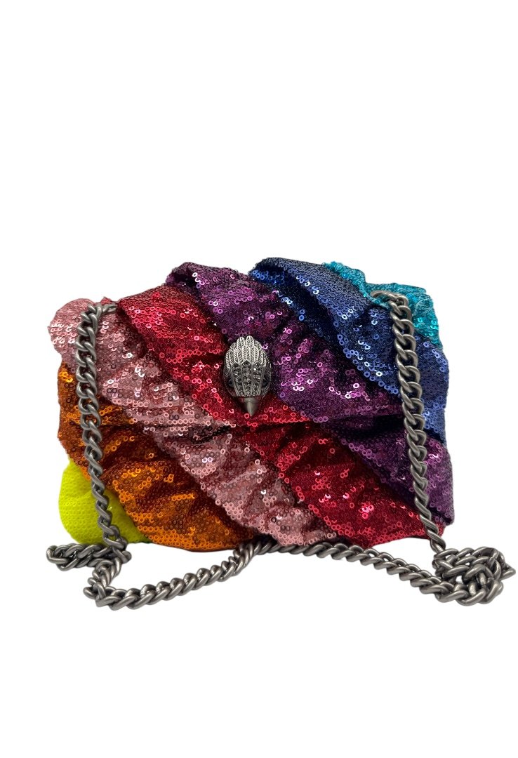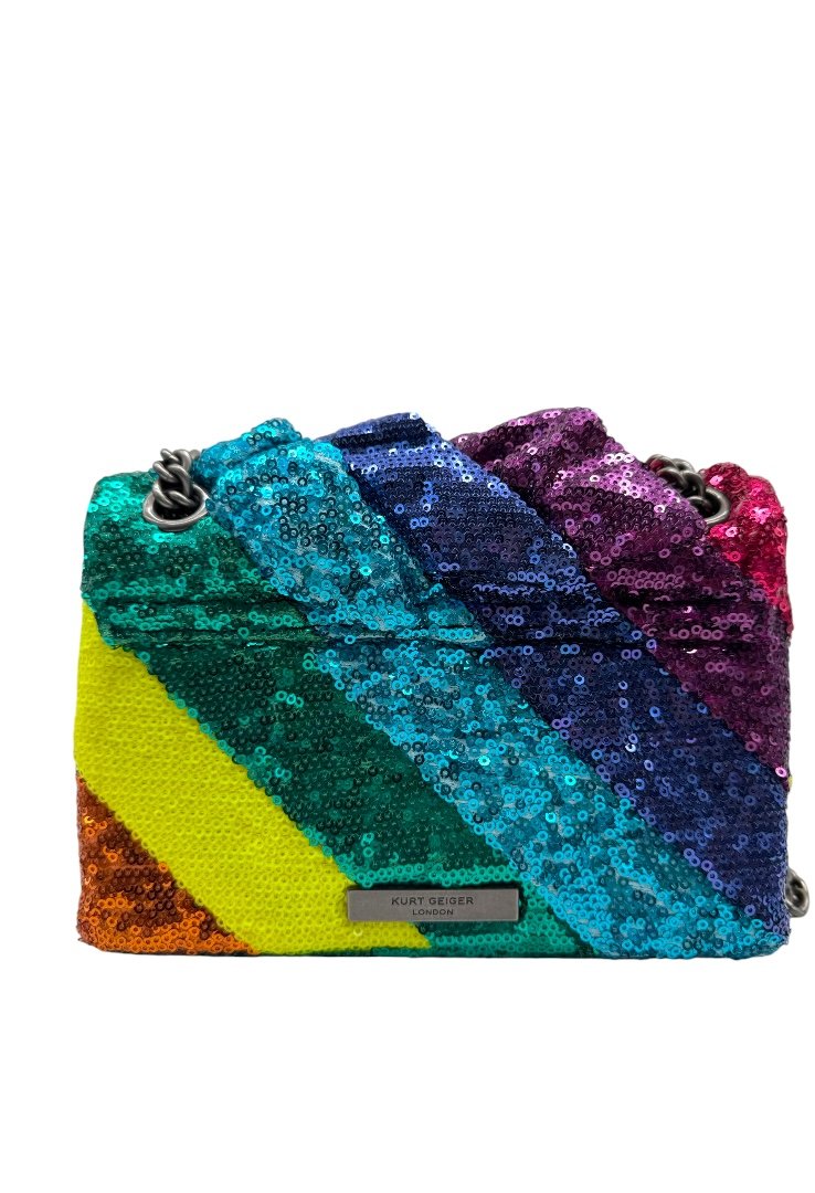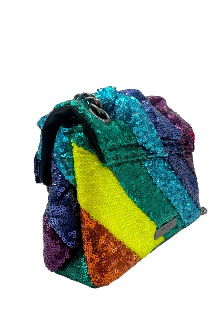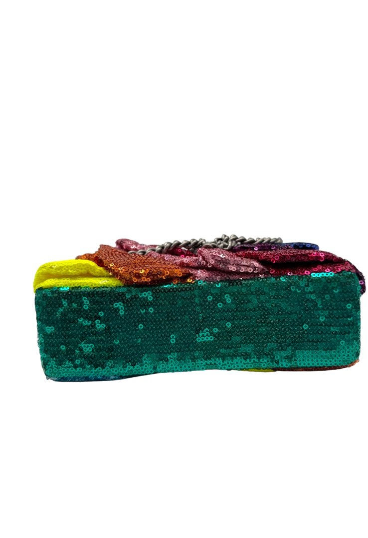 Bolsa elaborado en textil multicolor con aplicación de lentejuelas. Asa de cadena en plata, cierre en solapa con botón magnético.