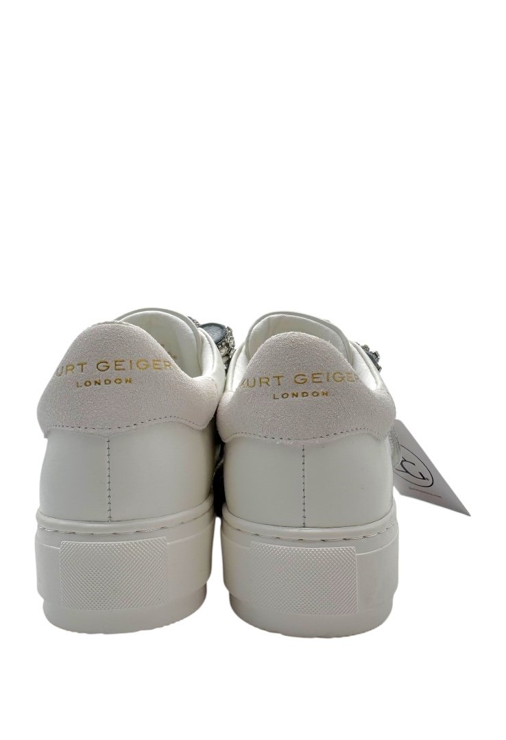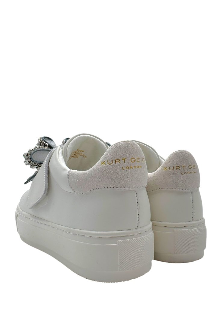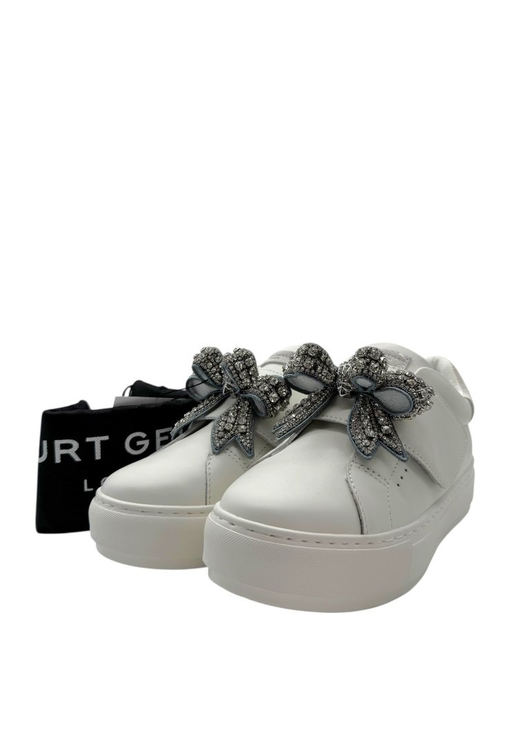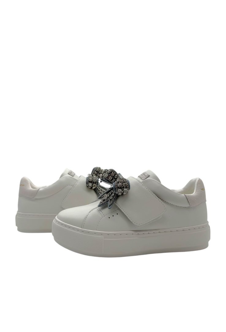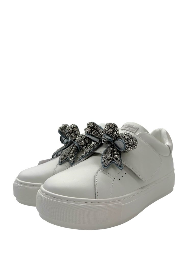 Sneakers elaborados de piel, con detalle de moño con pedrería incrustada.