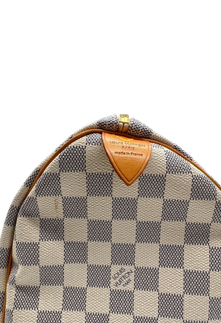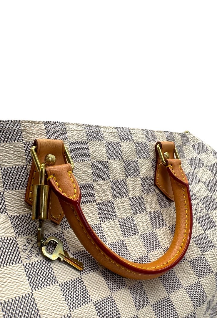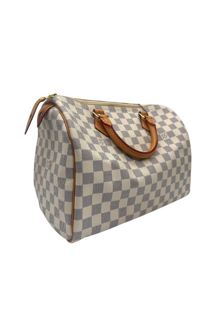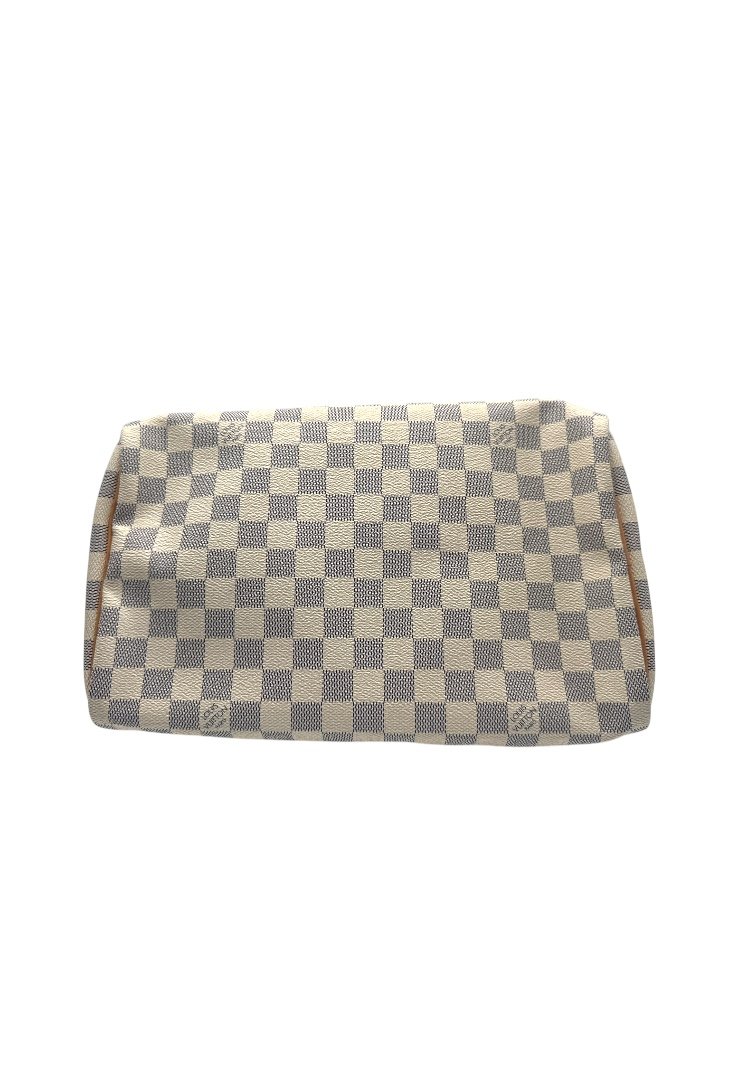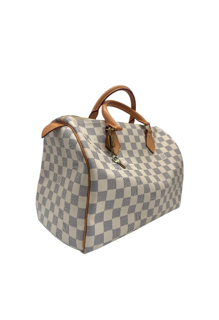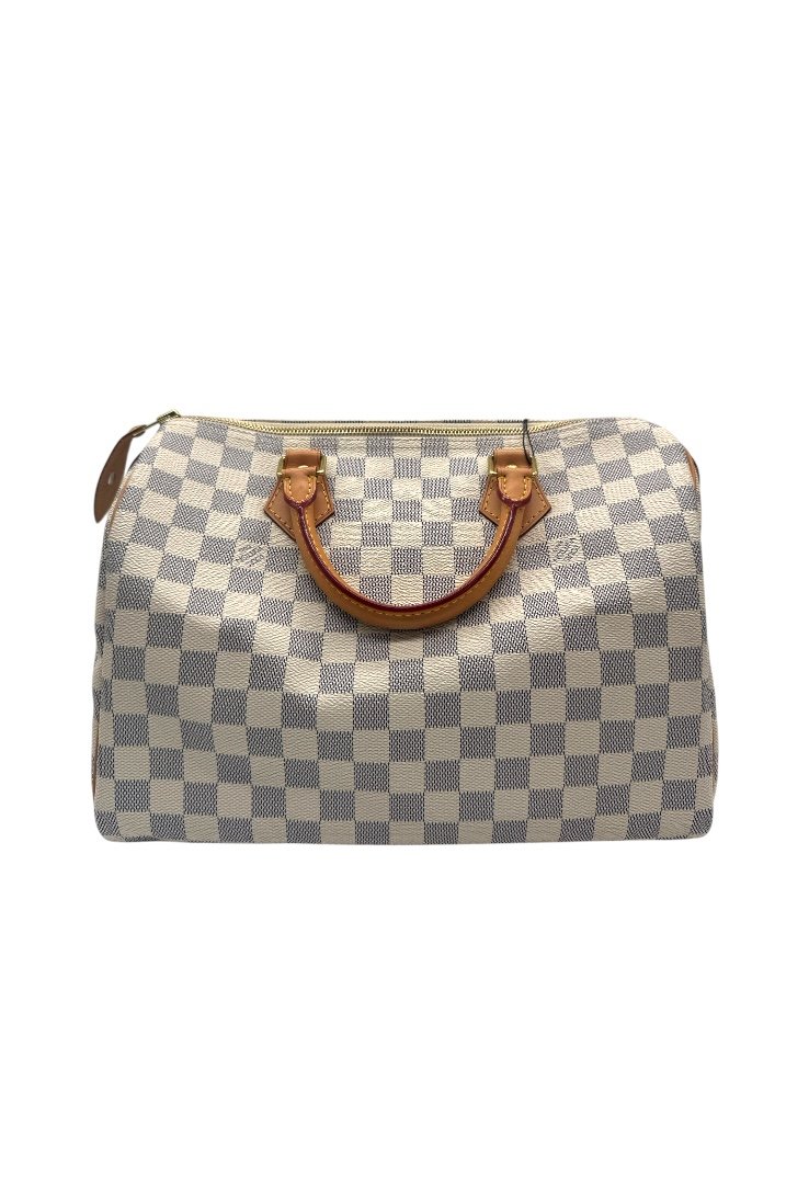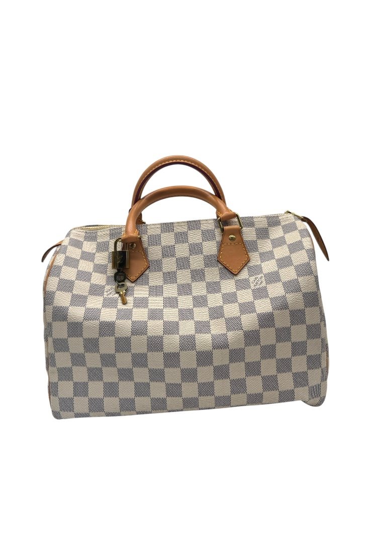 Bolsa de canvas dammier de la marca, asas en color café, con herrajes en dorado.