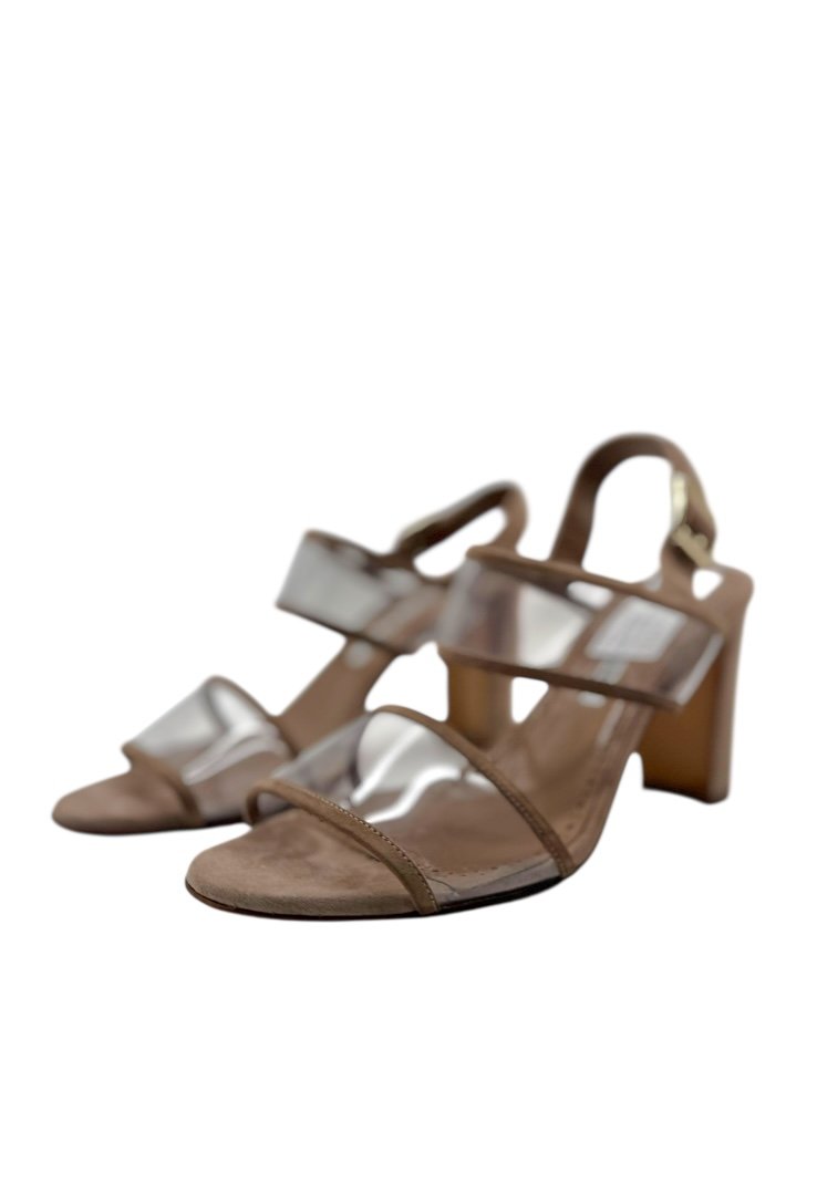 Tacones elaborados de gamuza, con straps transparentes, bordes reforzados en gamuza, aplique en dorado.