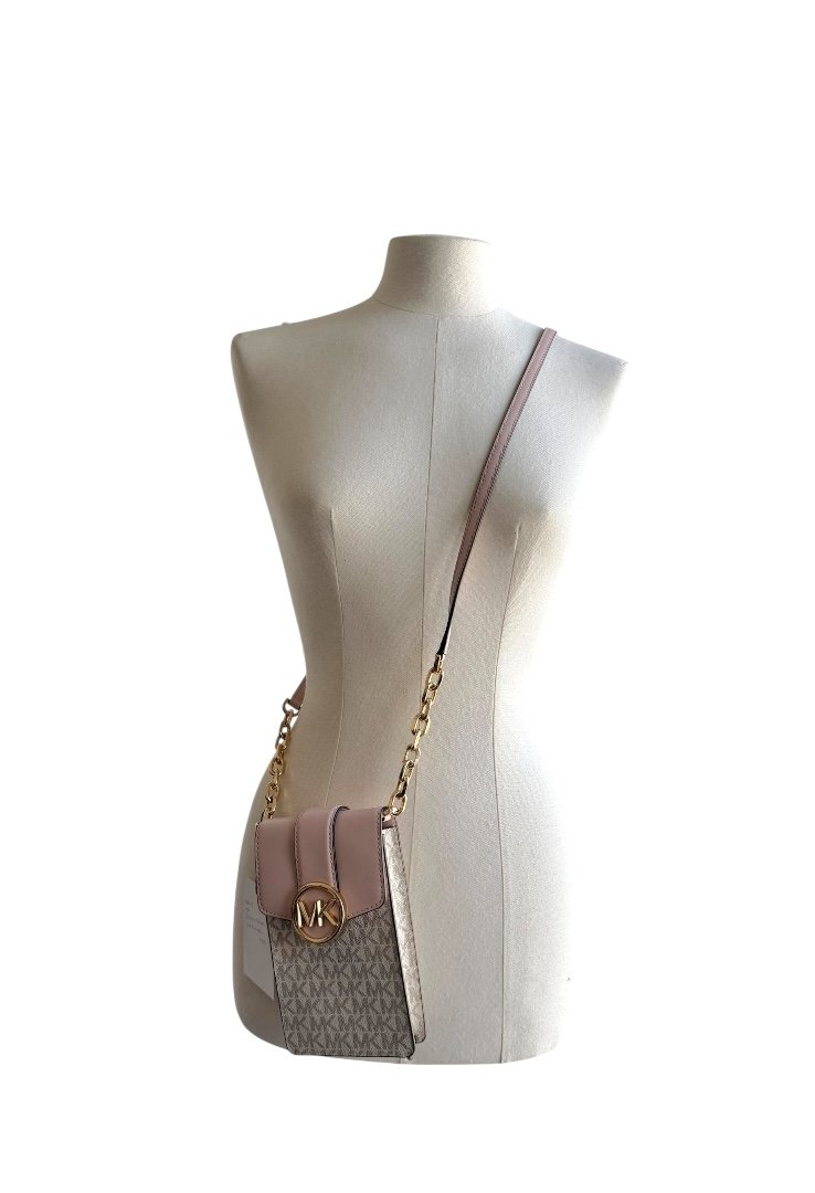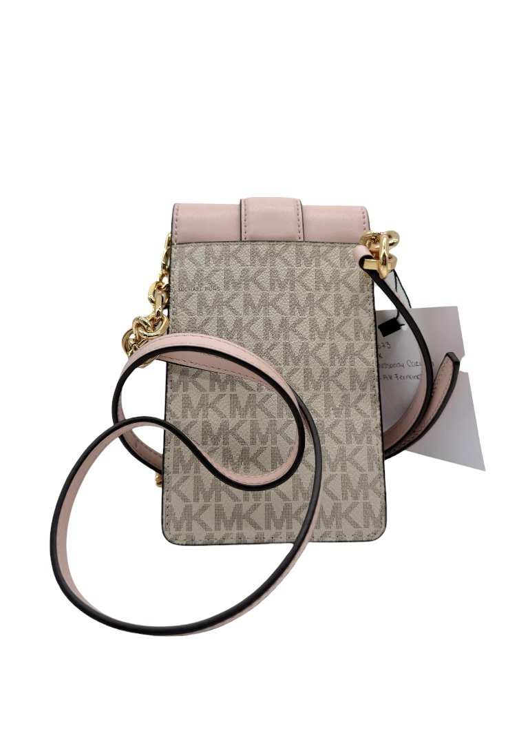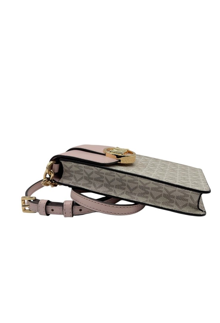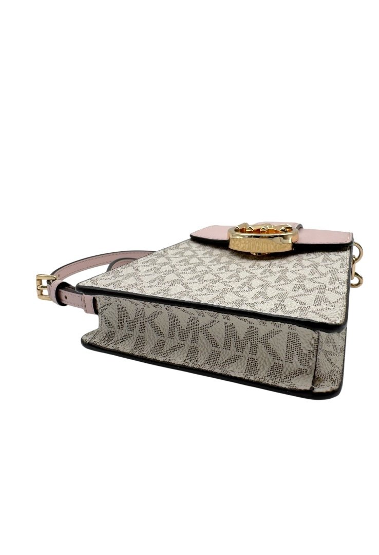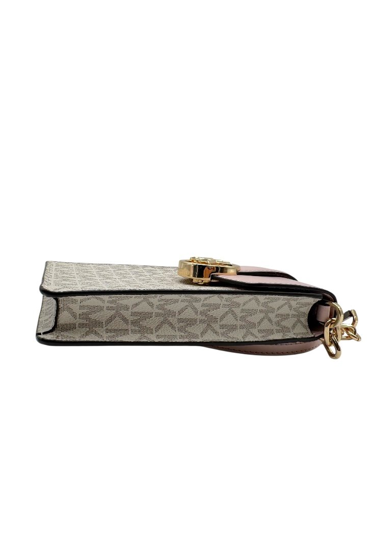 Bandolera hecha de lona monogram, solapa de piel, asa de cadena con piel, cierre con botón magnético, compartimento externo abierto.