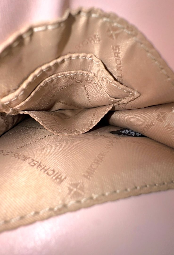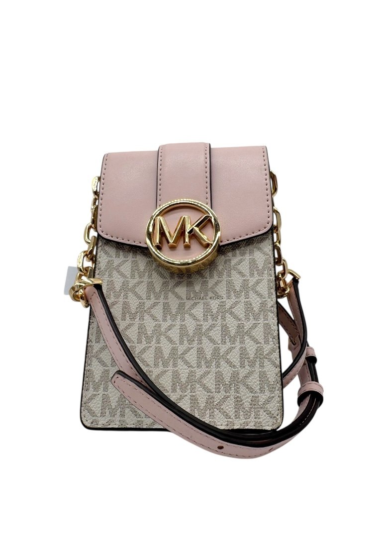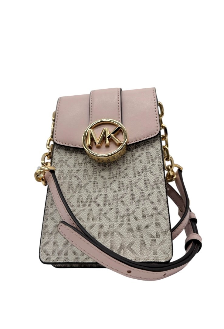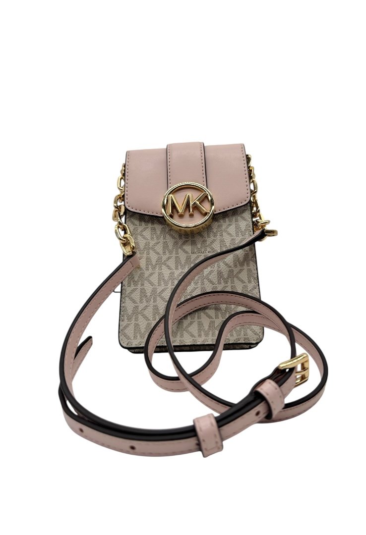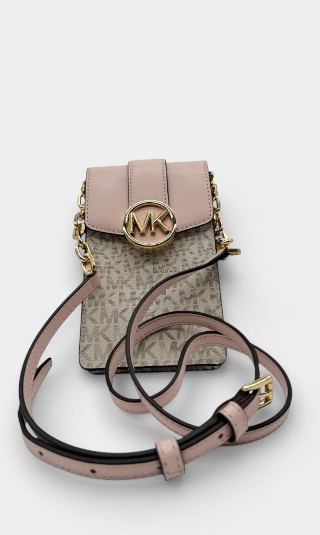 Bandolera hecha de lona monogram, solapa de piel, asa de cadena con piel, cierre con botón magnético, compartimento externo abierto.