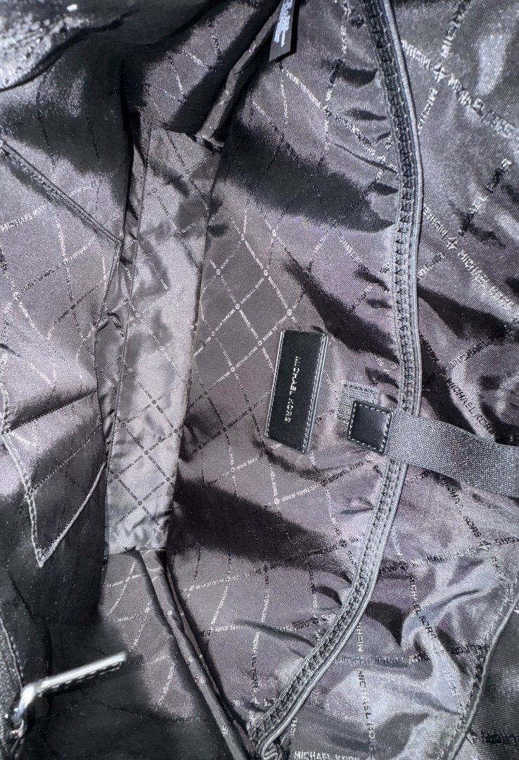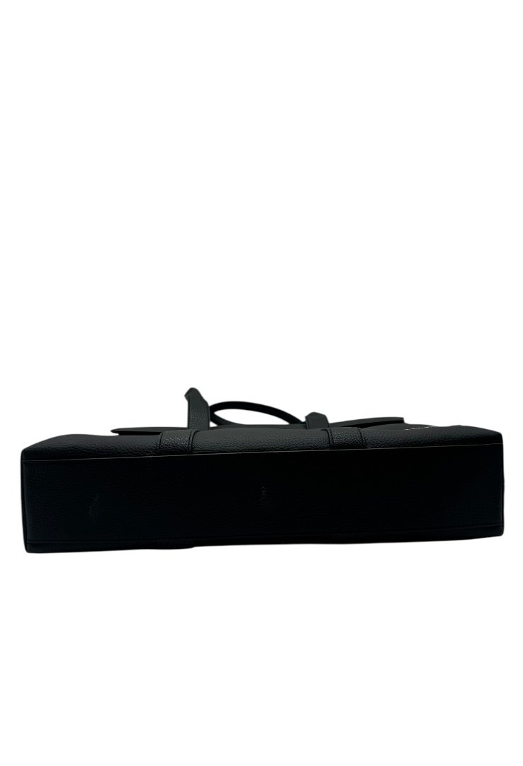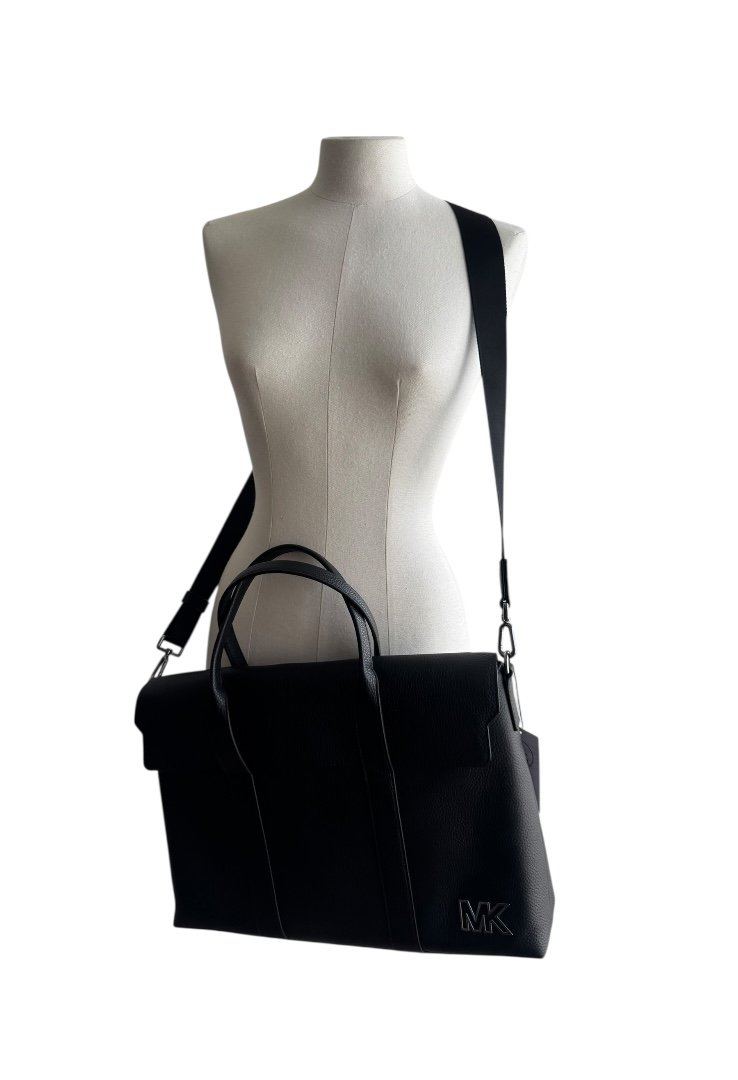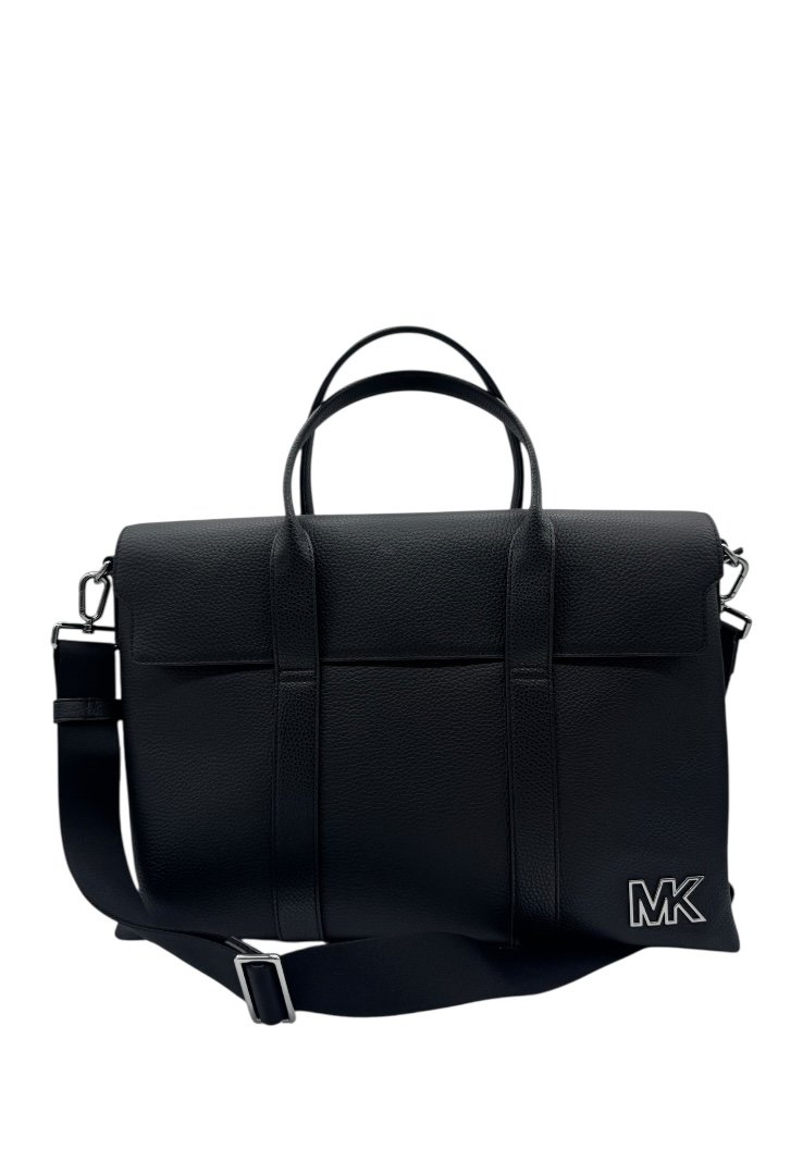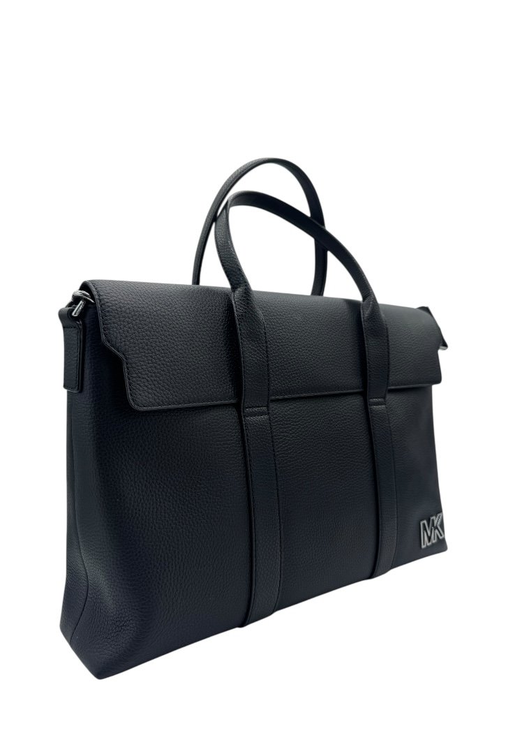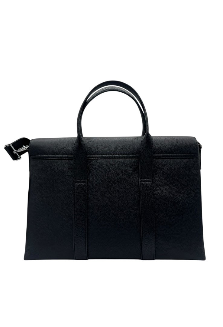 Portafolio elaborado en piel granulada, apliques en plata, cierre en solapa con botón magnético, asa ajustable.