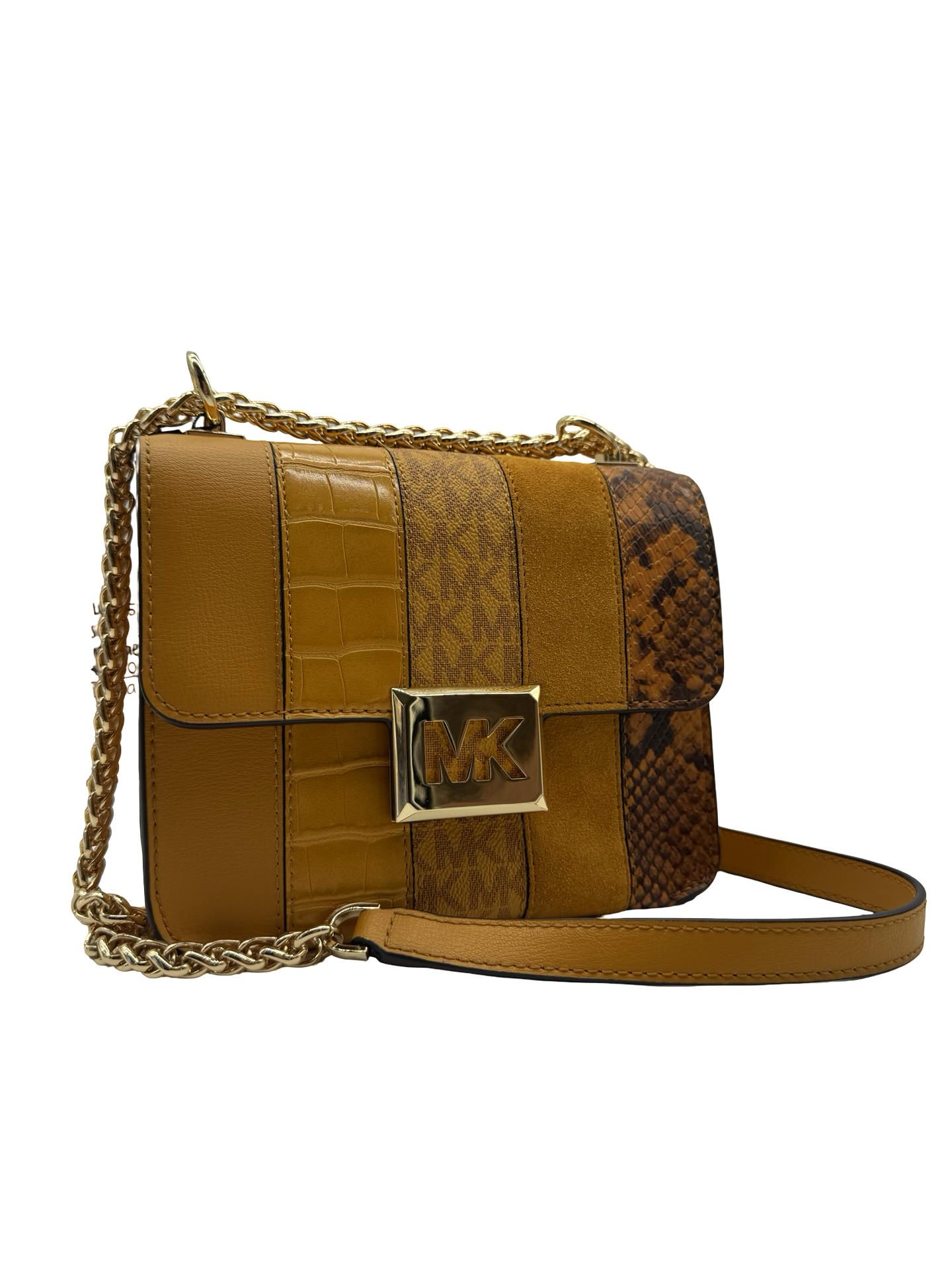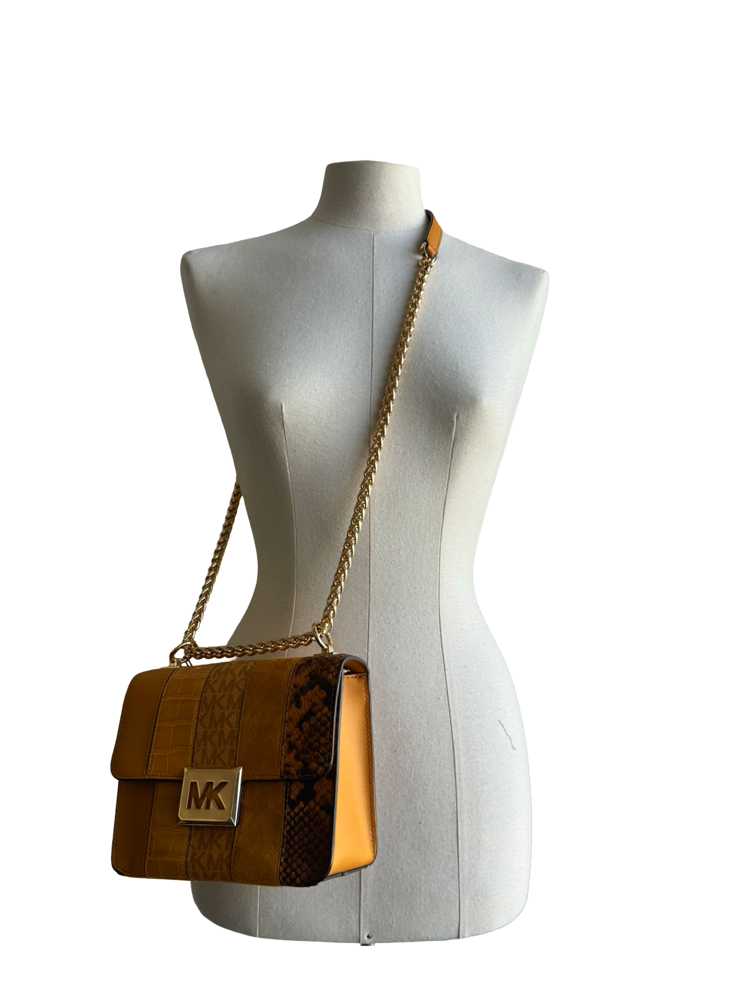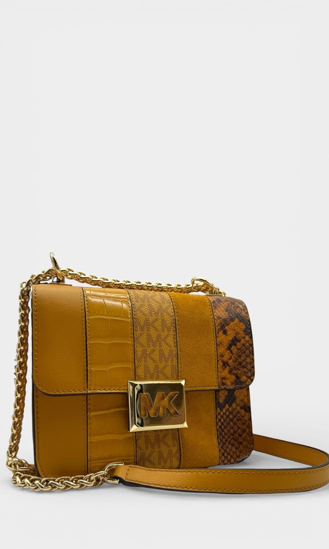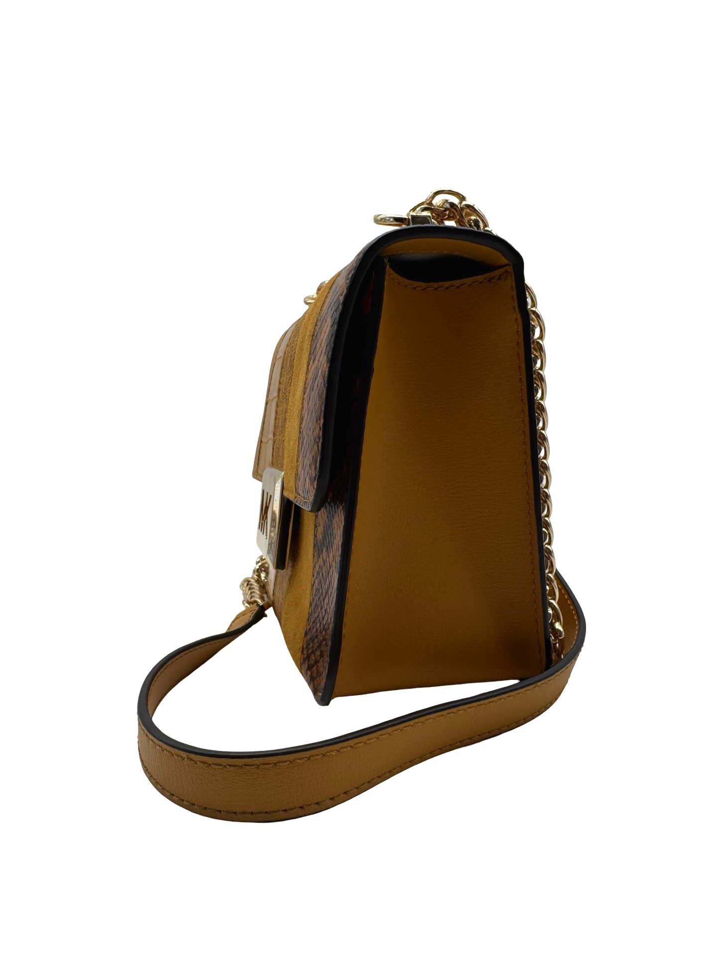 Fabricado en piel, ante e imitación de vibora, lona con estampado de la marca. El asa de piel y cadena excelente para llevarla cruzada o al hombro. Cierre de solapa imantada. Herrajes y cadena en color dorado.