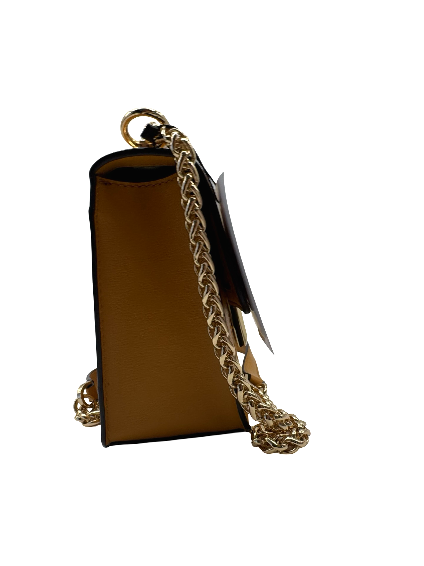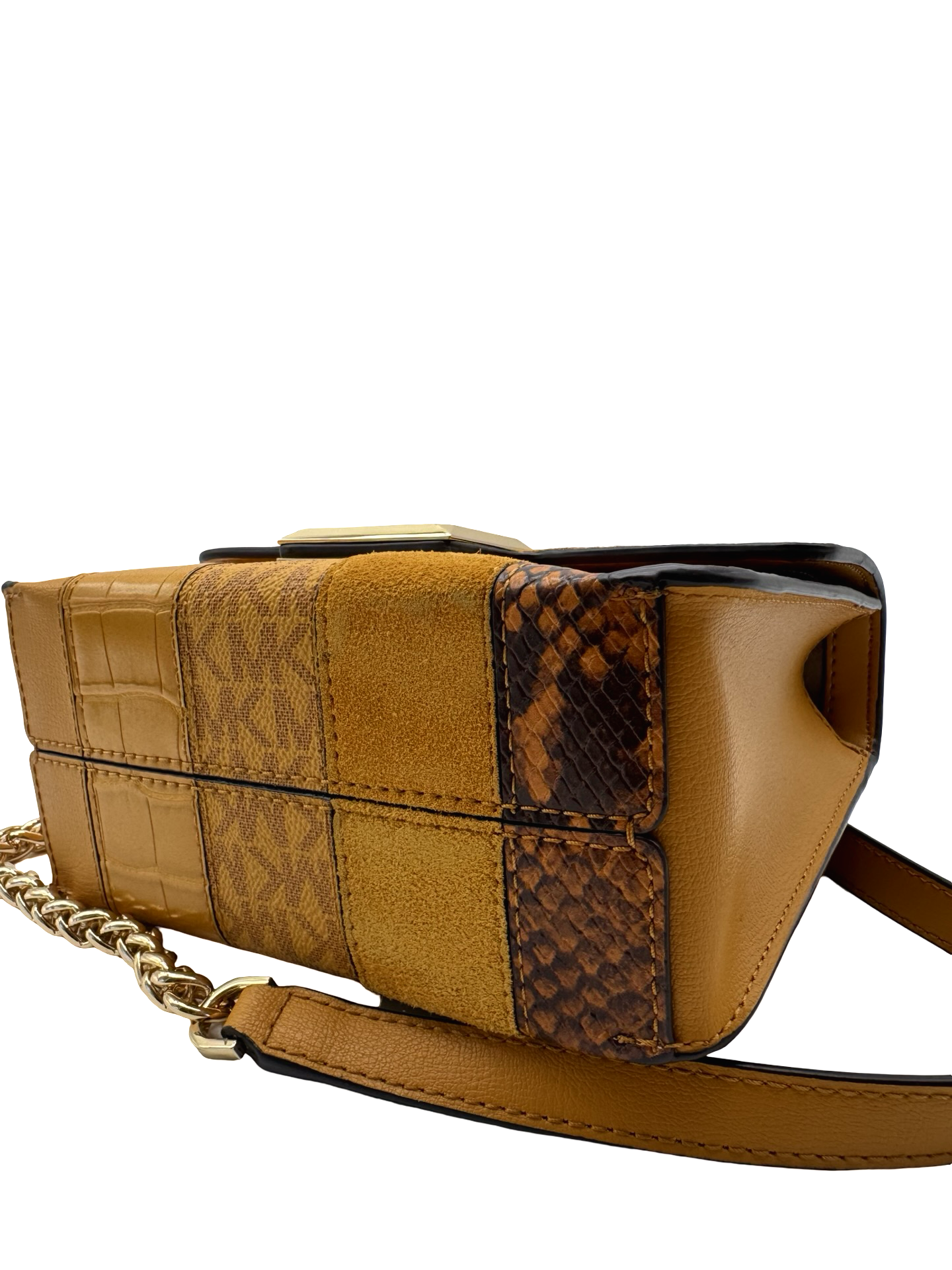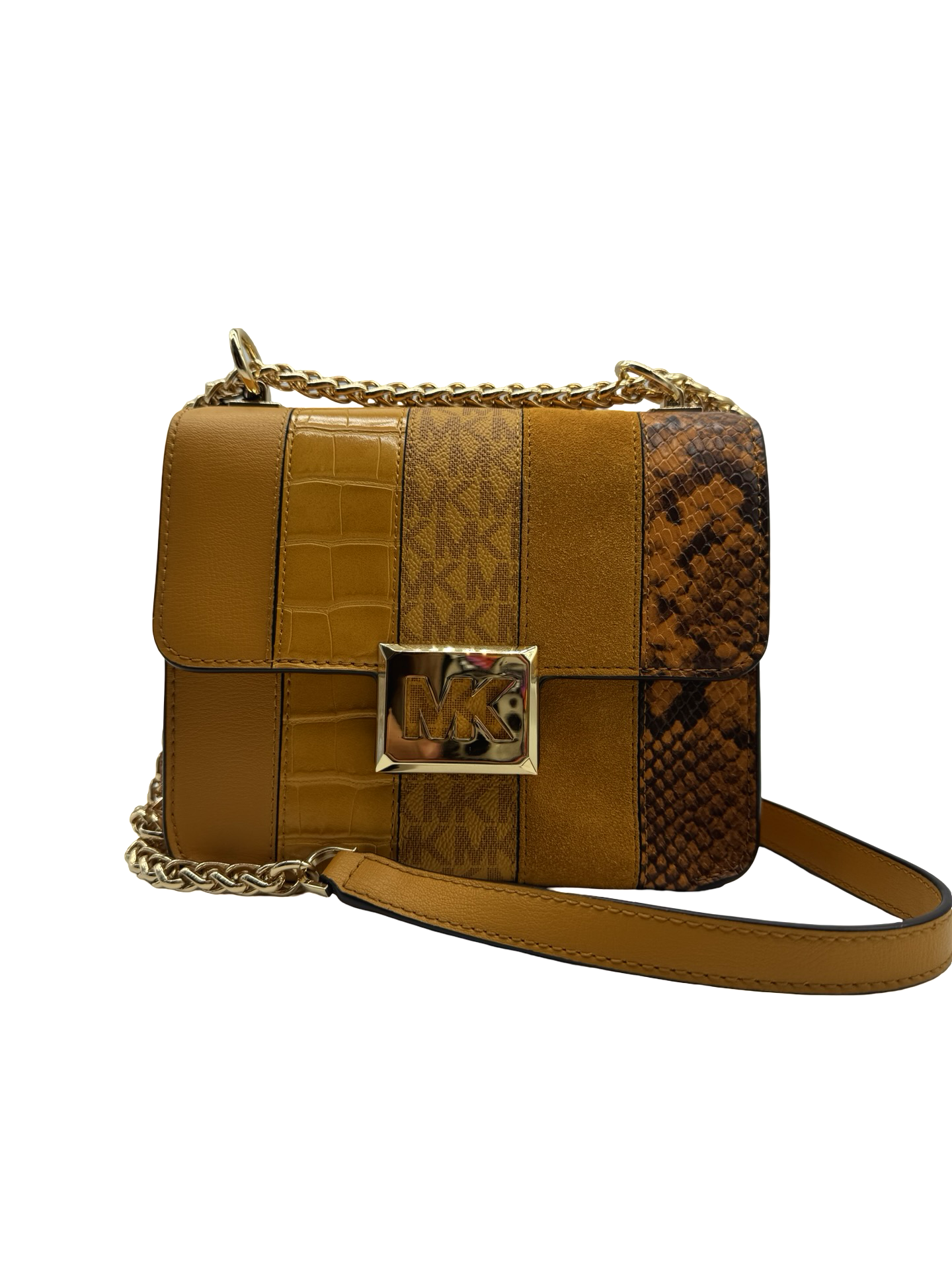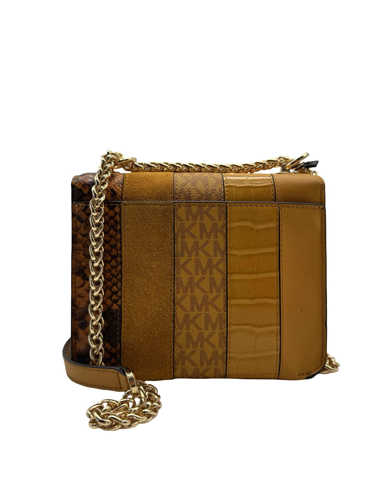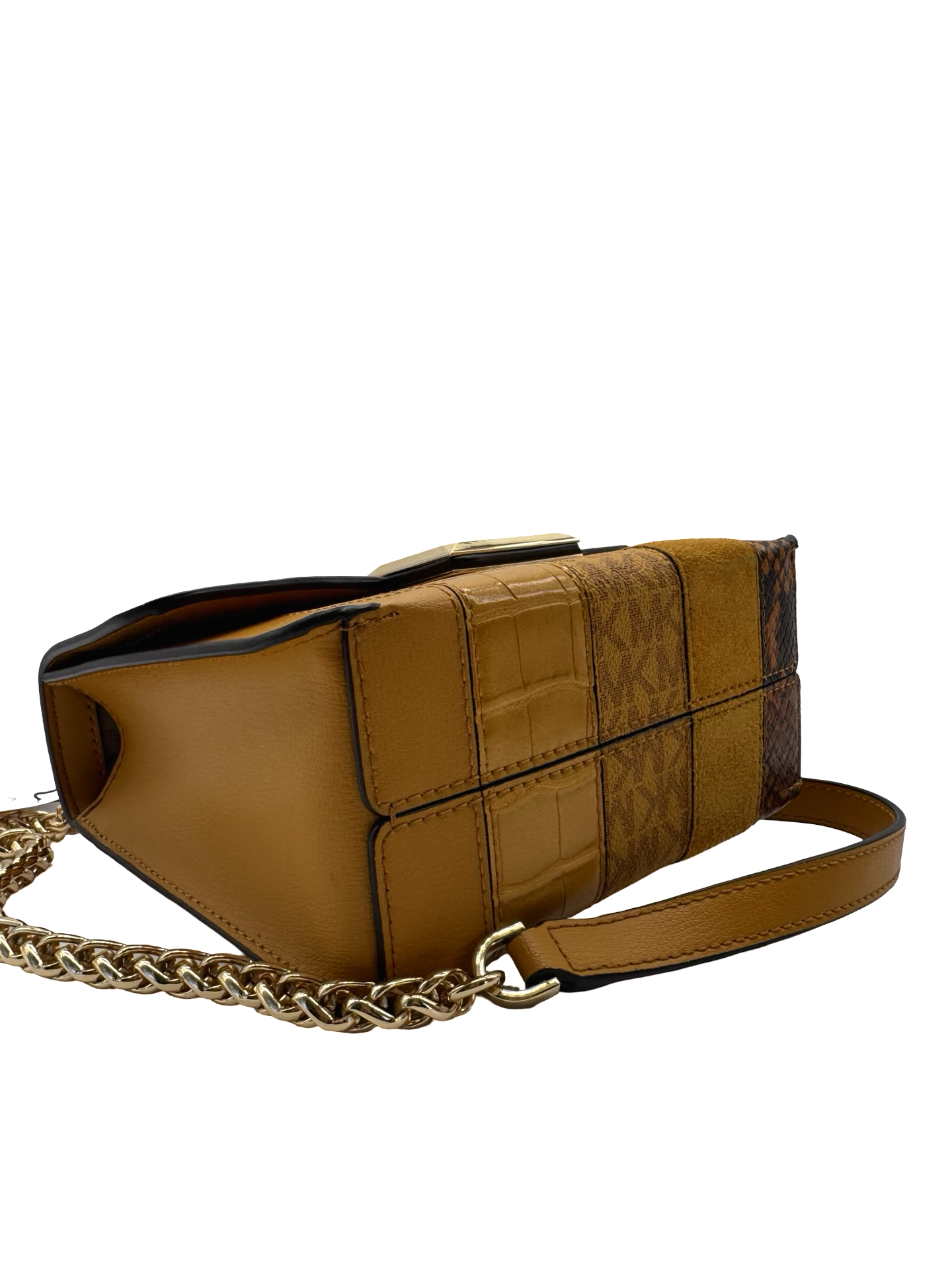 Fabricado en piel, ante e imitación de vibora, lona con estampado de la marca. El asa de piel y cadena excelente para llevarla cruzada o al hombro. Cierre de solapa imantada. Herrajes y cadena en color dorado.