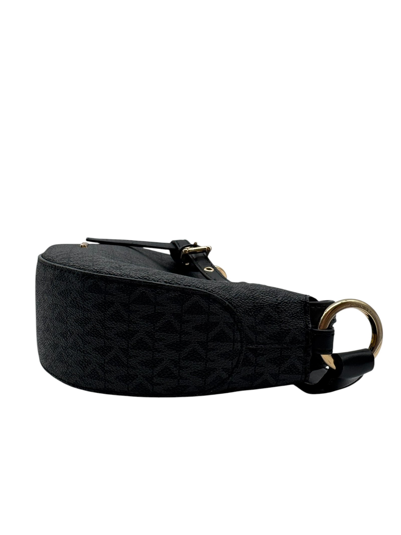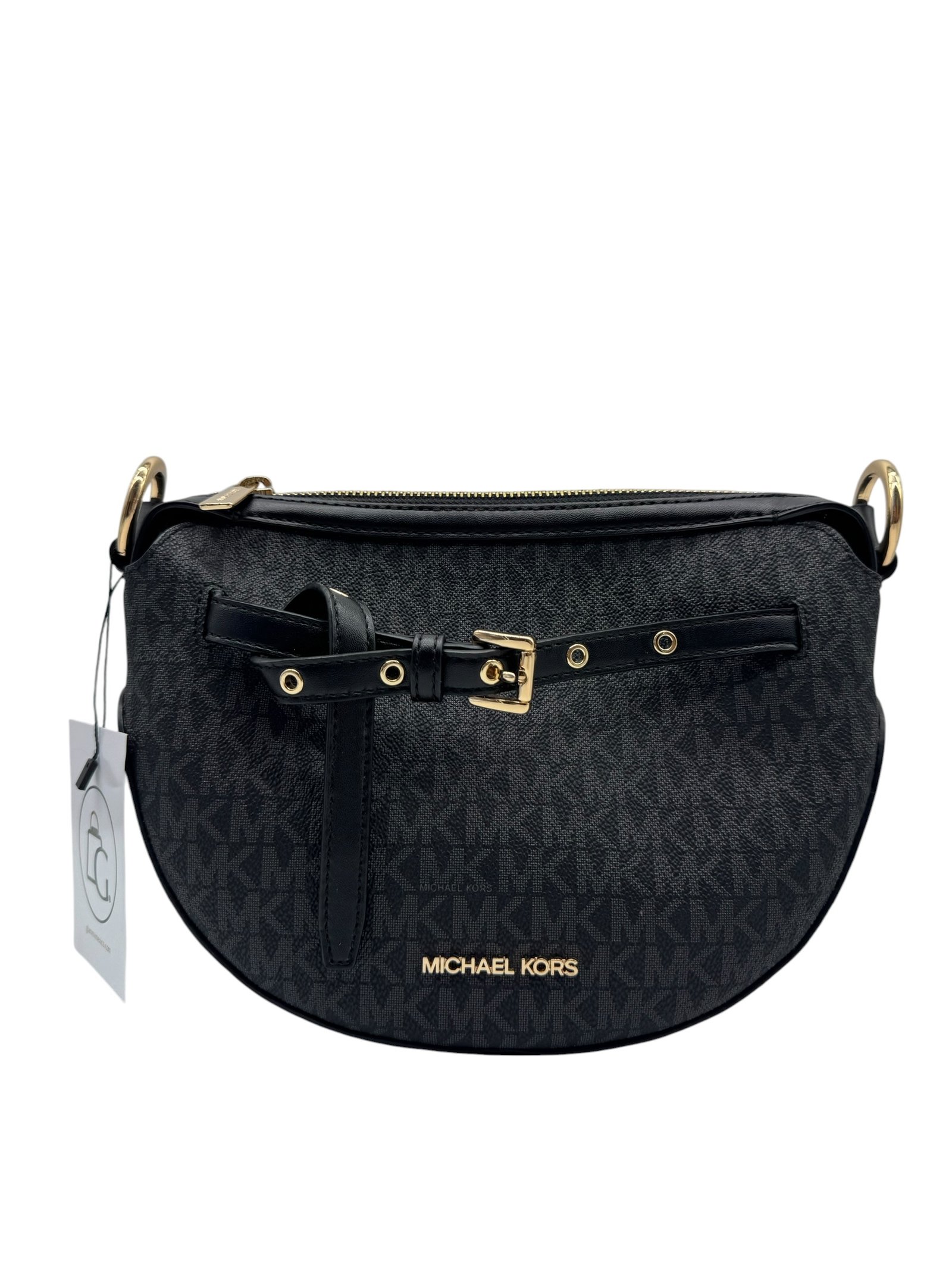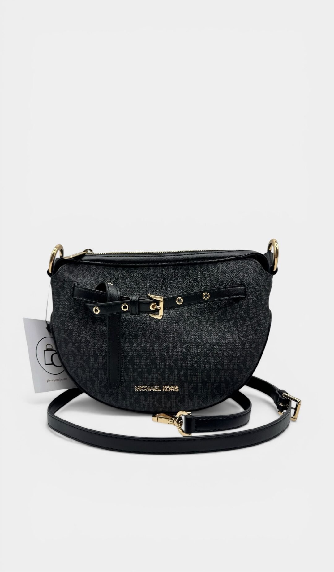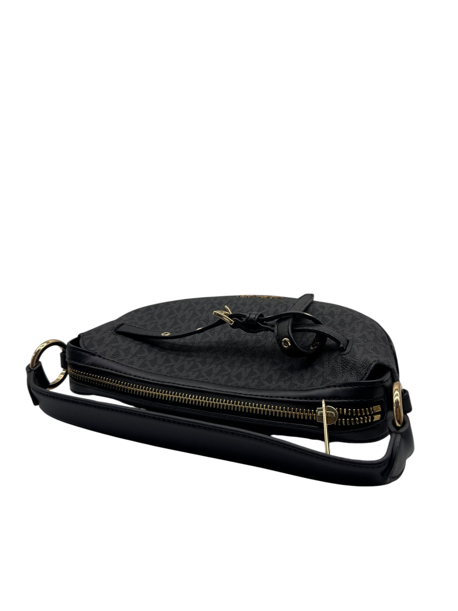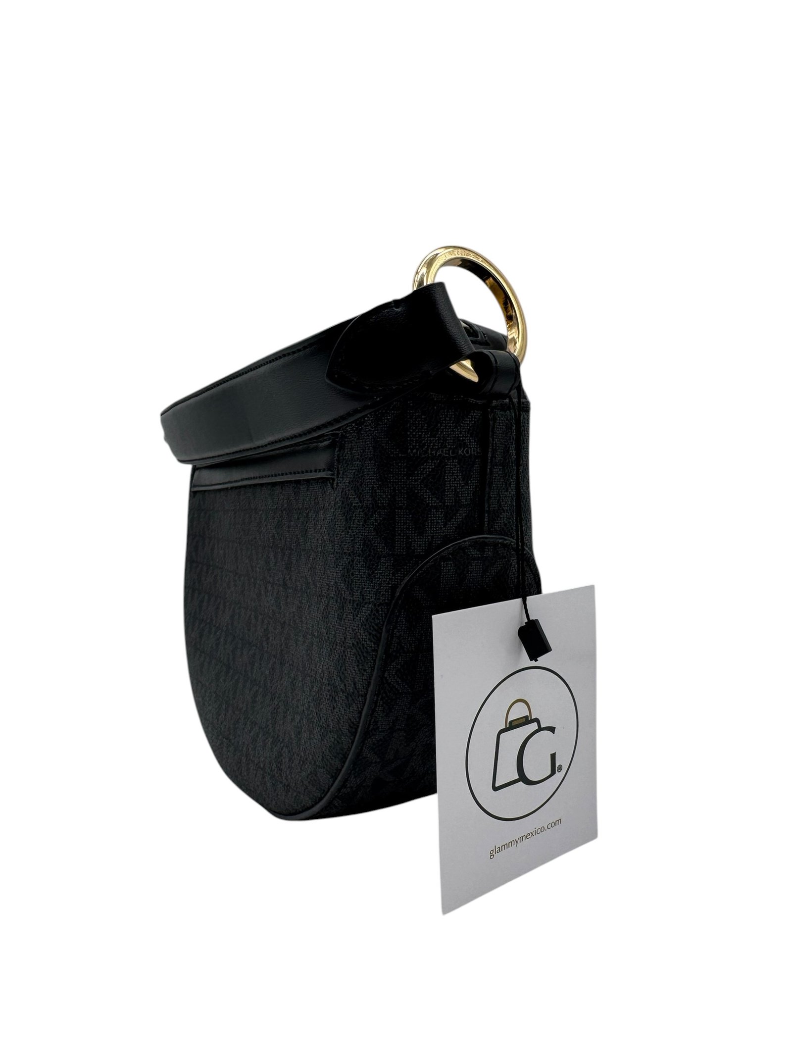 Bolsa elaborada en lona con diseño monogram, herrajes en dorado, detalles en cuerto, compartimento principal con cremallera.