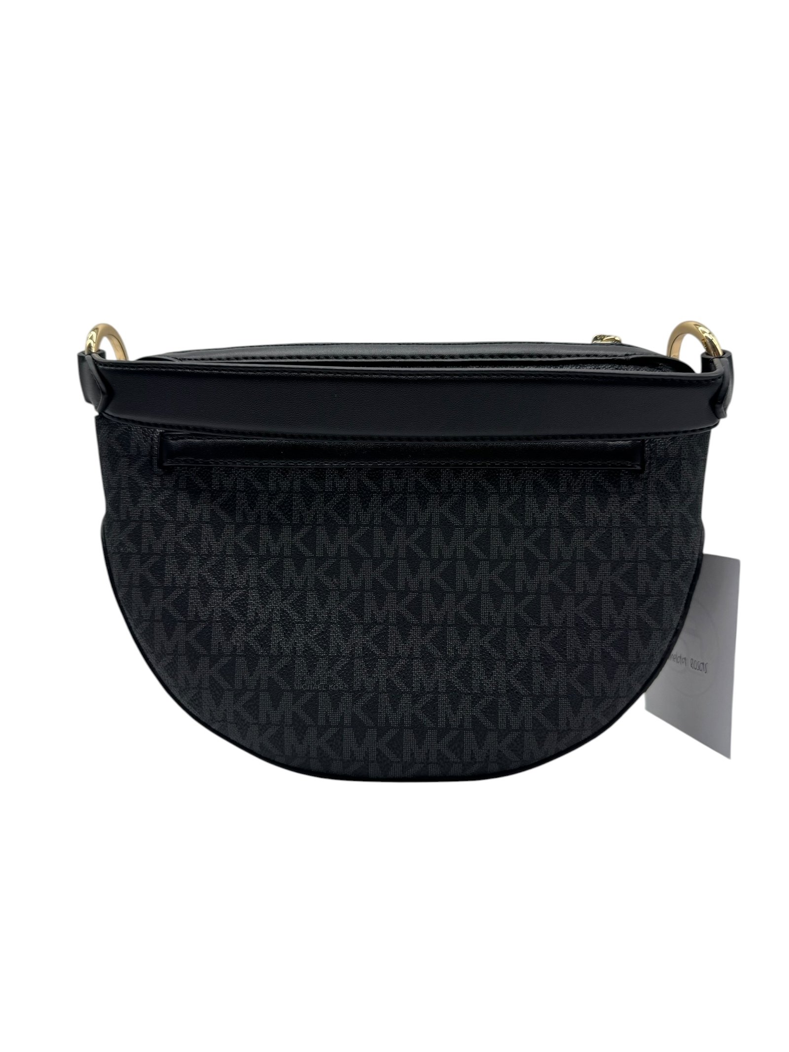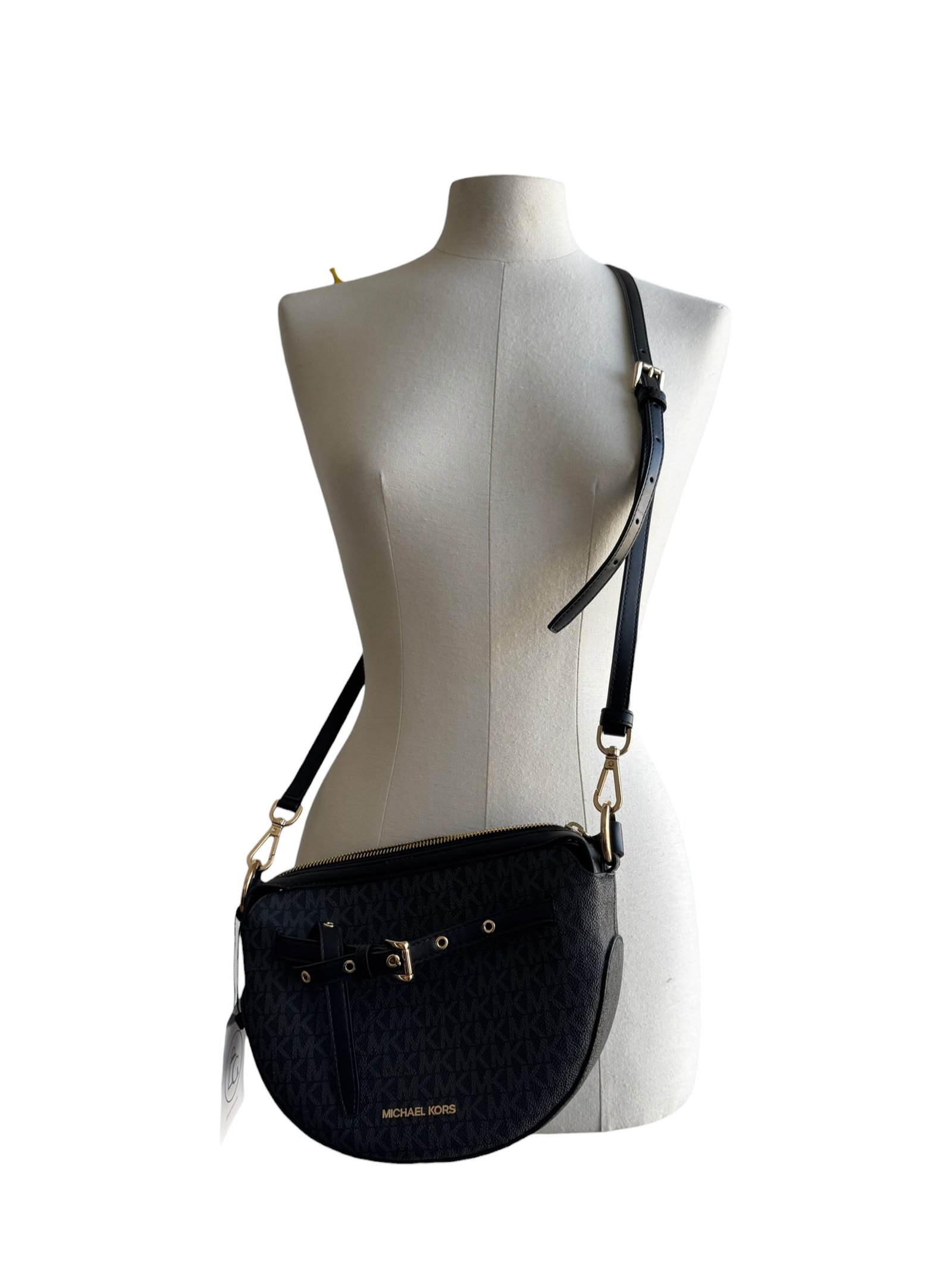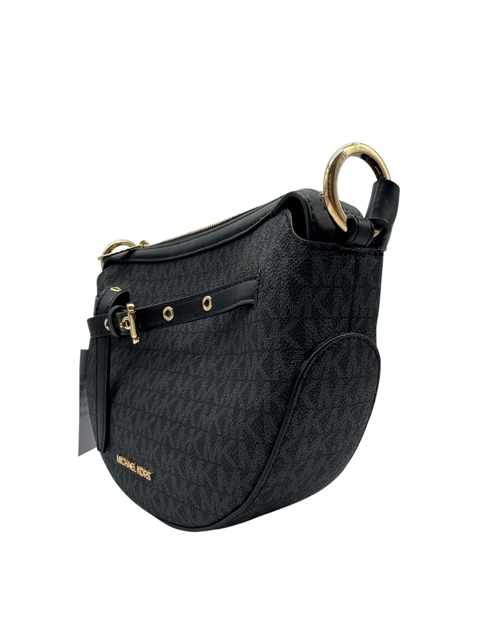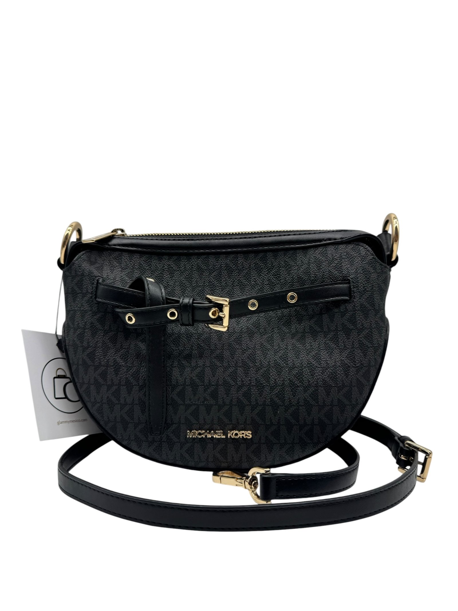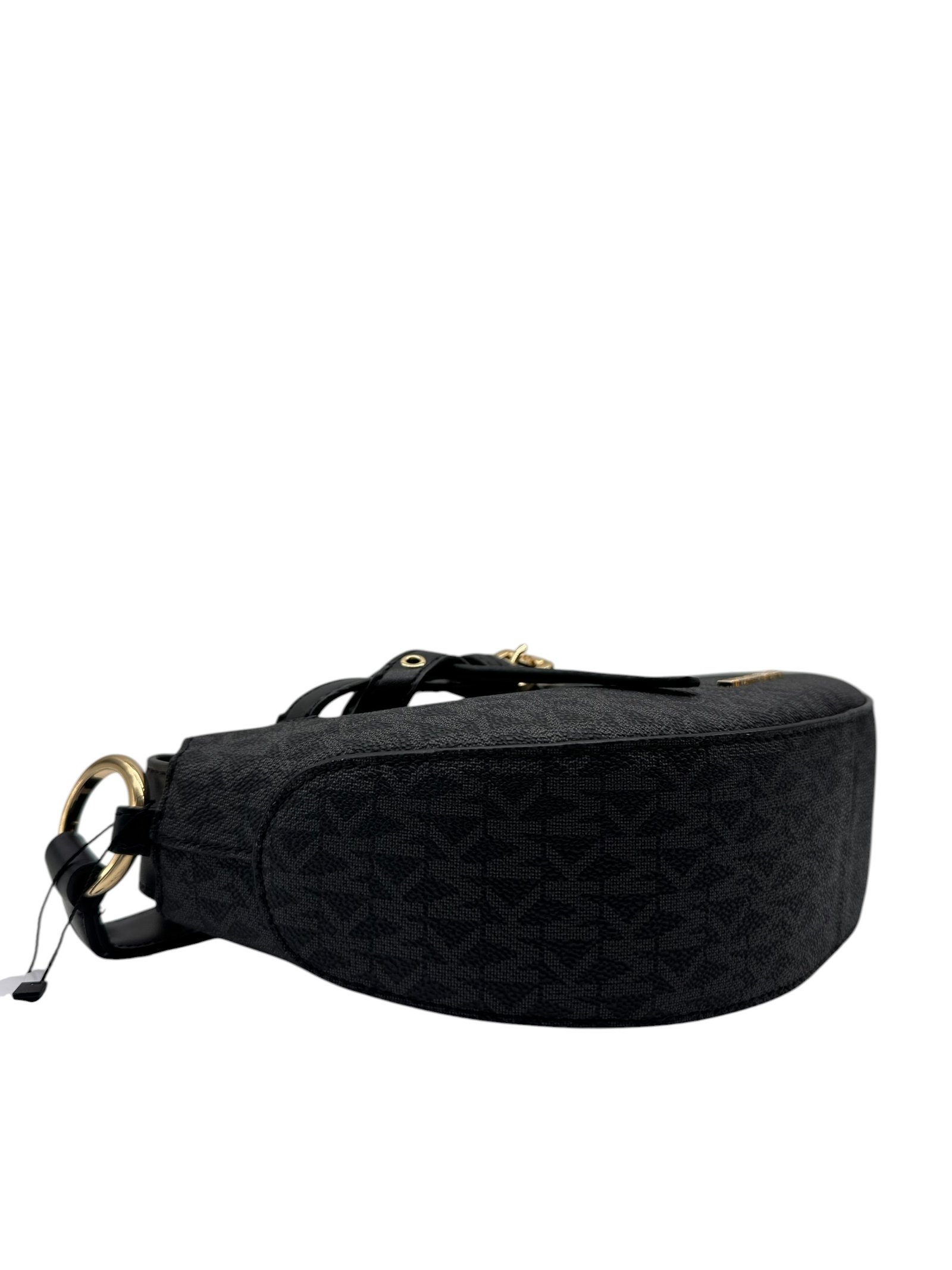 Bolsa elaborada en lona con diseño monogram, herrajes en dorado, detalles en cuerto, compartimento principal con cremallera.