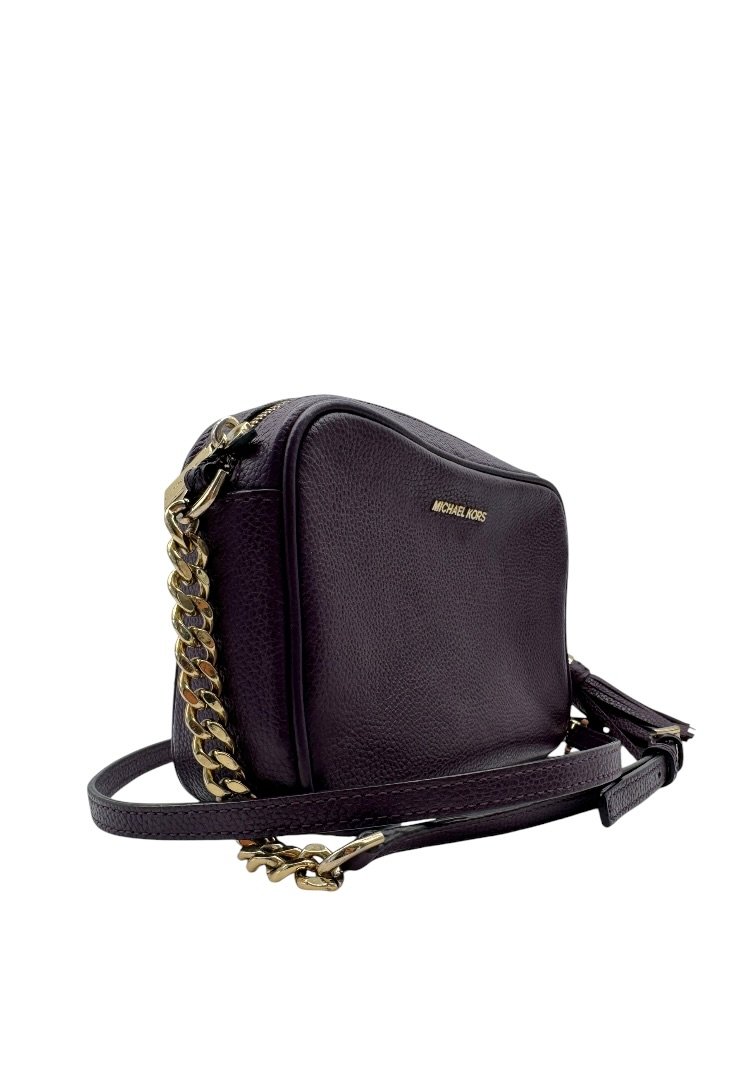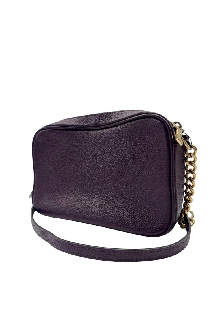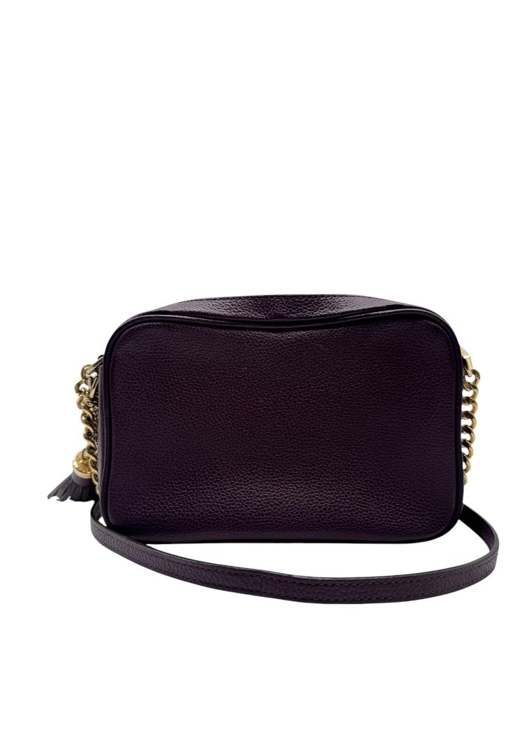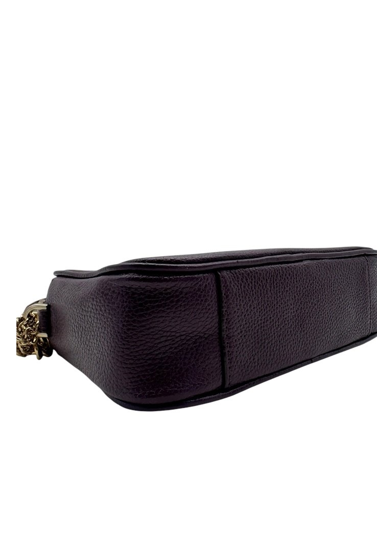 Bolsa elaborada en piel granulada, con herrajes dorados, detalle de cadena en el strap, cierre principal con zipper.