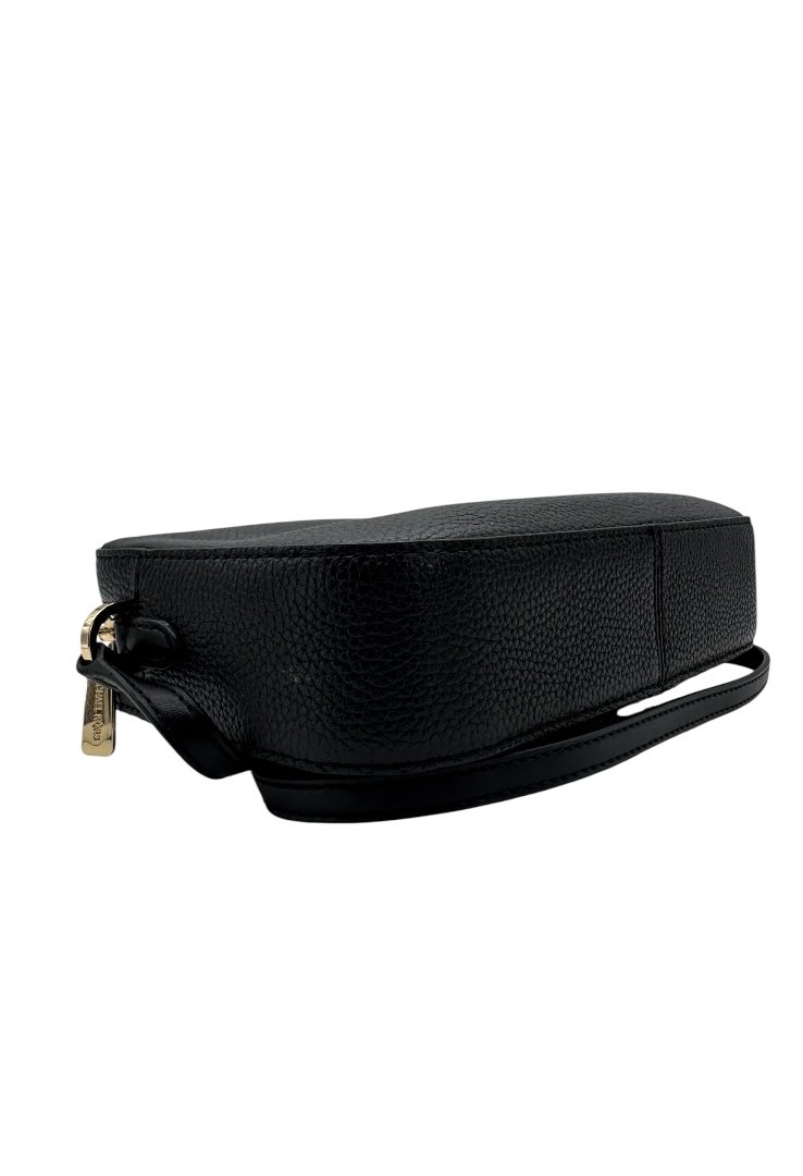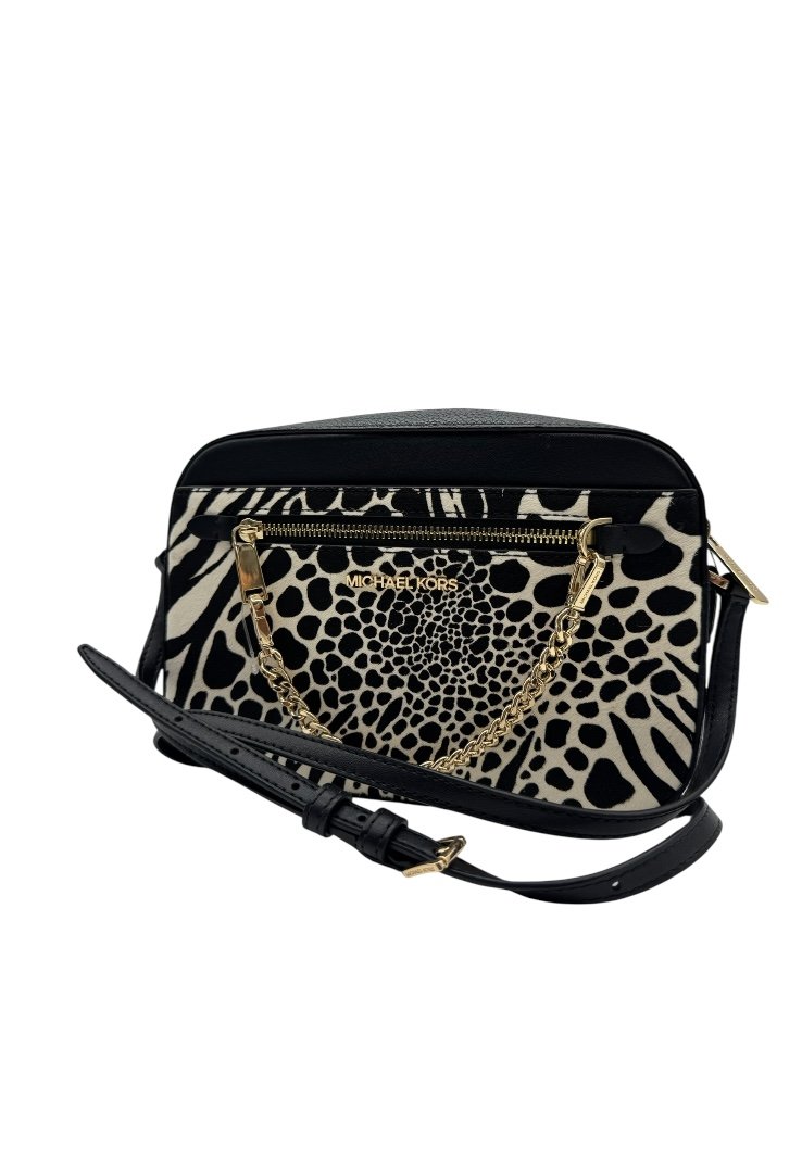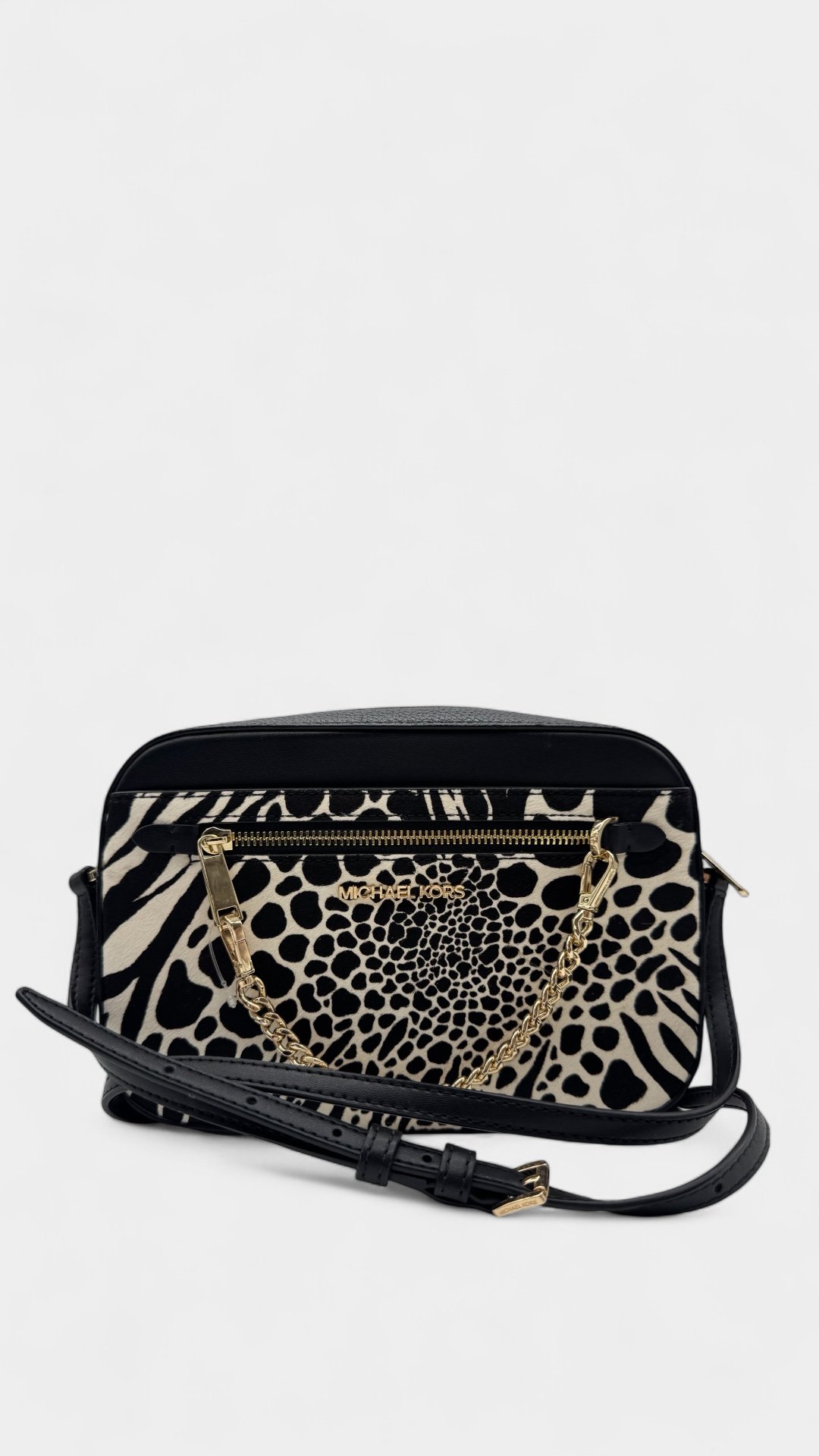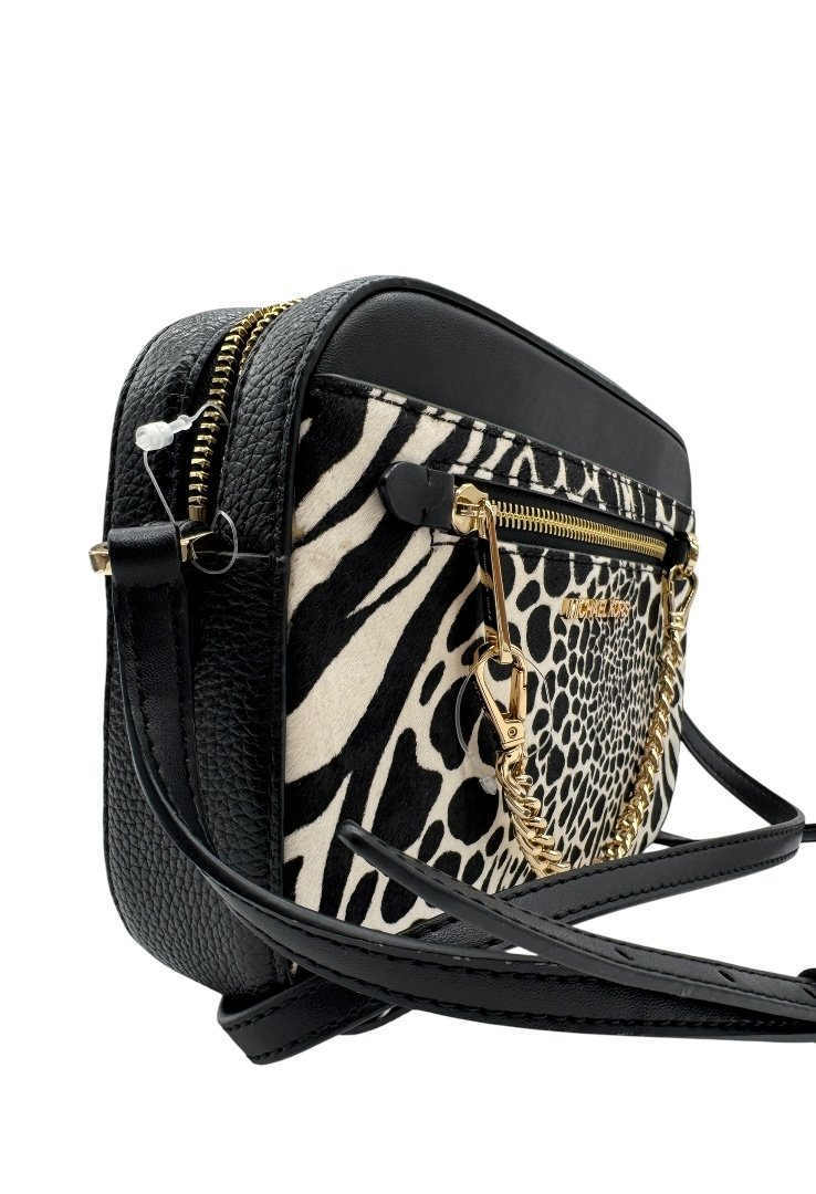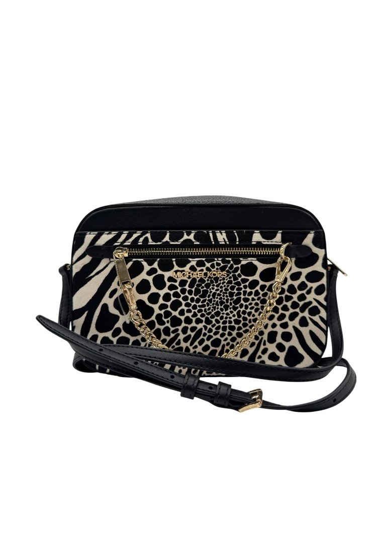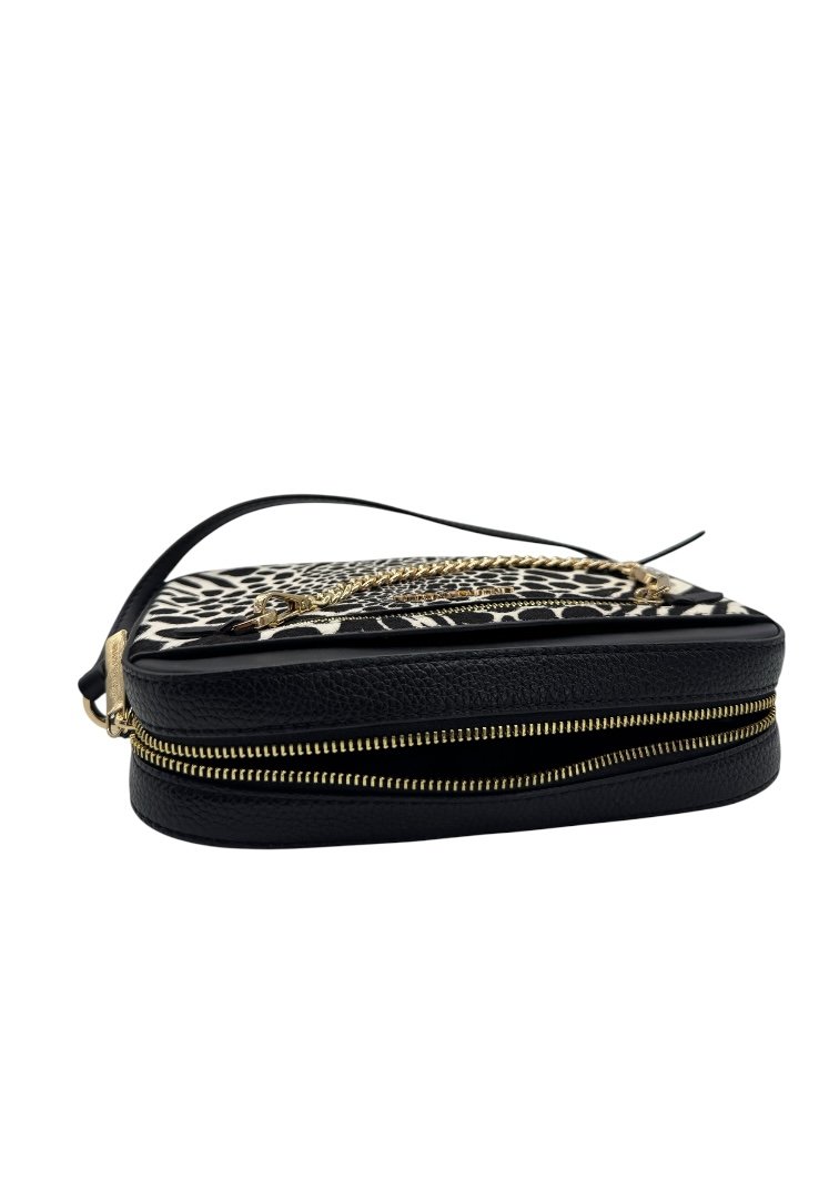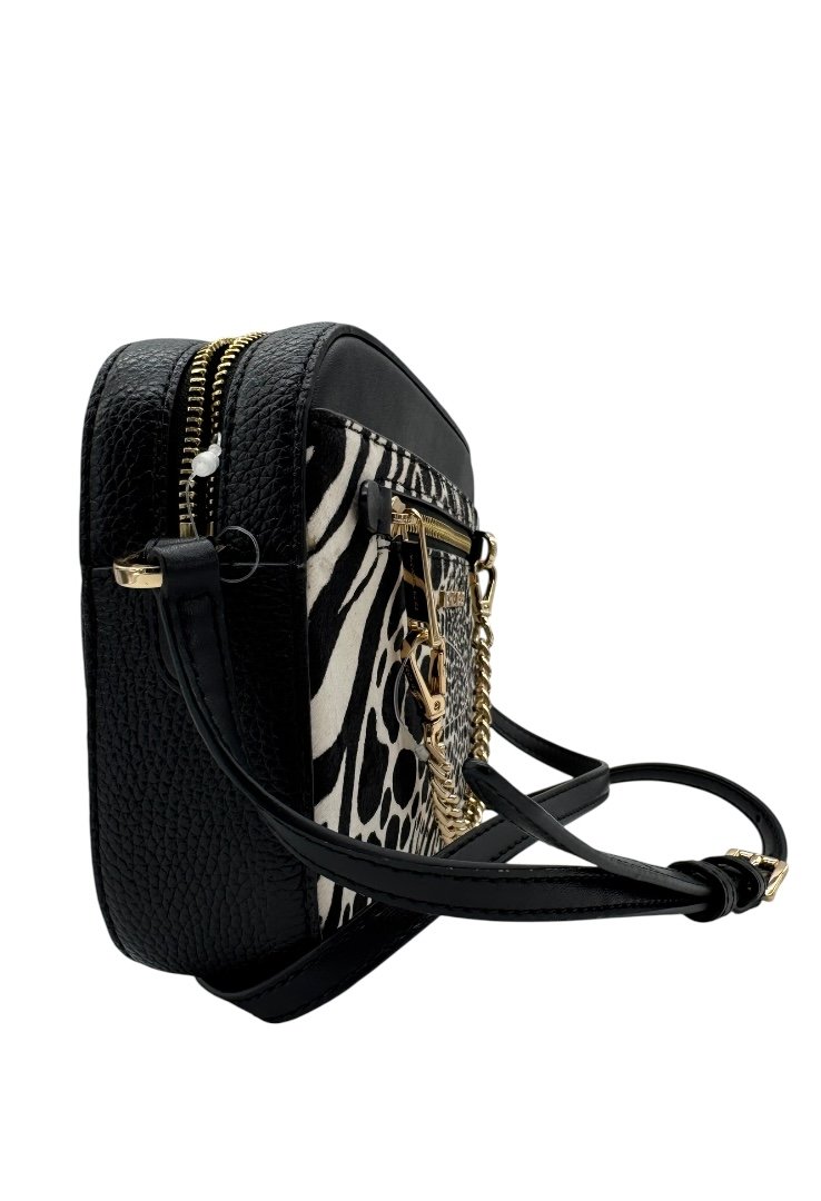 Bolso elaborada de piel saffiano, apliques en dorado, parte frontal con diseño animal print, detalle de cadena.