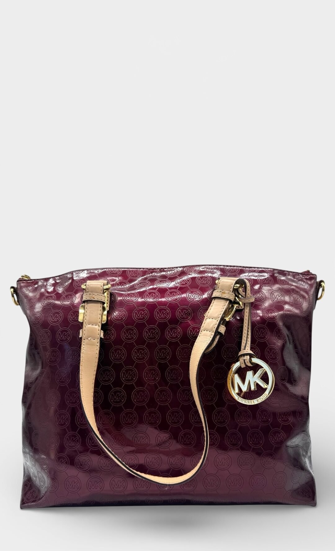 Bolso elaborado en lona con acabado en charol, herrajes en dorado, compartimento principal con zipper, asas elaboradas en cuero.