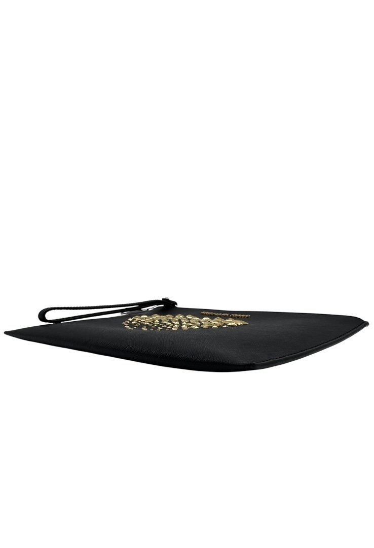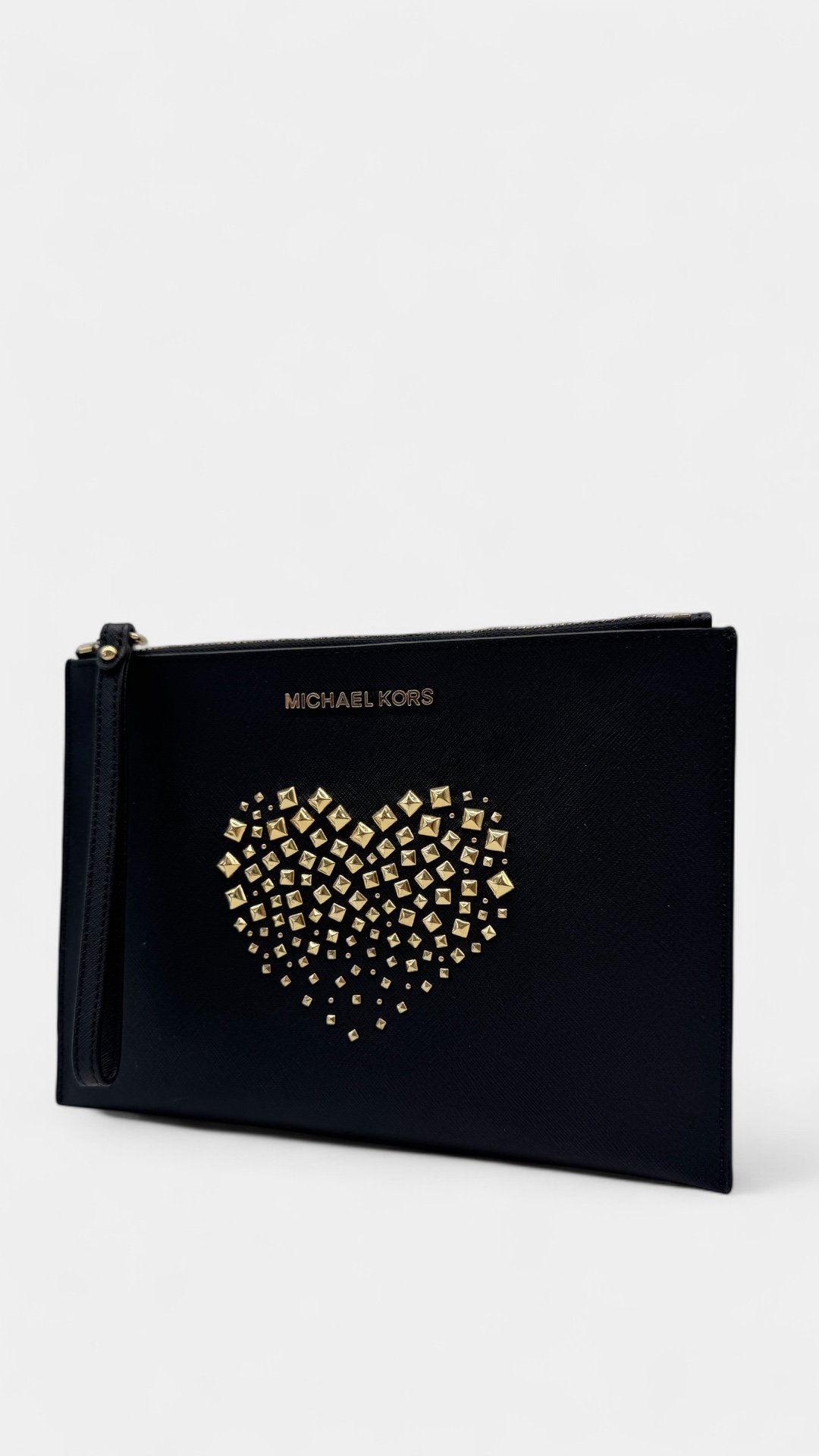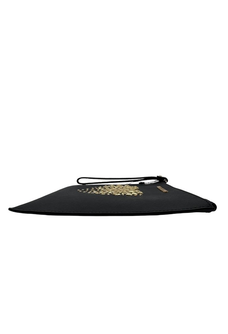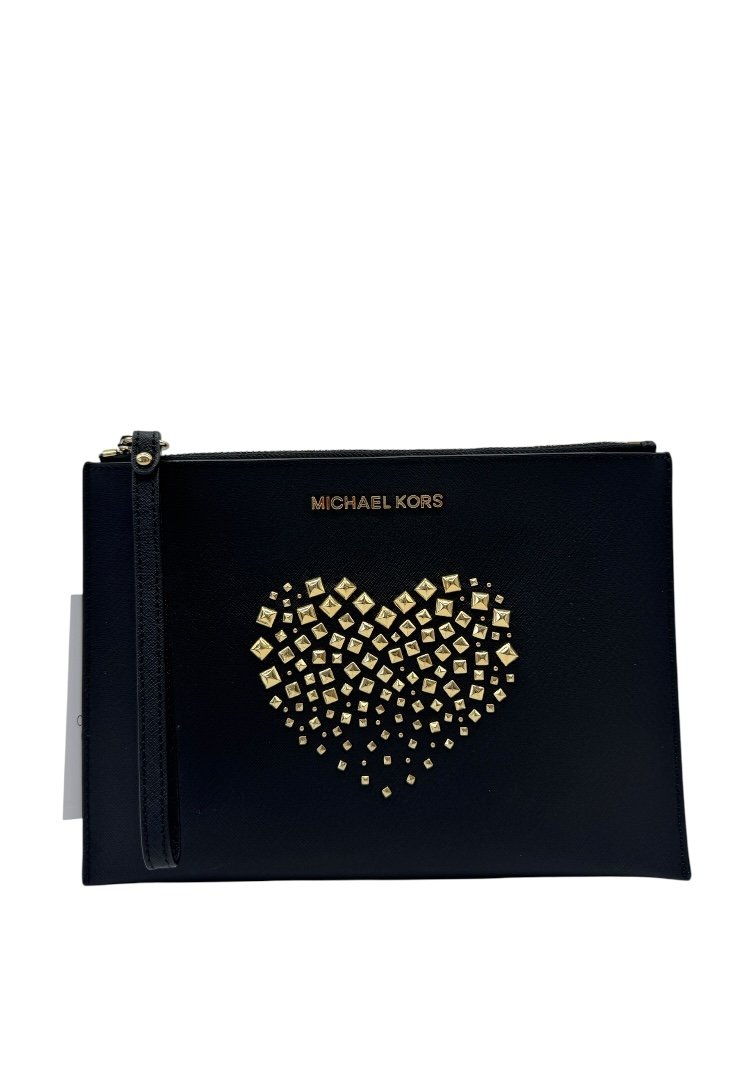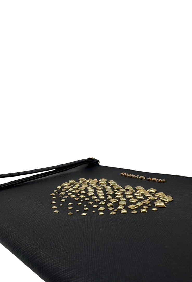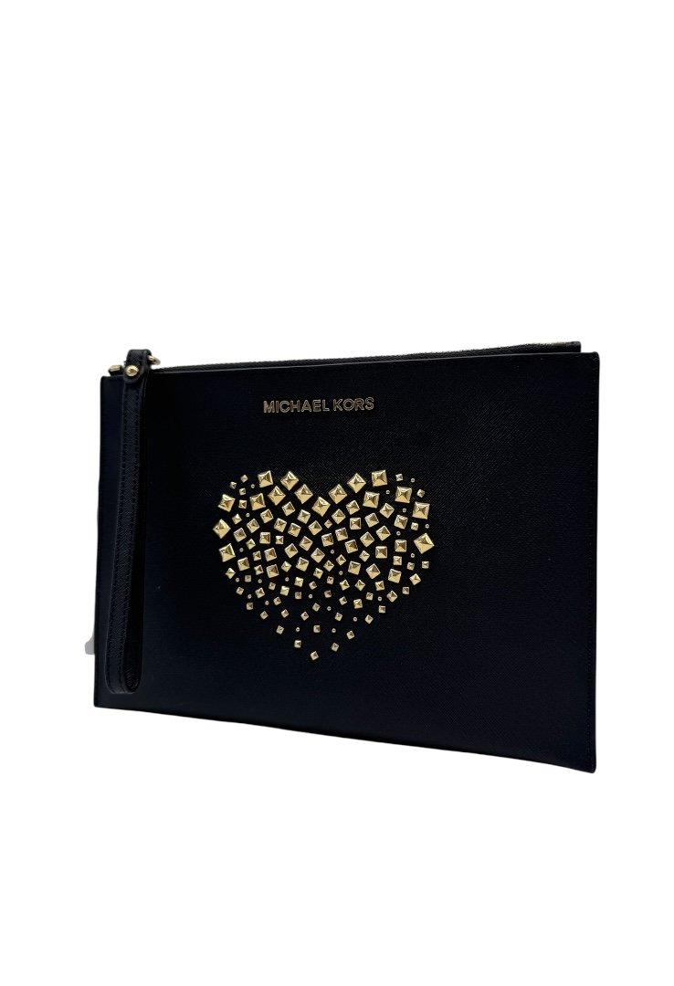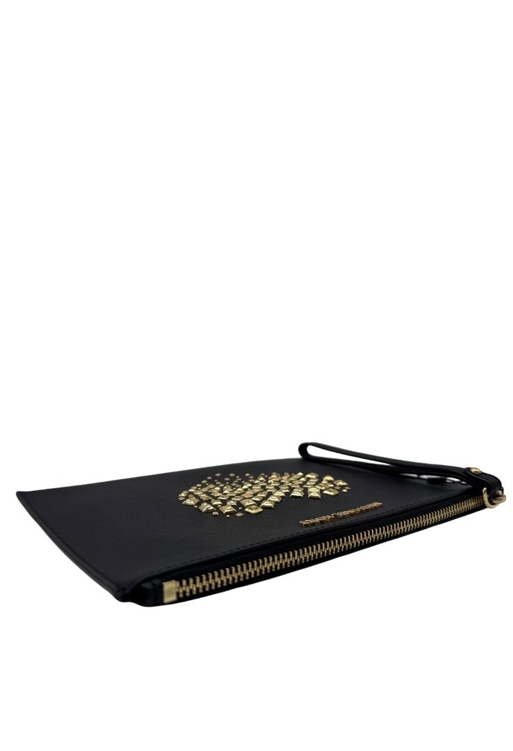 Clutch elaborado en piel sintética con diseño de estoperoles formando un corazón, apliques en dorado, asa para la muñeca.