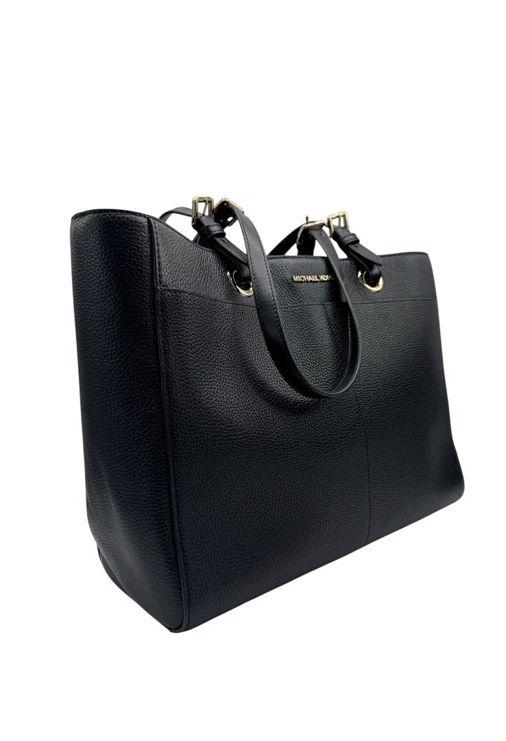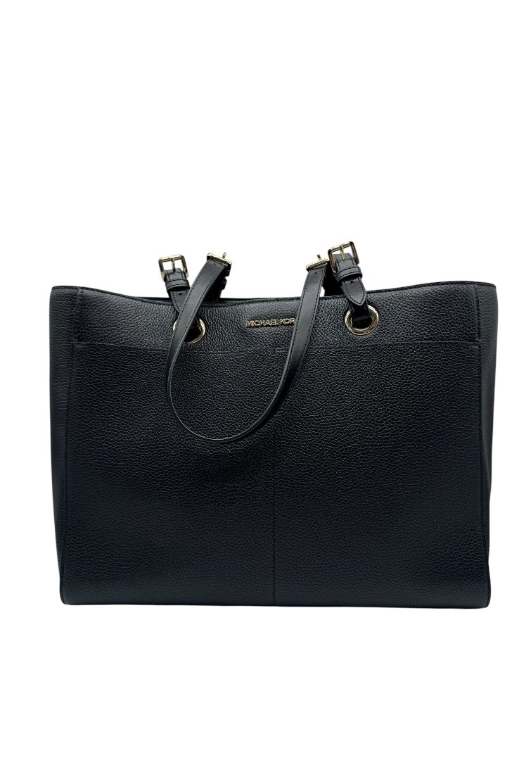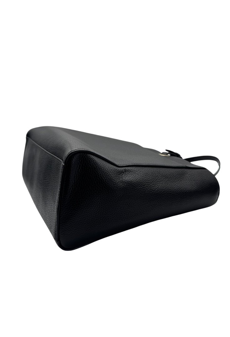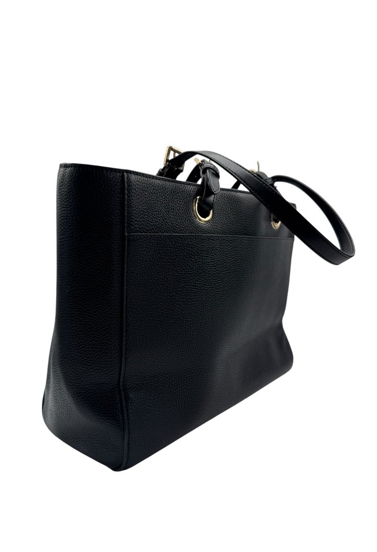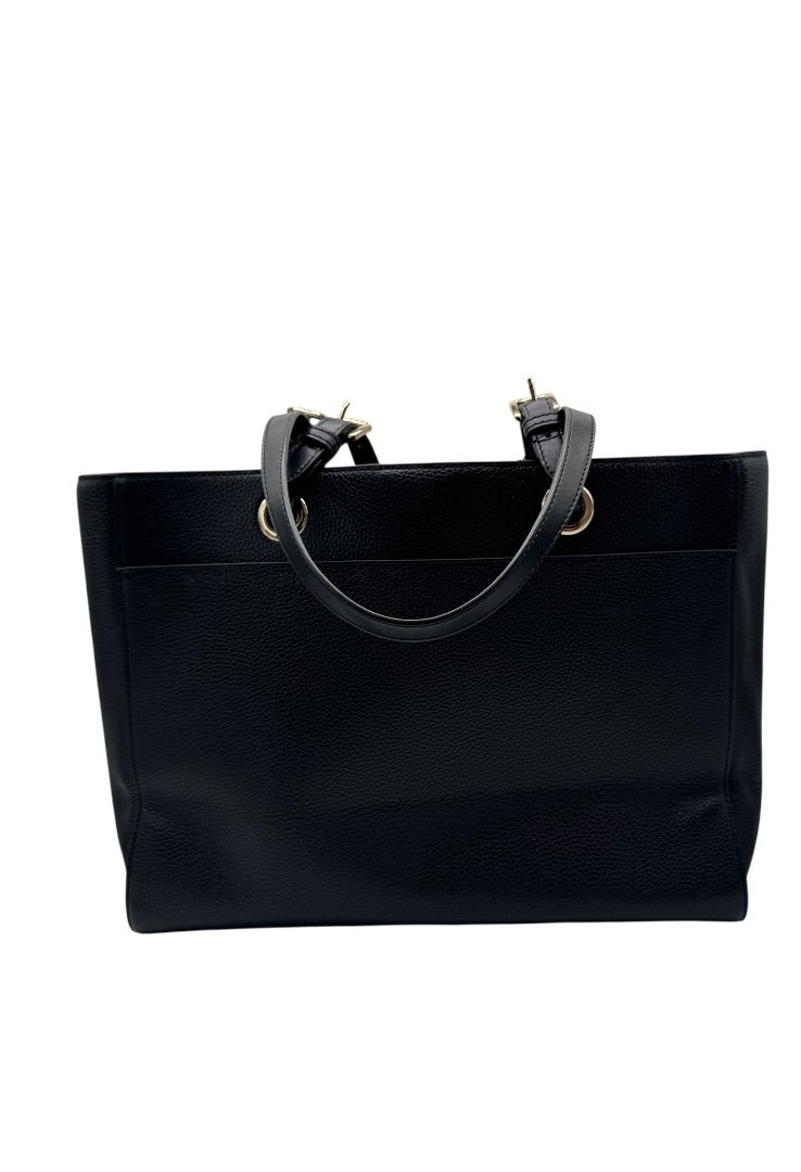Bolso elaborado en cuero granulado, apliques en dorado, multiples compartimentos internos y exteriores.