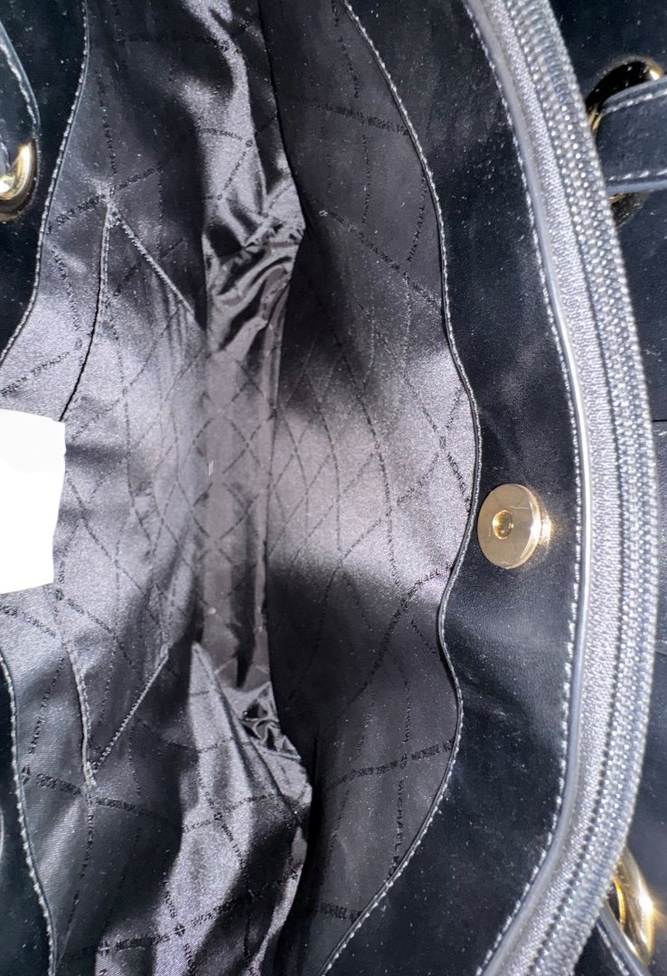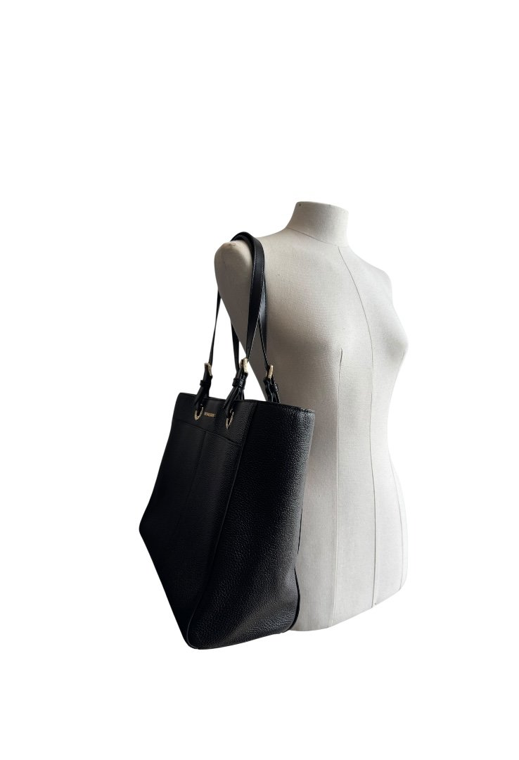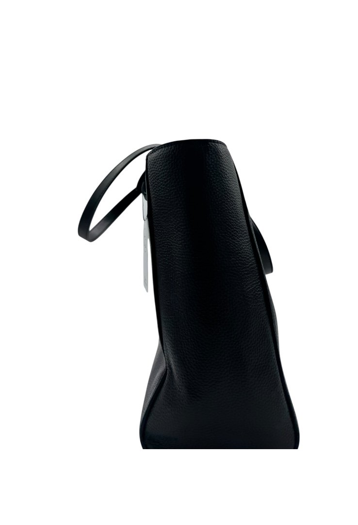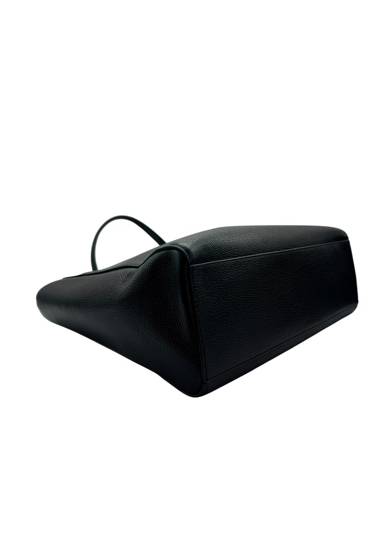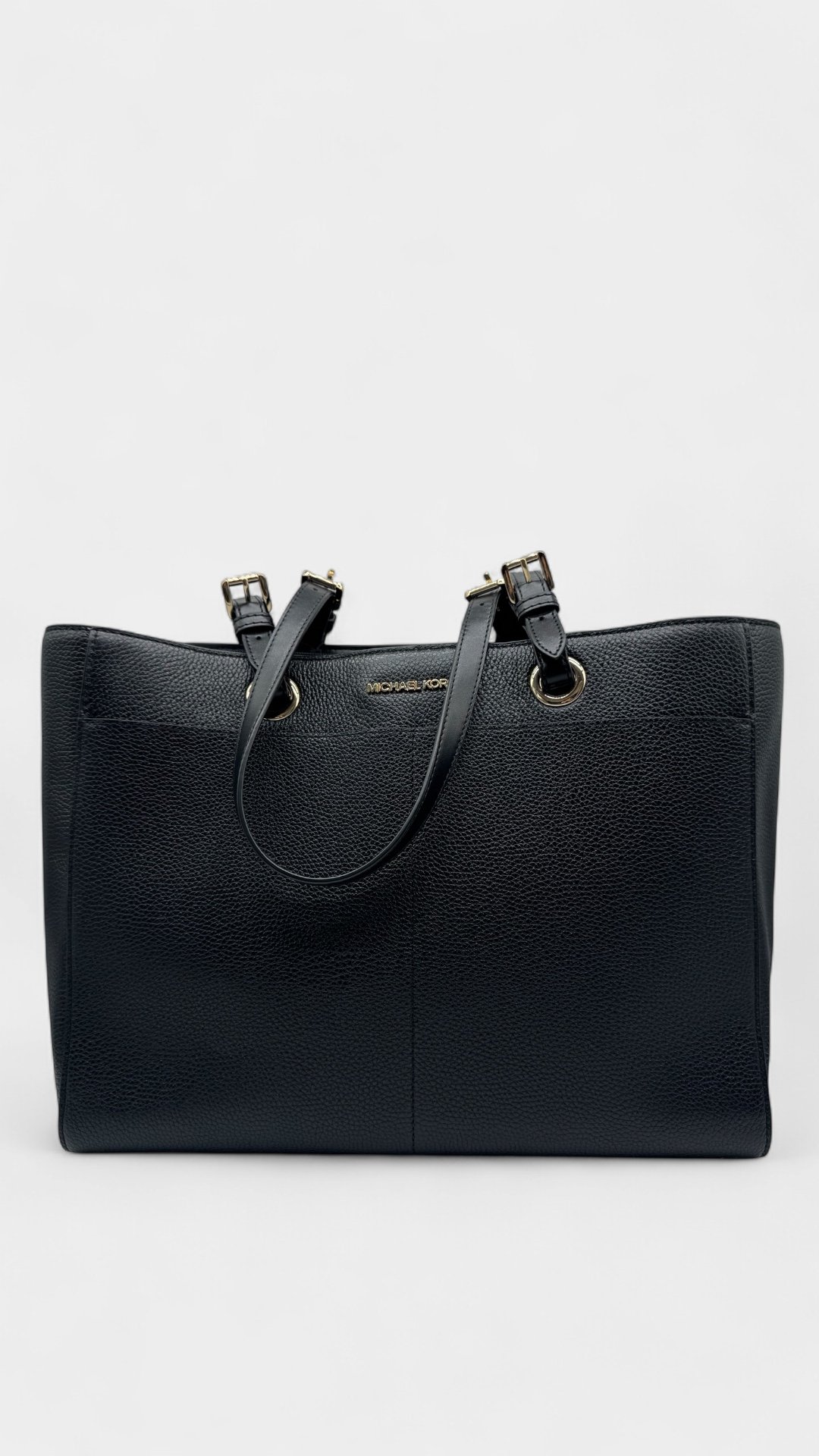 Bolso elaborado en cuero granulado, apliques en dorado, multiples compartimentos internos y exteriores.